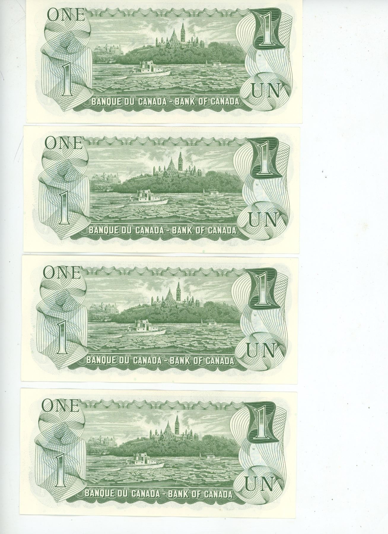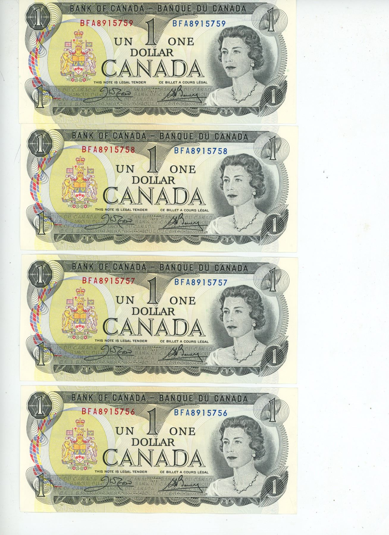 4 - 1973 Canadian 1 dollar bills - Consecutive #'s - Crow/Bouey - BFA 8915756-59