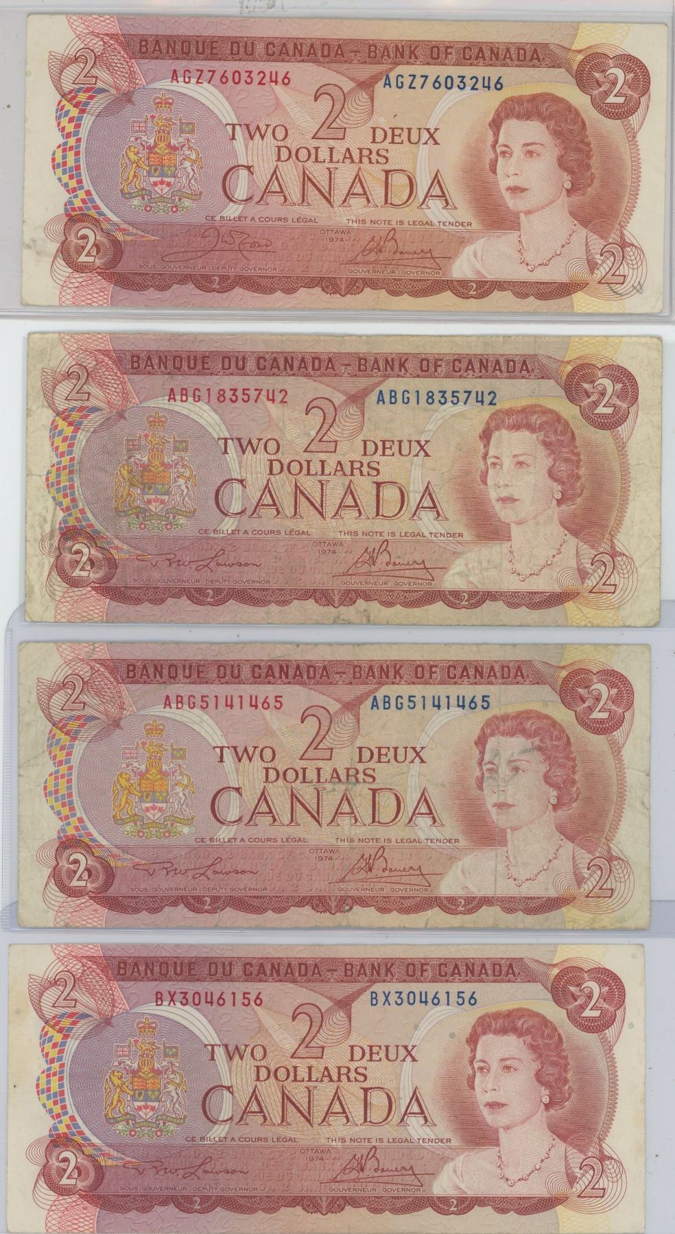 4× 1974 $2 Bills (AGZ7603246, BX3046156, ABG1835742, ABG5141465)