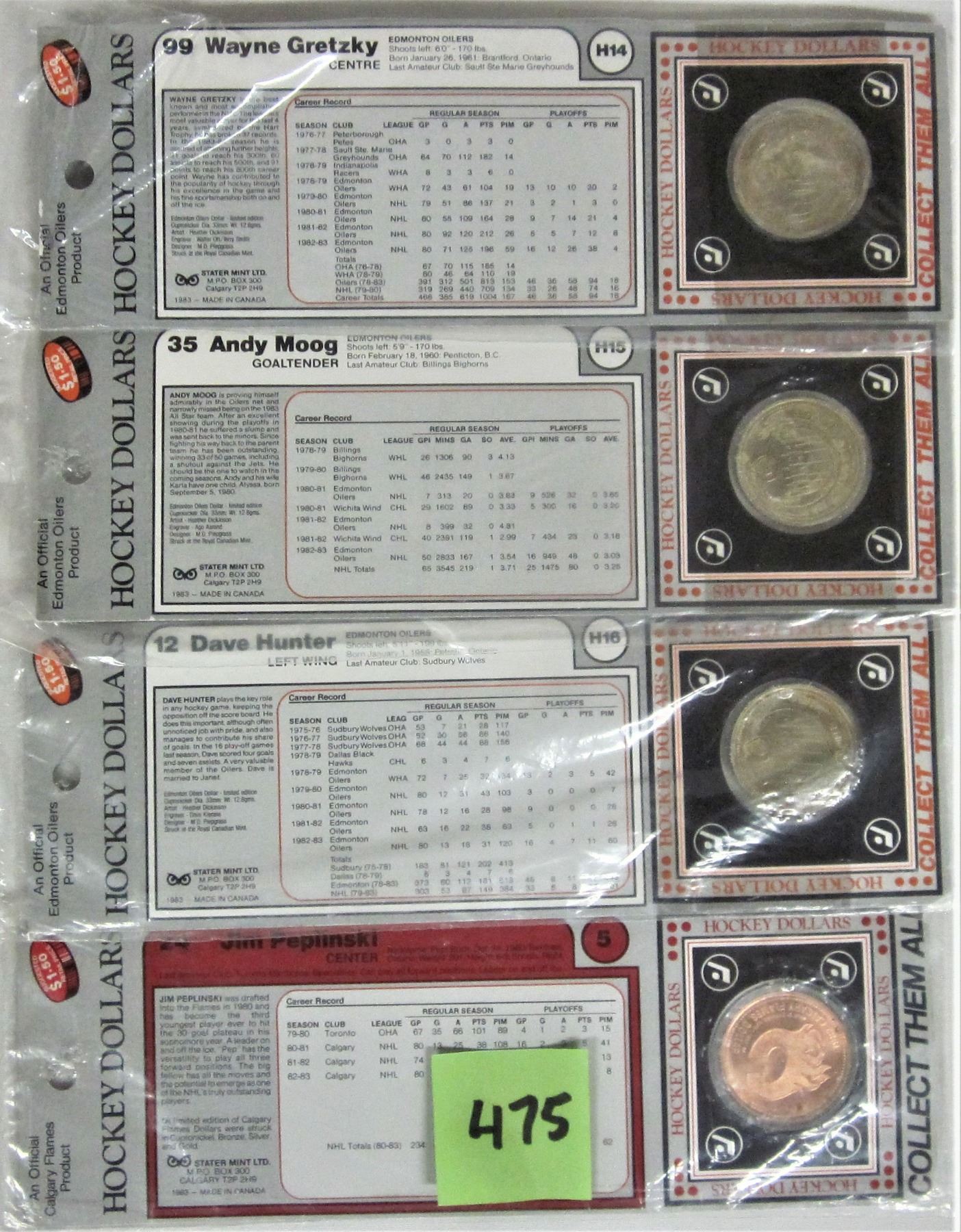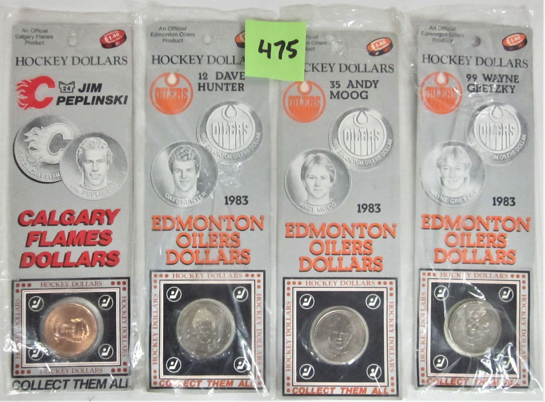 4 1983 Hockey Dollars New Sealed Cgy, #24 Peplinski, #35 Moog, #12 Hunter, #99 Gretzky