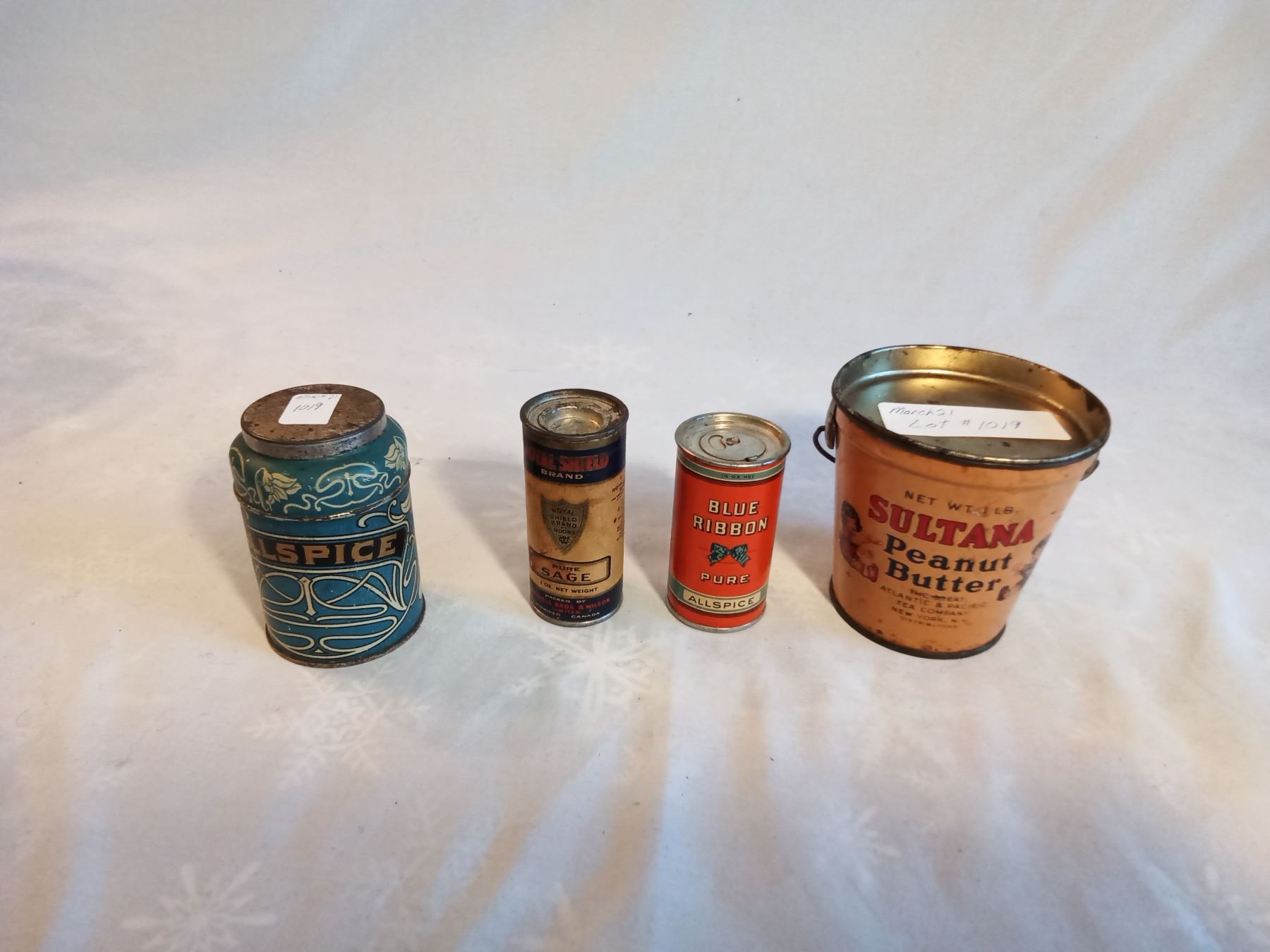 4 Antique Spice Cans and 1 Peanut Butter Can.