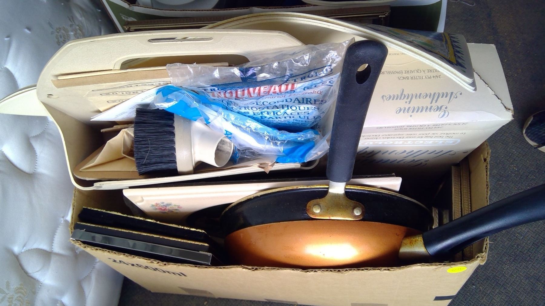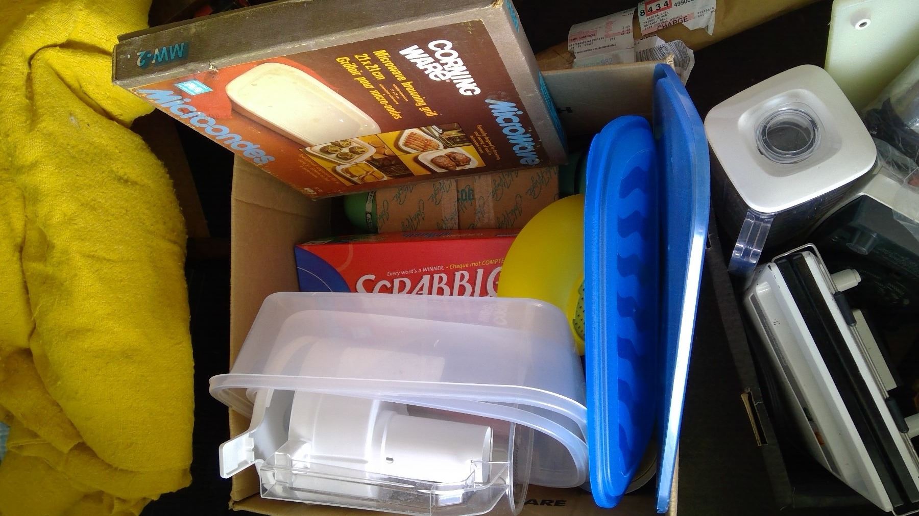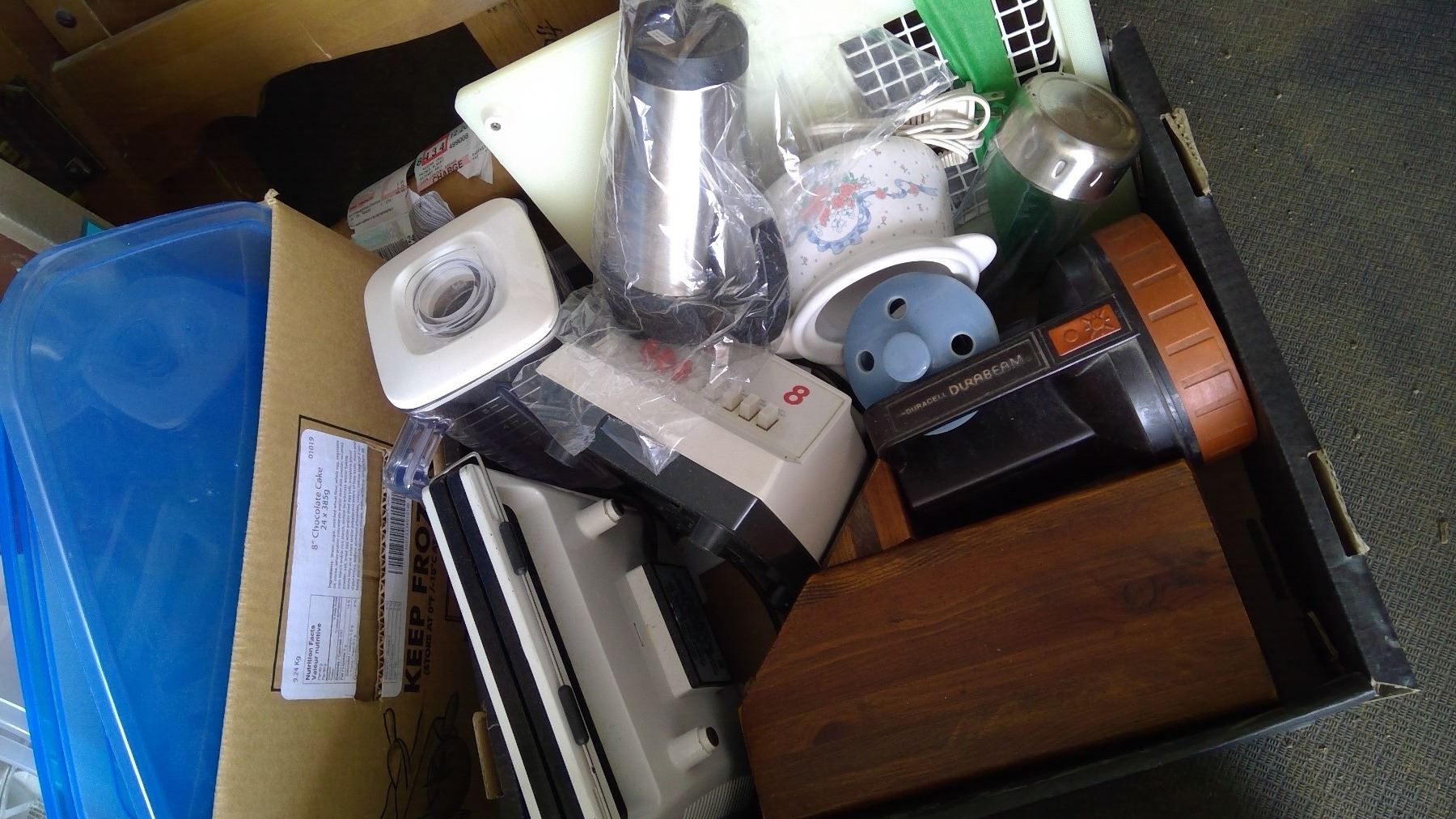 Contains picture frames, dinner mats, vacuum accessories, ash trays, kitchen utensils, vaporizer, 2 alarm clocks, coffee maker, cooler, juice mixer, sandwich maker, microwave browning grill, tupperware, and more! Located at Schmalz Auctions