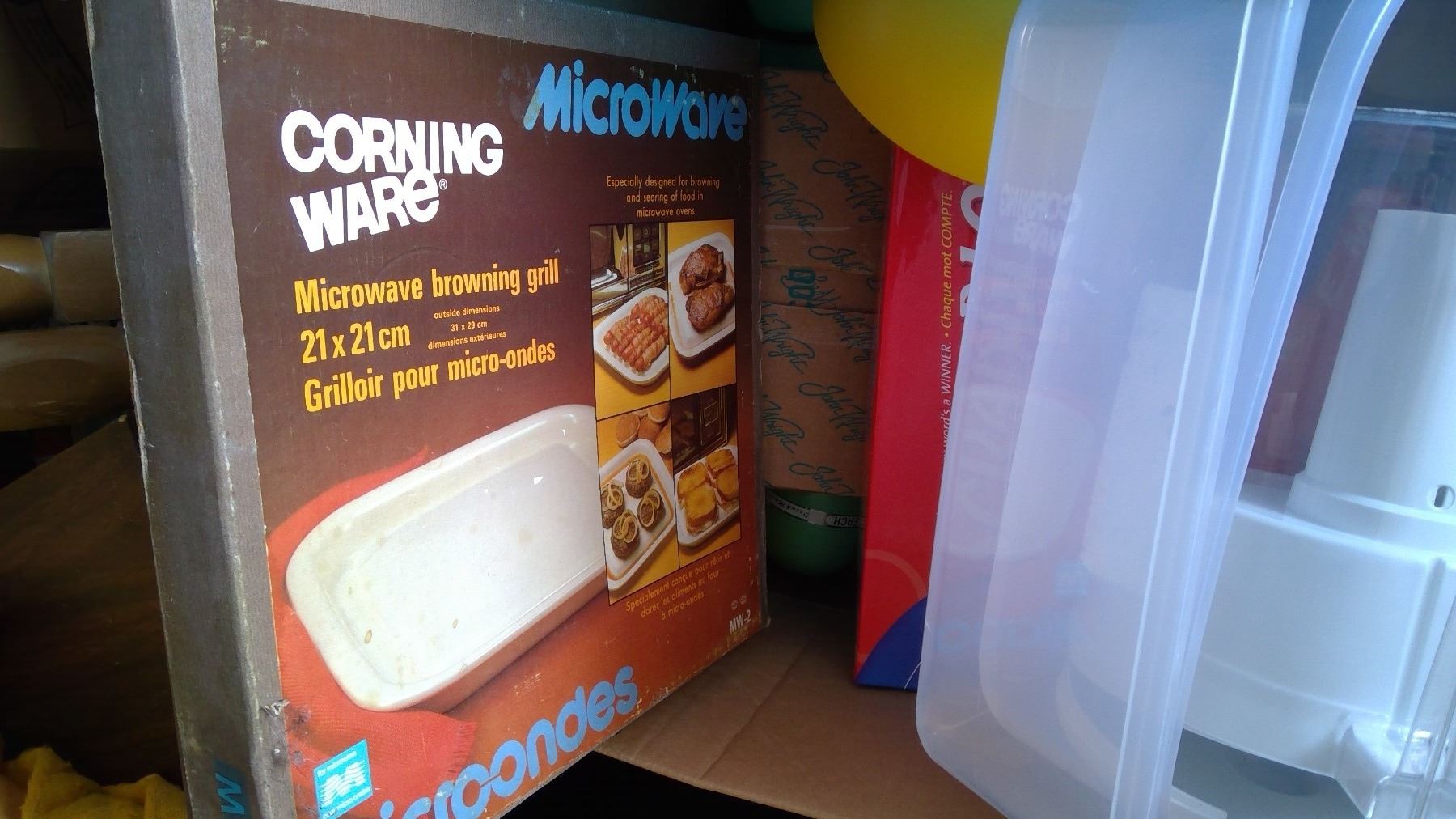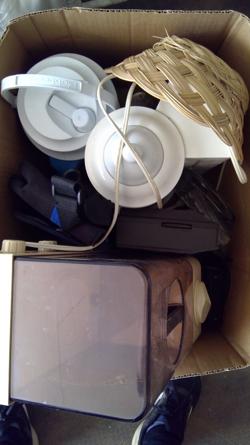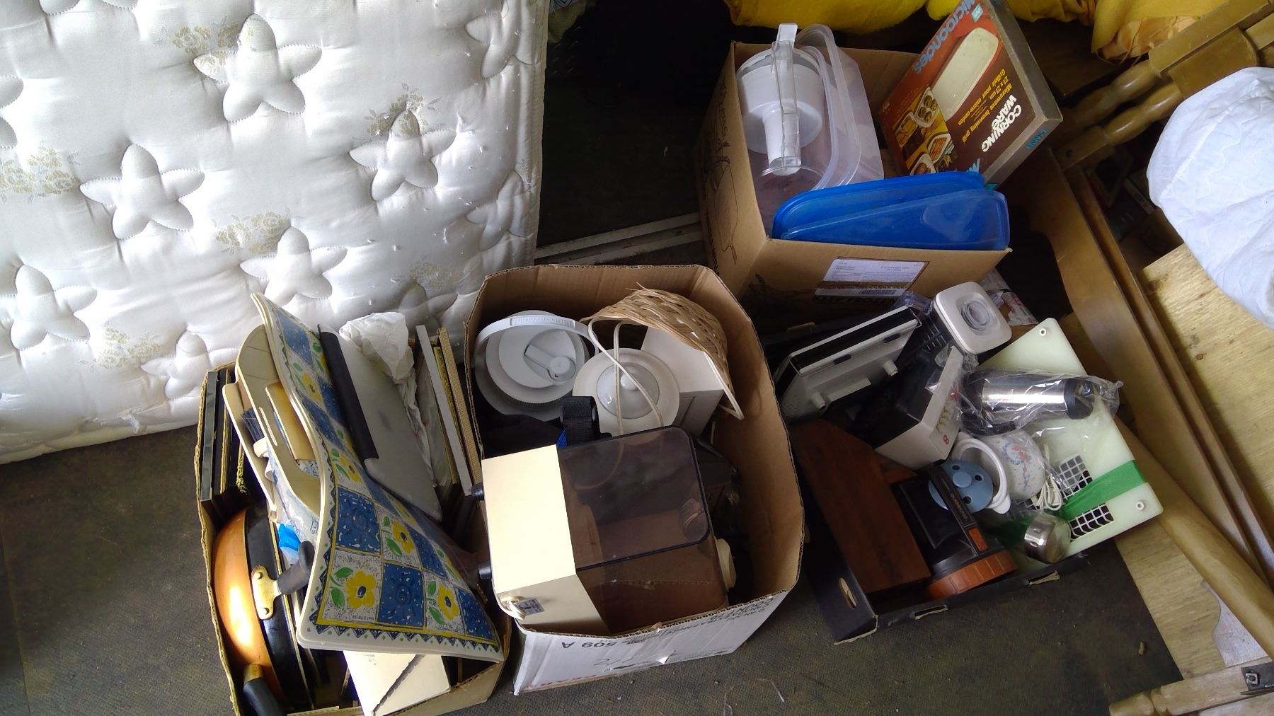 Contains picture frames, dinner mats, vacuum accessories, ash trays, kitchen utensils, vaporizer, 2 alarm clocks, coffee maker, cooler, juice mixer, sandwich maker, microwave browning grill, tupperware, and more! Located at Schmalz Auctions