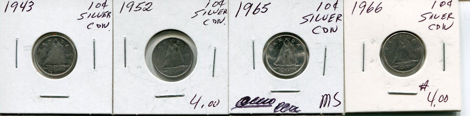 4 CNDN SILVER DIMES 1943, 52, 65, 66