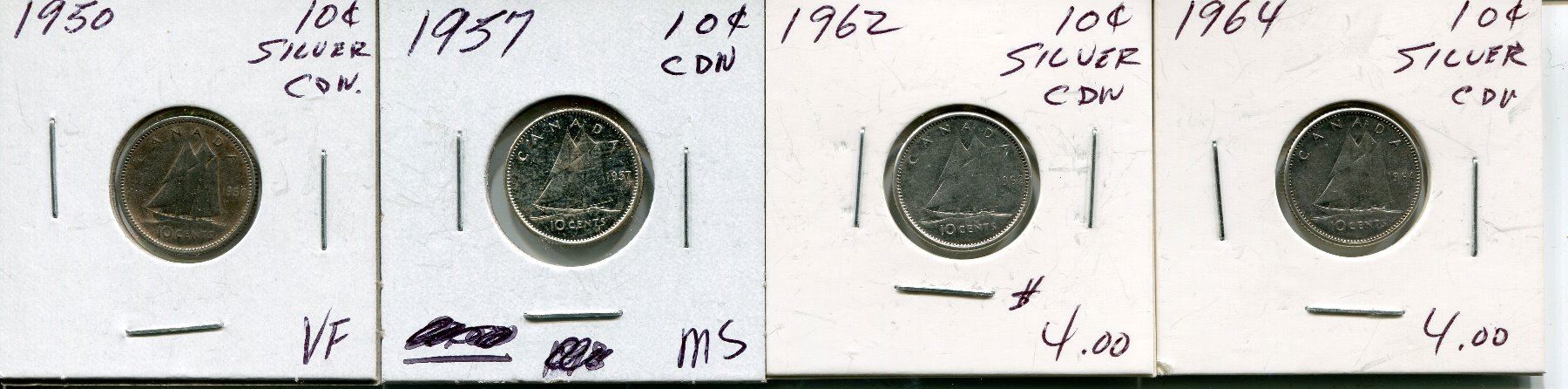 4 CNDN SILVER DIMES 1950, 57, 62, 64