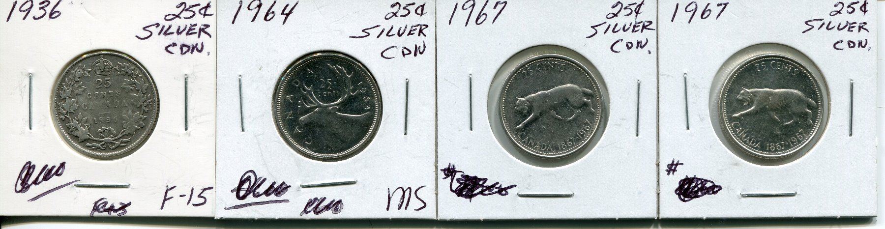 4 CNDN SILVER QUARTERS 1936, 1964, 2 - 1967