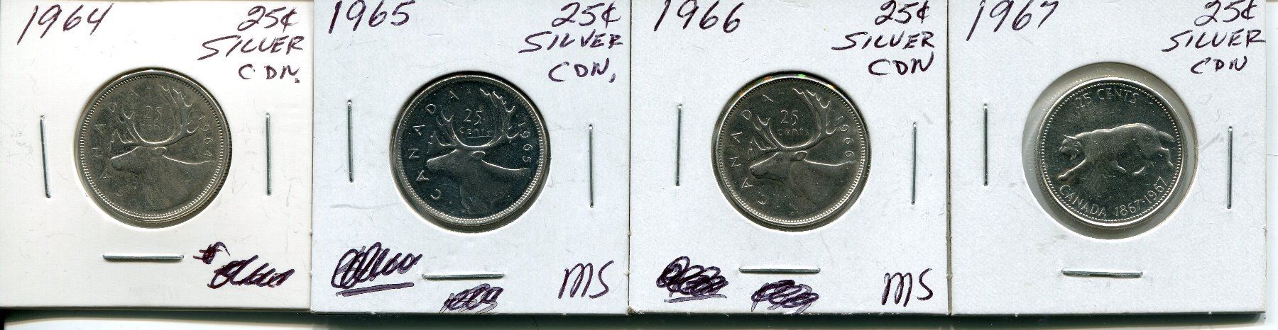 4 CNDN SILVER QUARTERS 1964, 1965, 1966, 1967