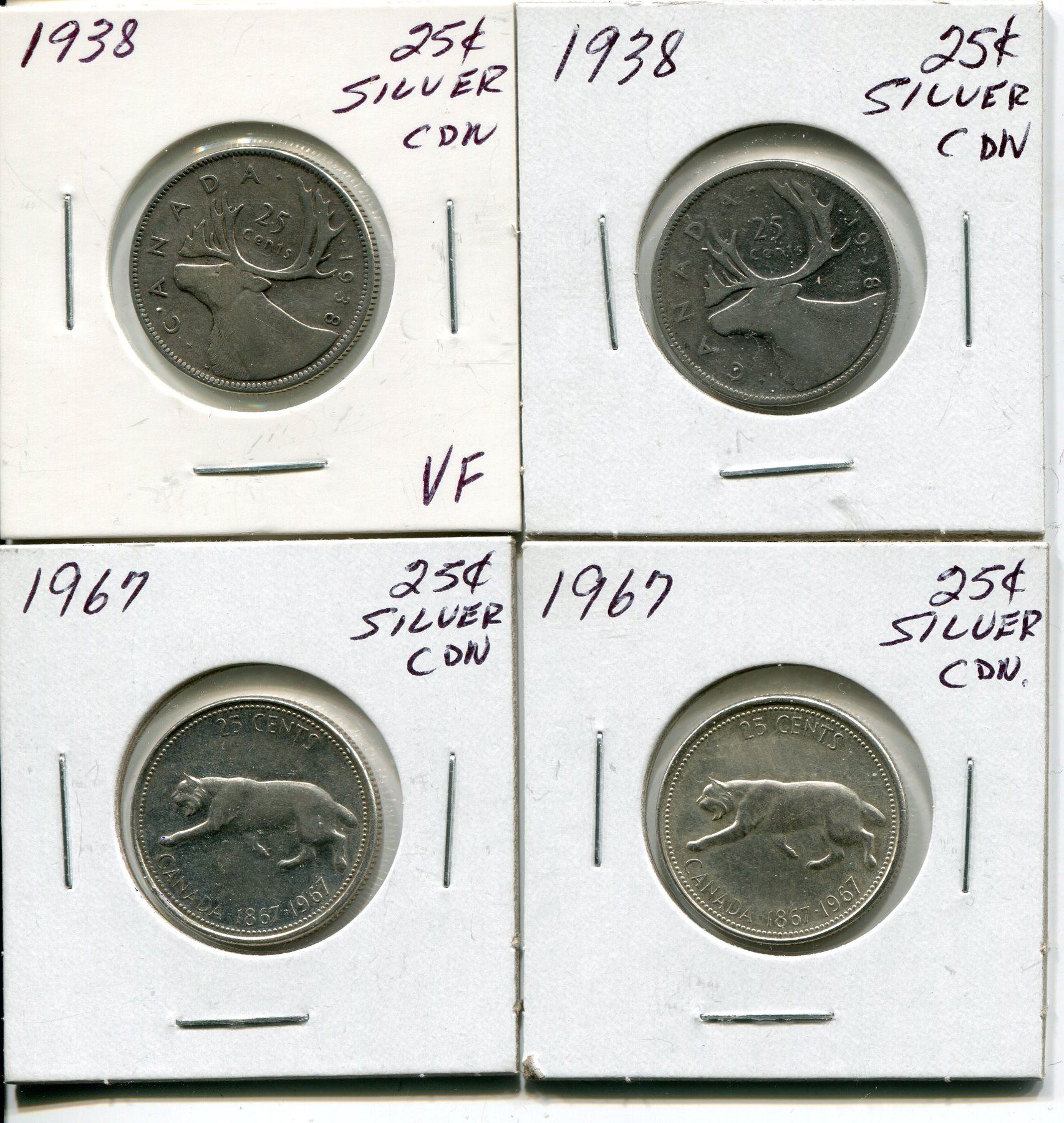 4 CNDN SILVER QUARTERS 2 - 1938, 2 - 1967
