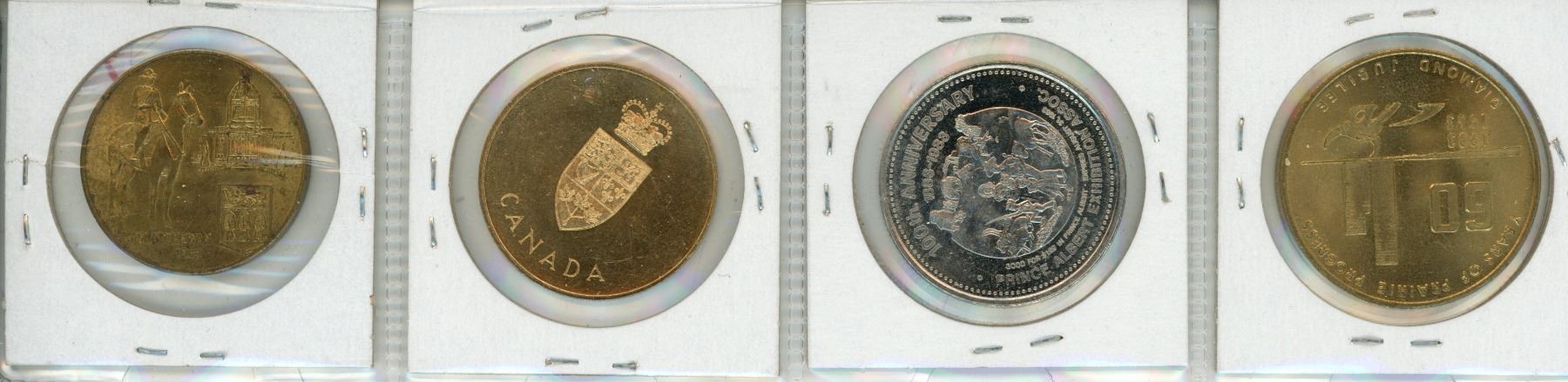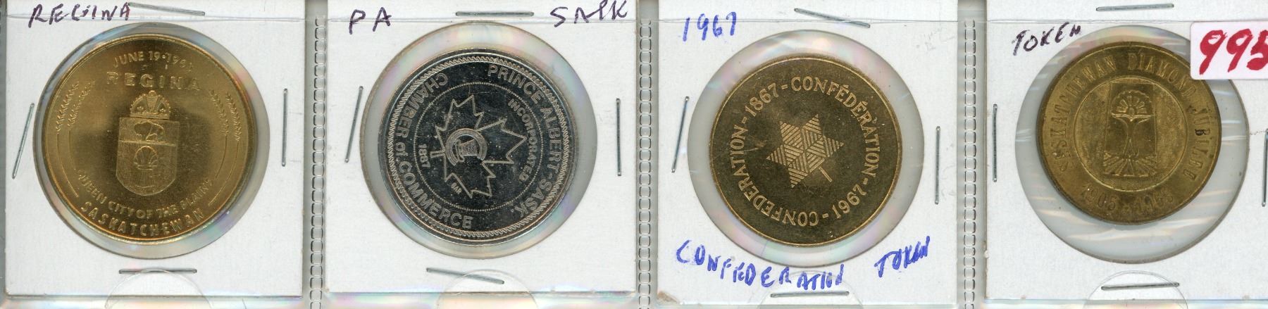 4 Canada tokens: Regina Diamond Jubilee, P.A. Sask, 1967 Confederation, Sask Diamond Jubilee