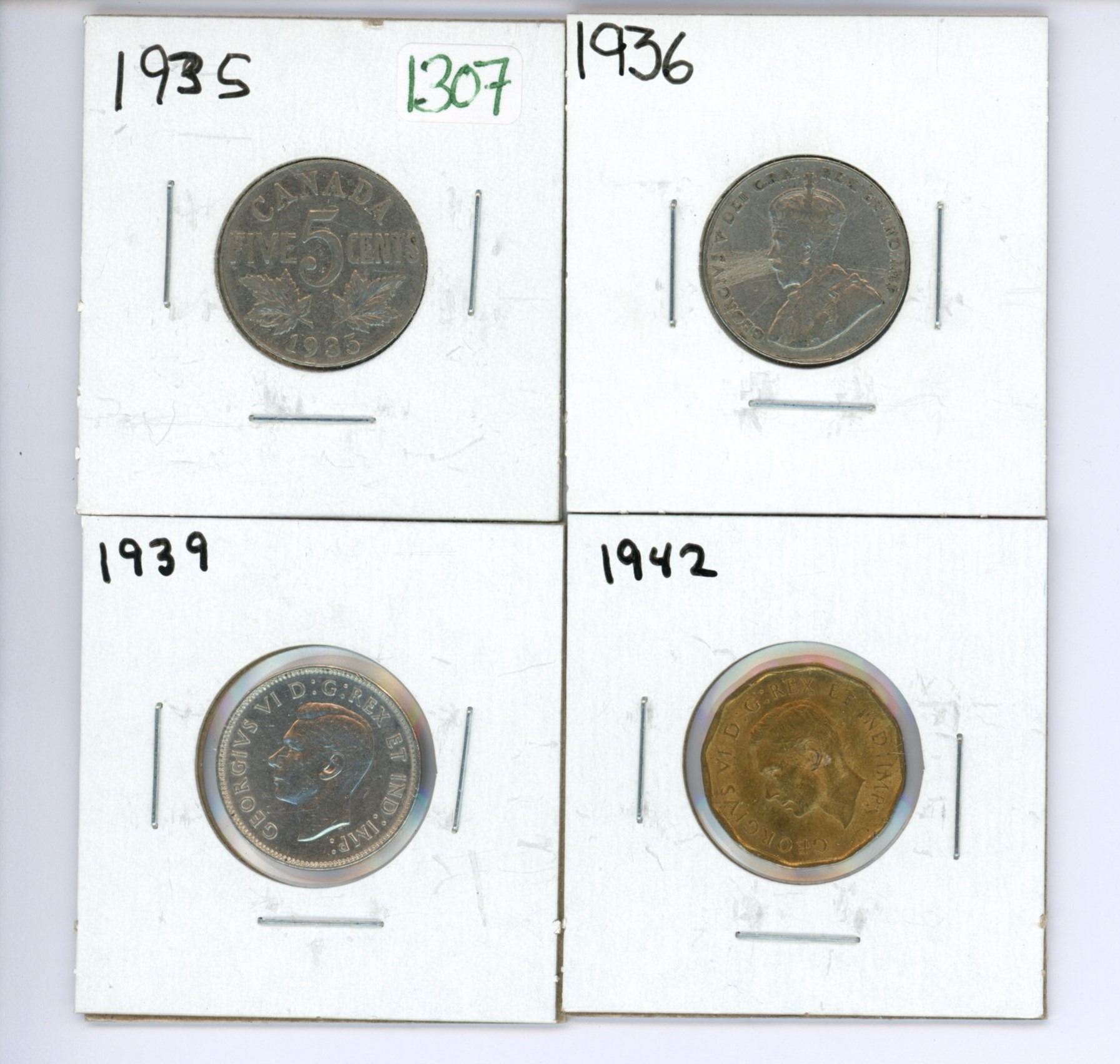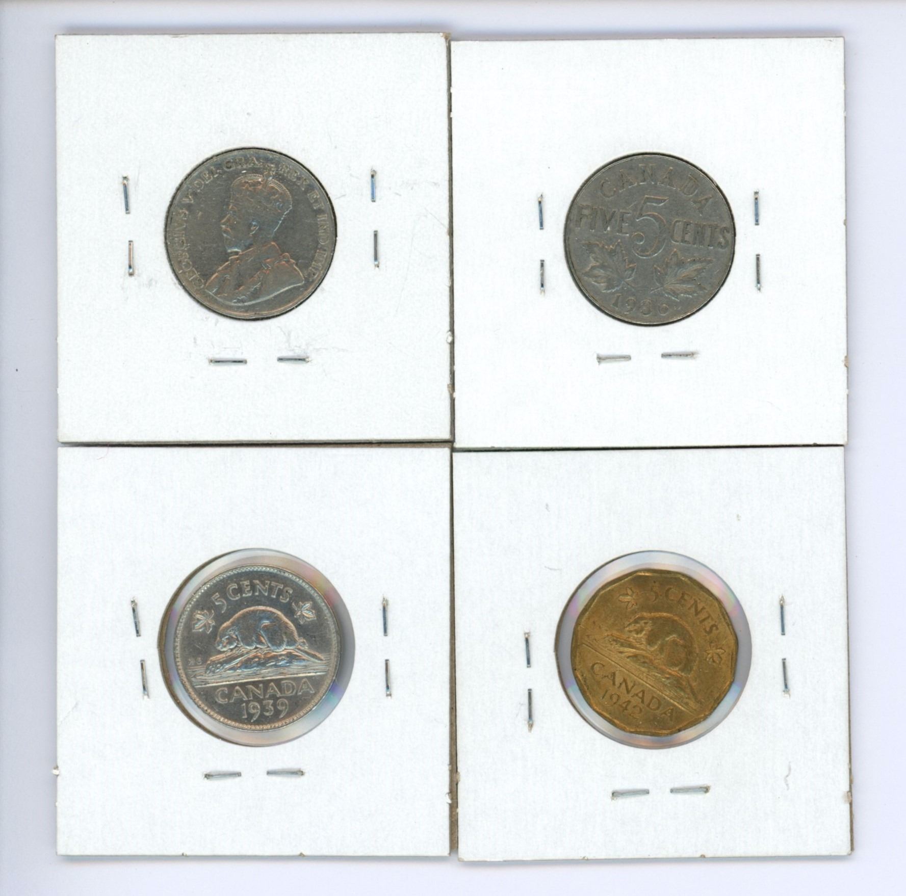 4 Canadian 5 cent coins - 1935-1936, 1939, 1942