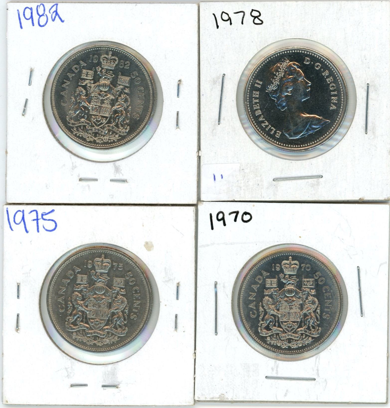 4 Canadian 50 cent pieces, 1978, 1970, 1982, 1975