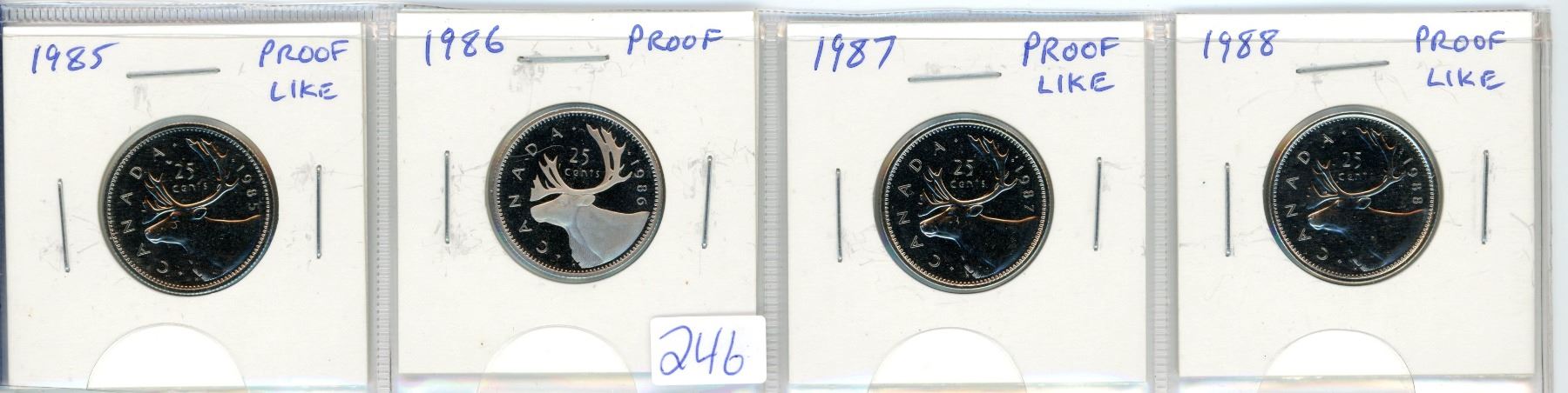 4 Canadian proof like quarters - 1985, 1986, 1987, 1988