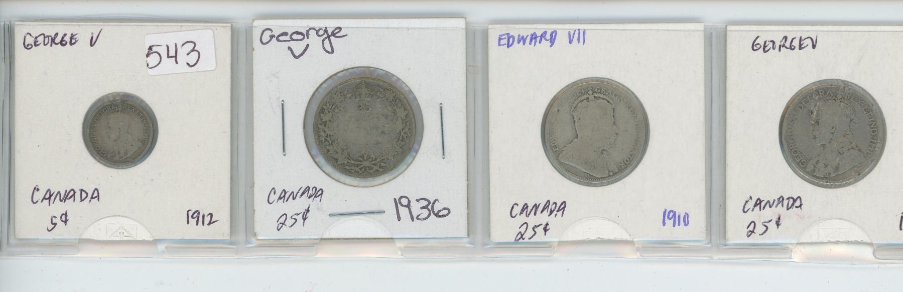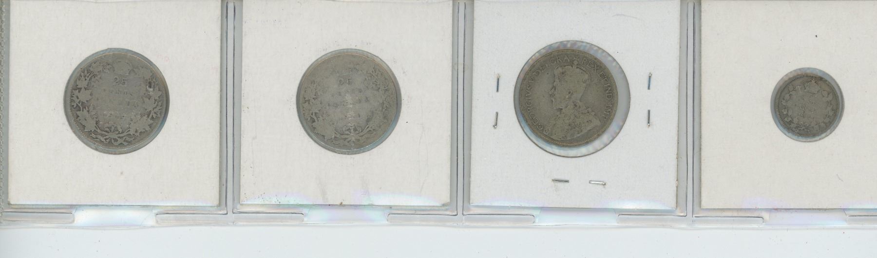 4-Canadian silver coins (1912-5cent piece) (1910-1913 & 1936 - 25 cent pieces),4-silver coins