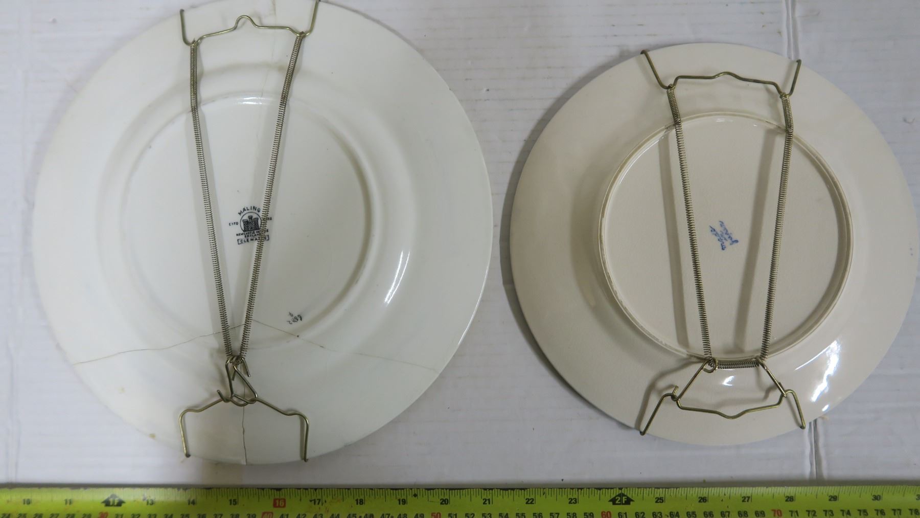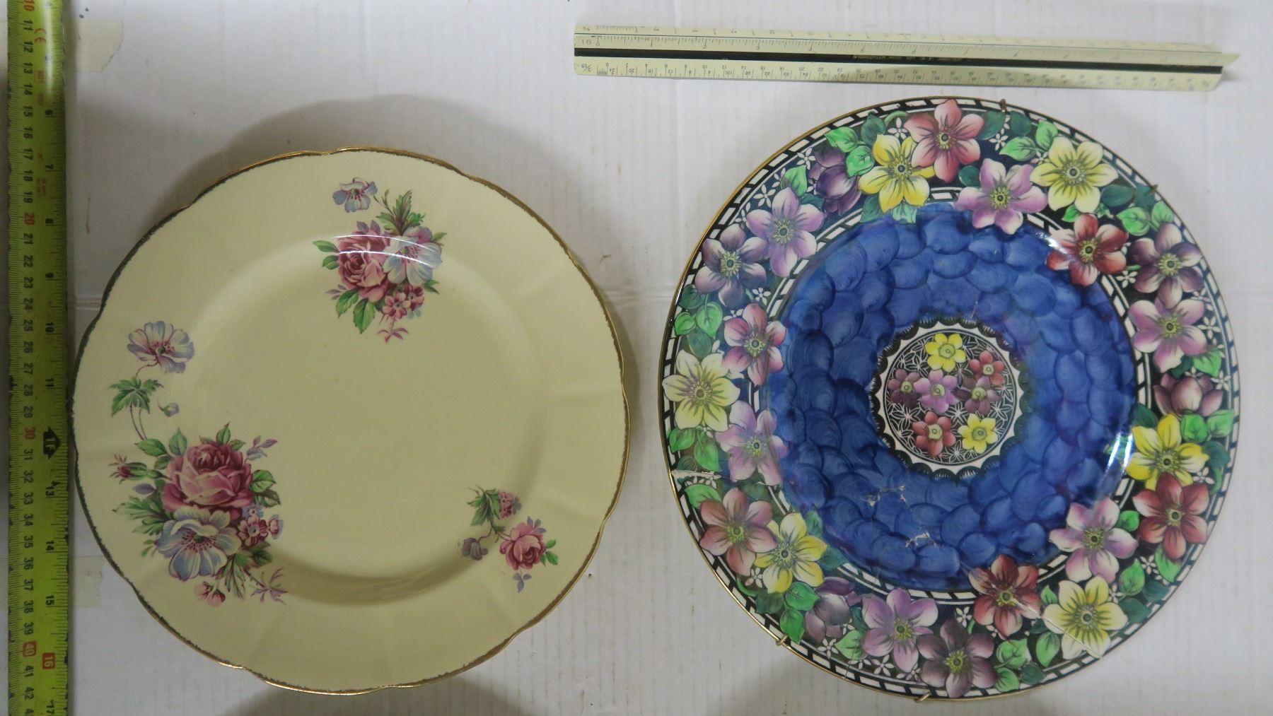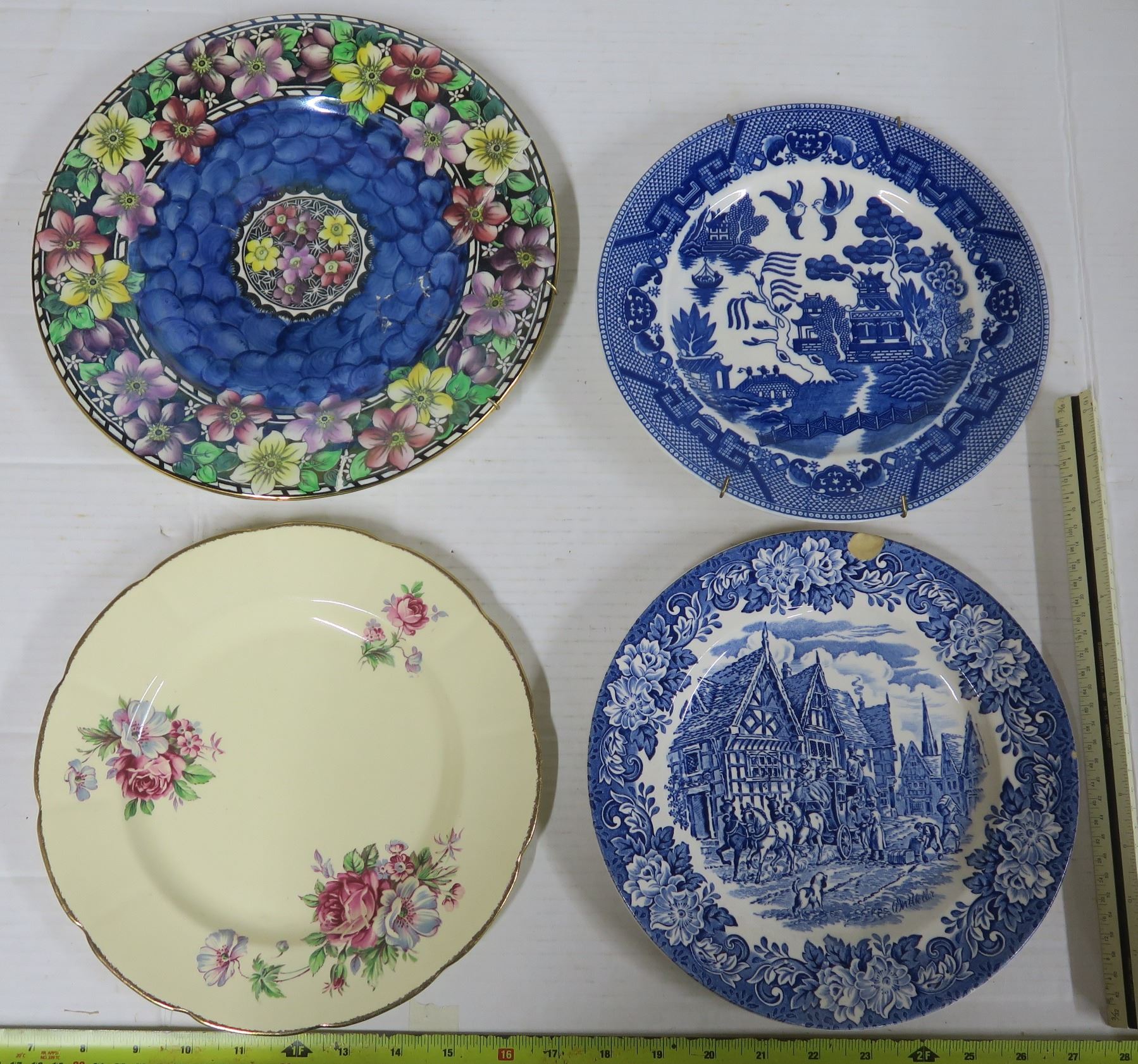 4 Decorative plates - stall Oro shire plate (chipped), Rose with Gold trim (English plate), Repaired flower medallion, Blue plate (chipped)