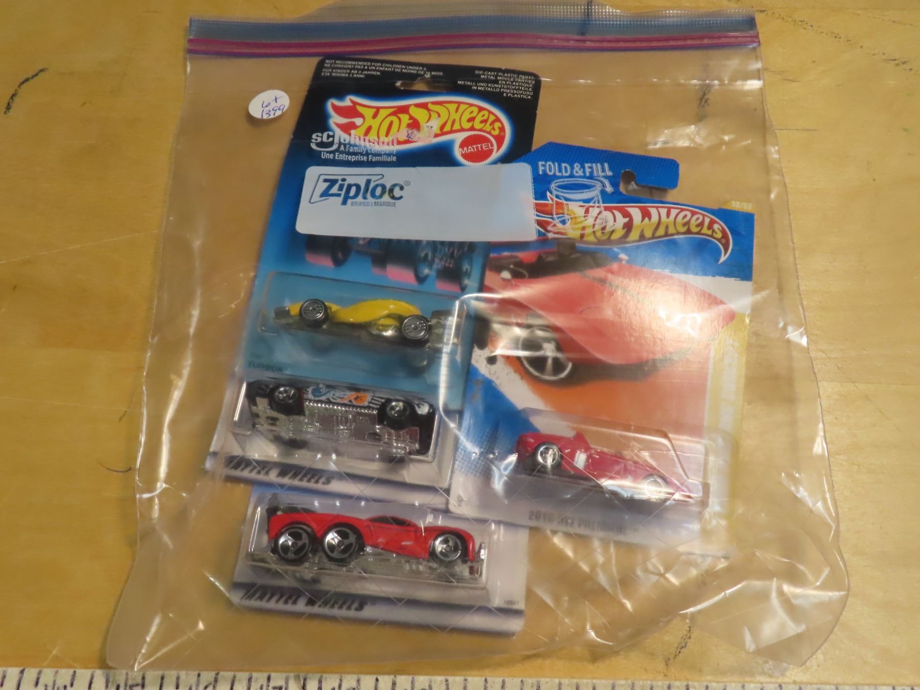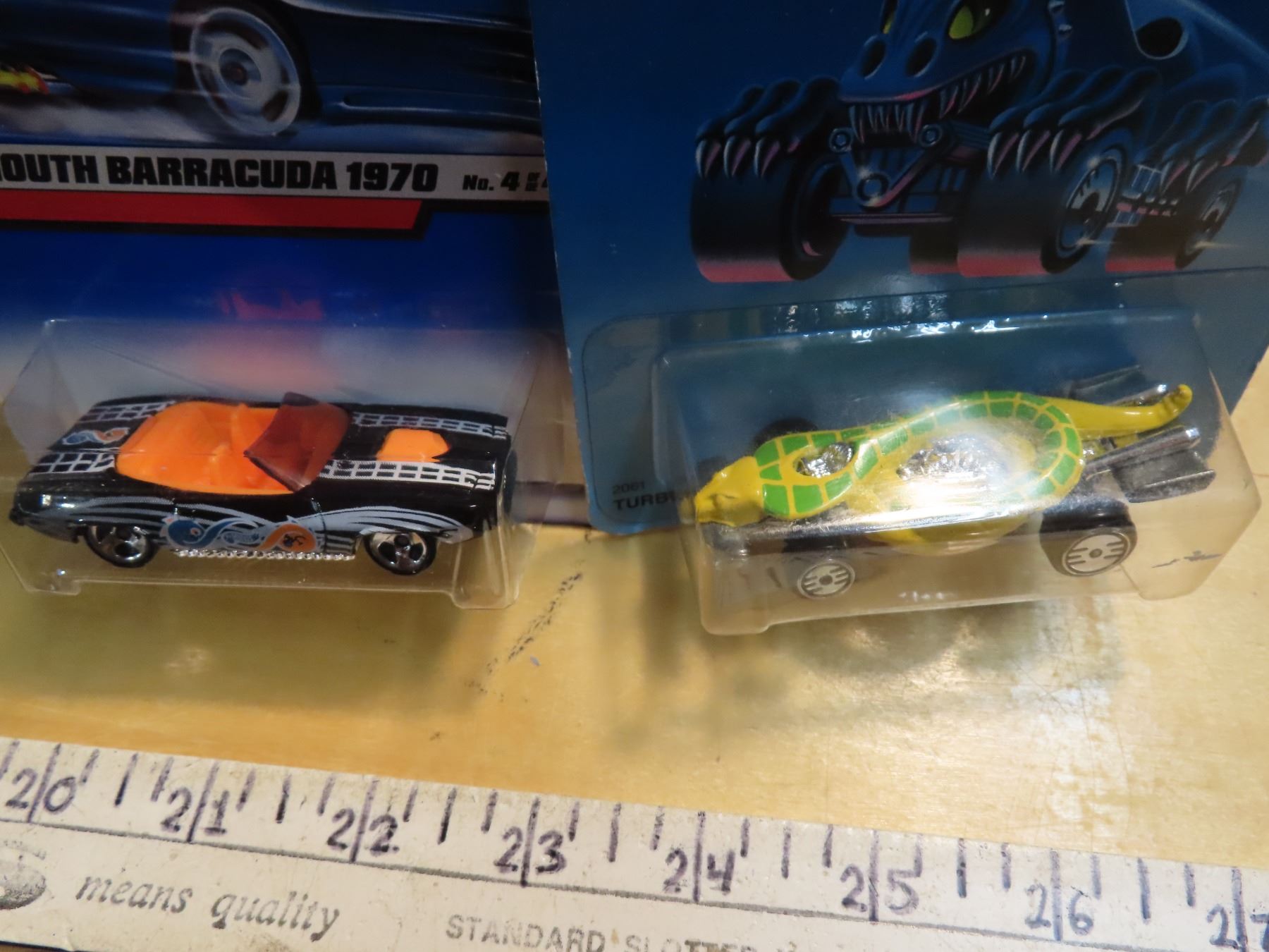 4 Hot wheels cars in original packaging 1986 Turboa, 1997 Tow Jam and Barracuda, 2010 Mustang Concept