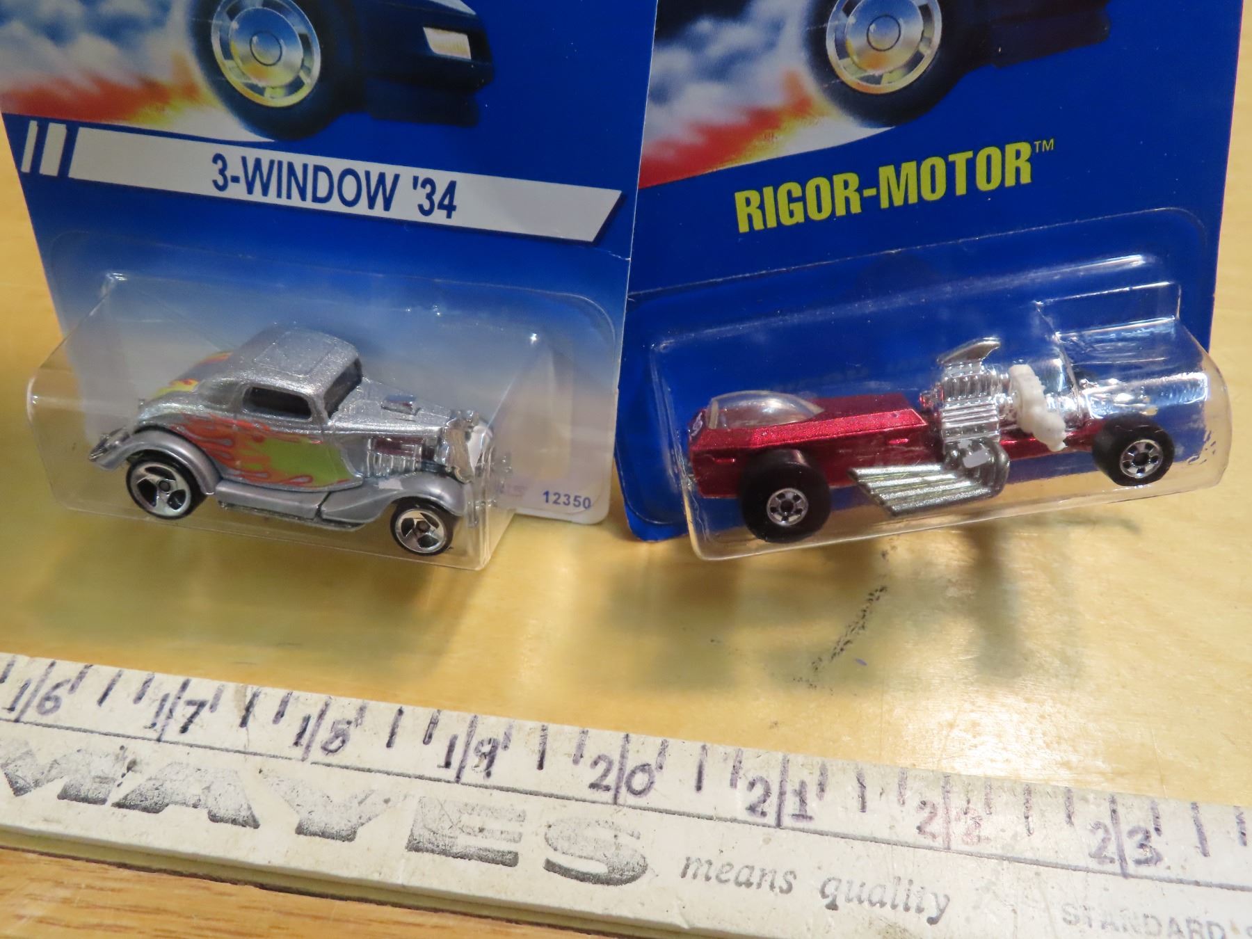 4 Hot wheels cars in original packaging 1994 Rigor-motor , 3 Window 34, 1996 Side splitter #1, 4
