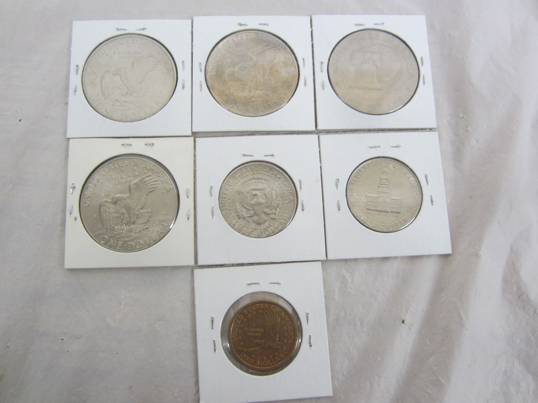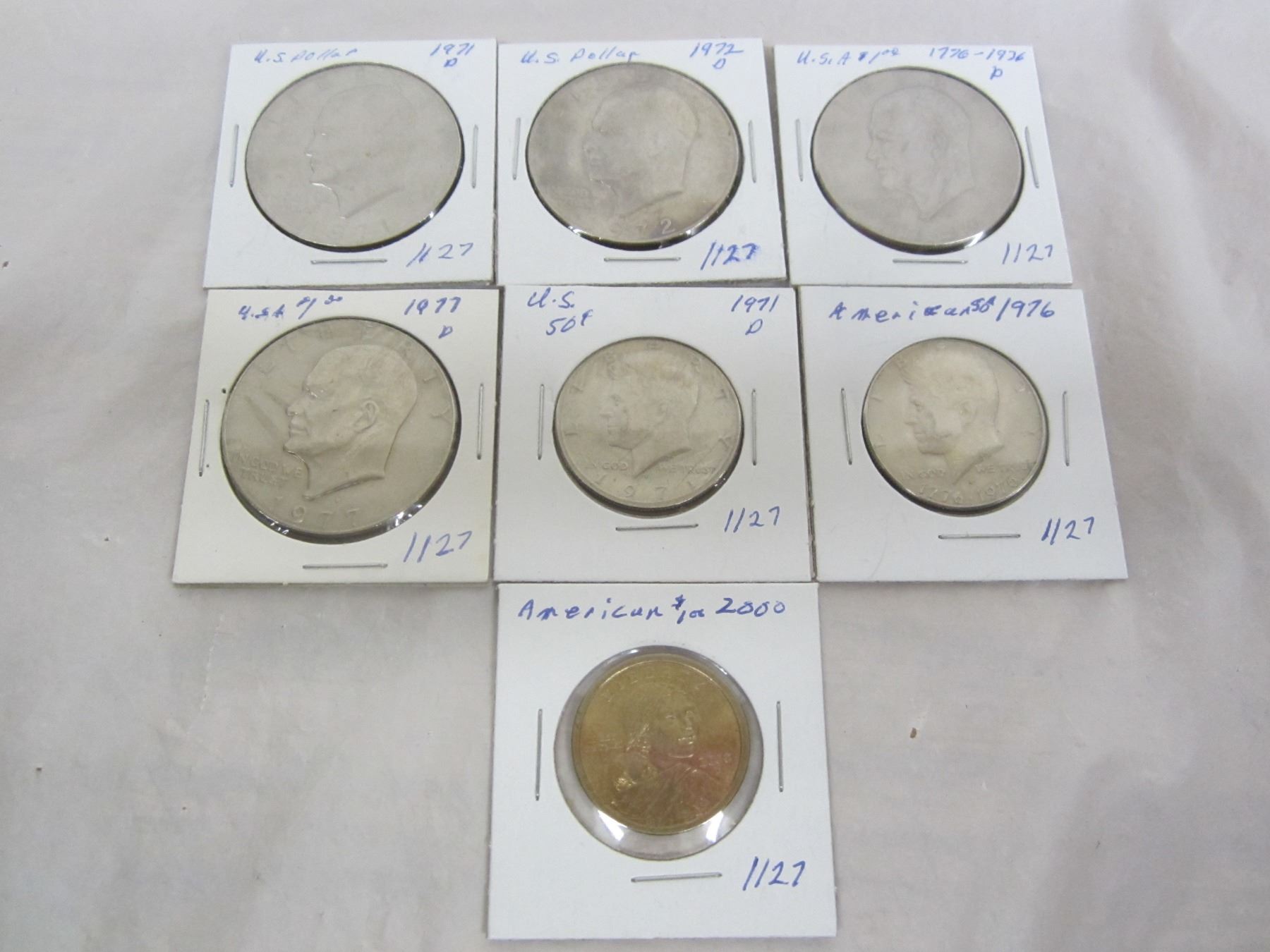 4 Ike Dollars 2 Kennedy Halfs and one Dollar Coin