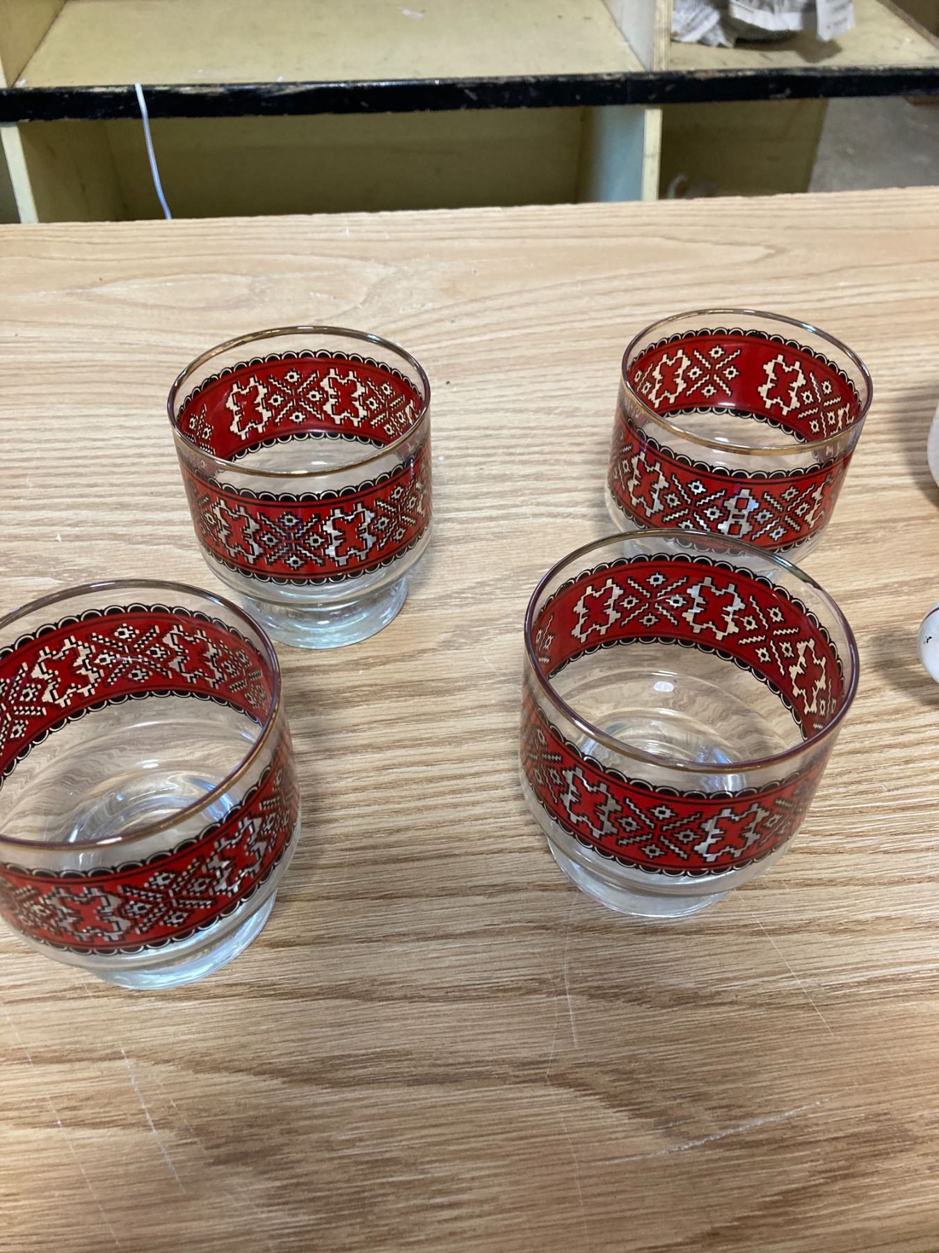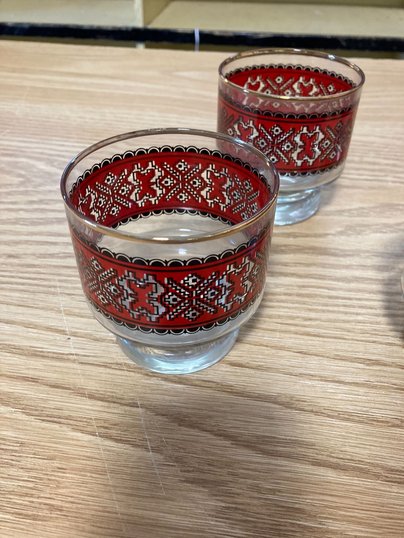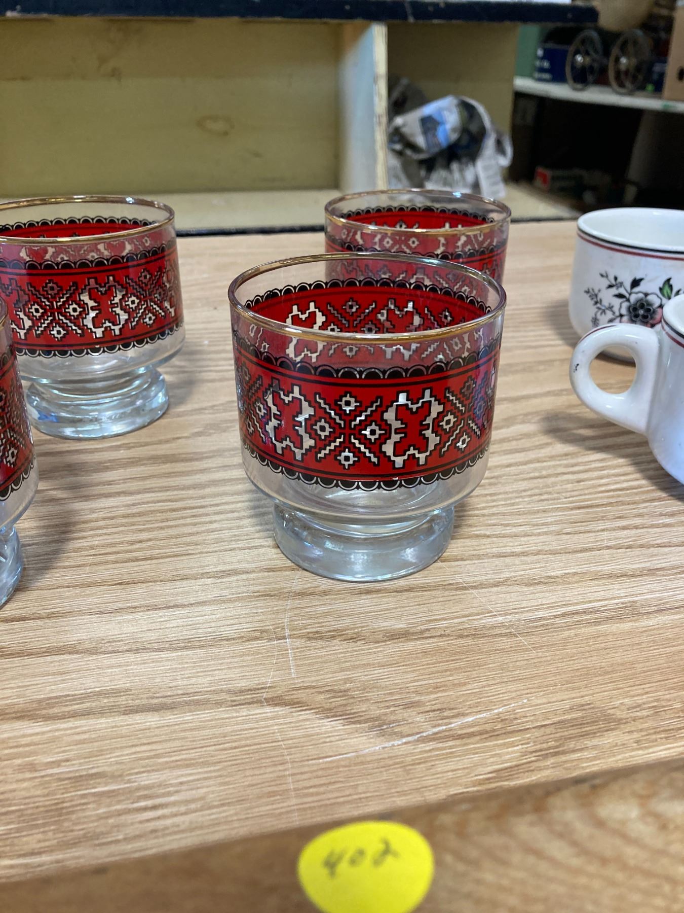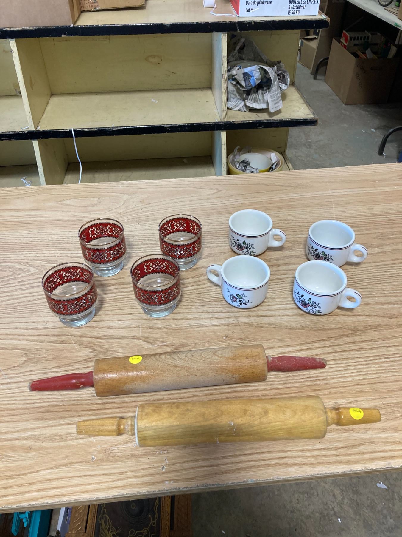 4 MUGS + 4 GLASSES RED UKRANIAN + 2 ROLLING PINS