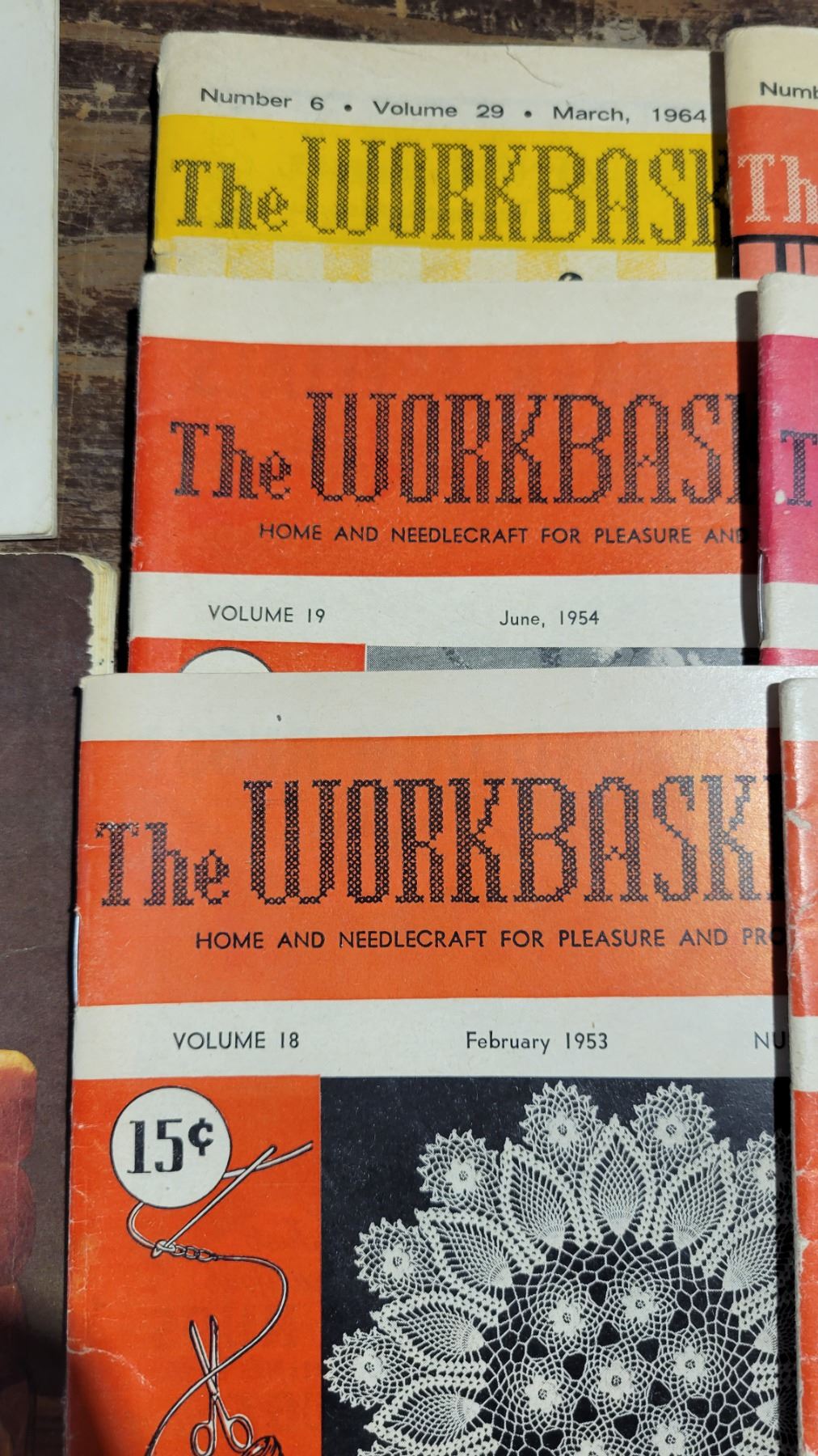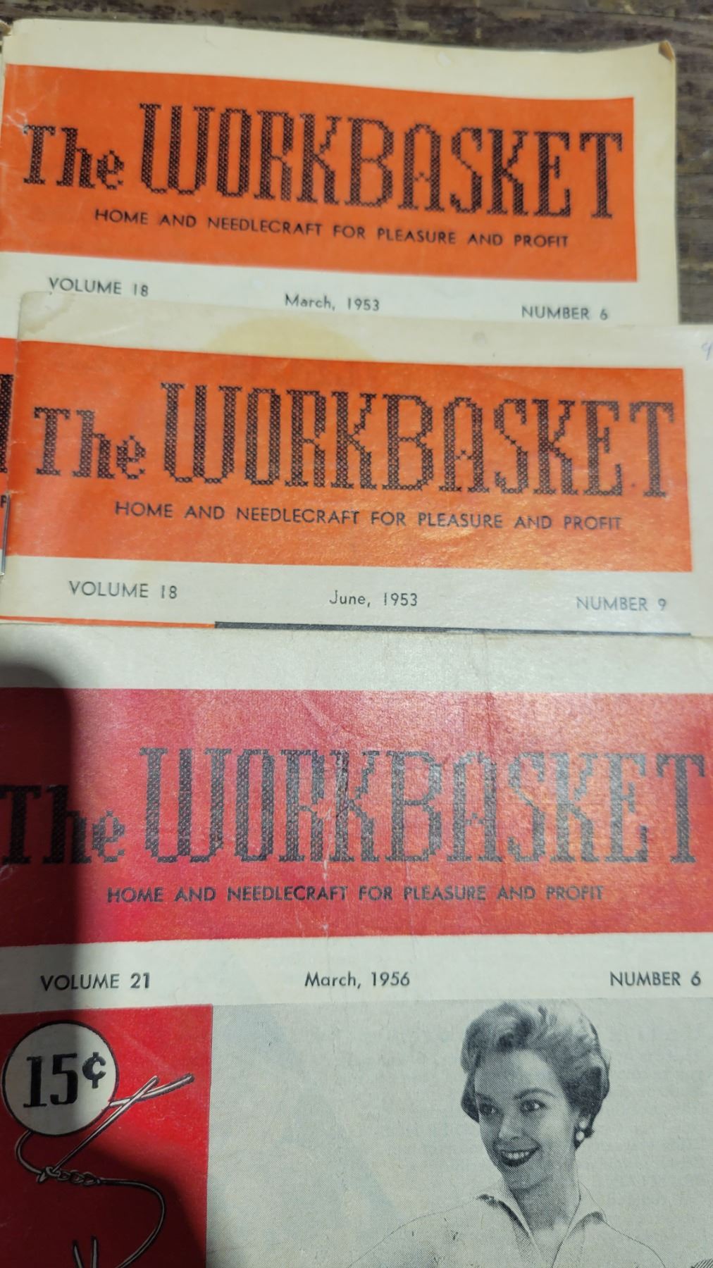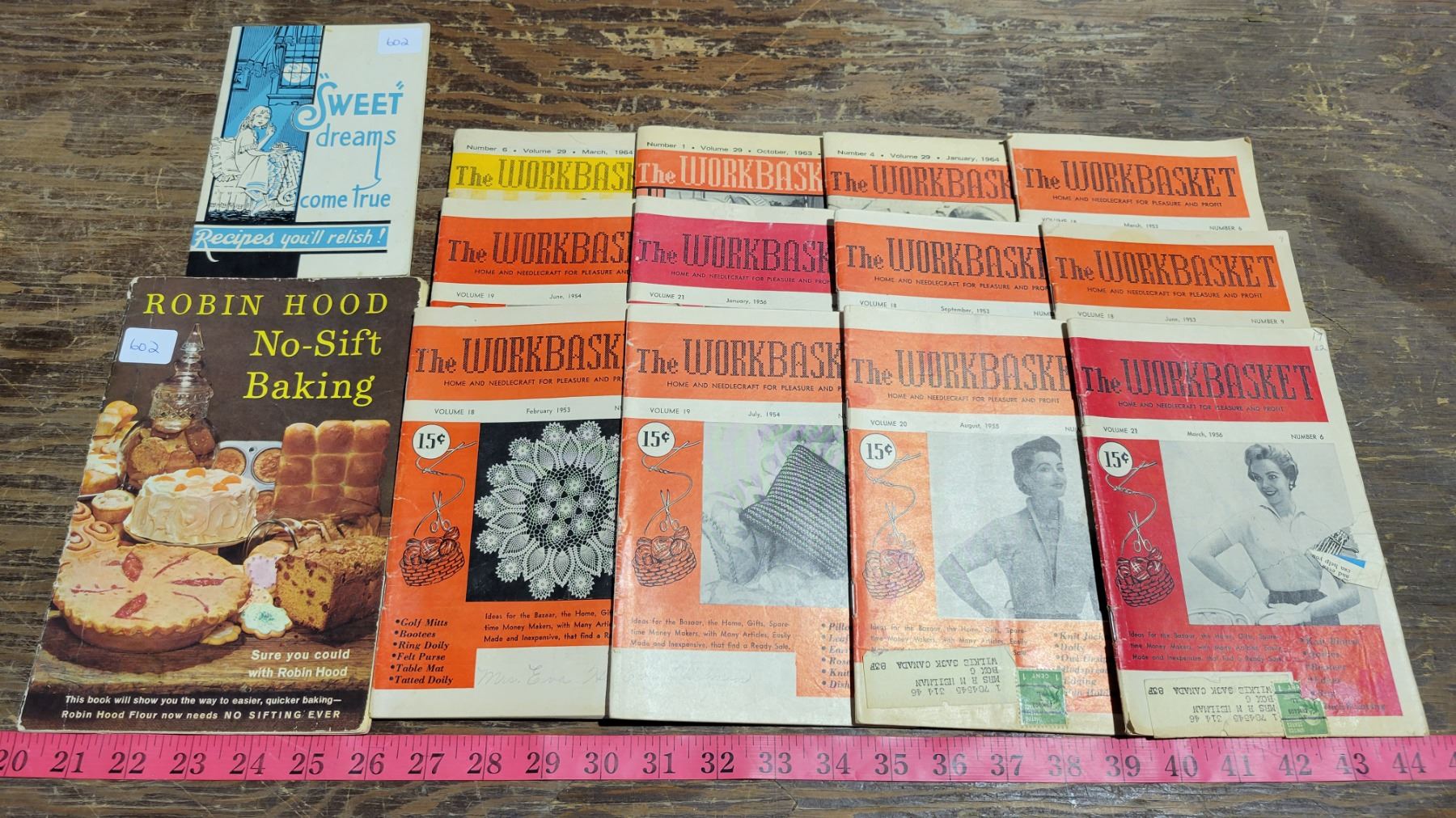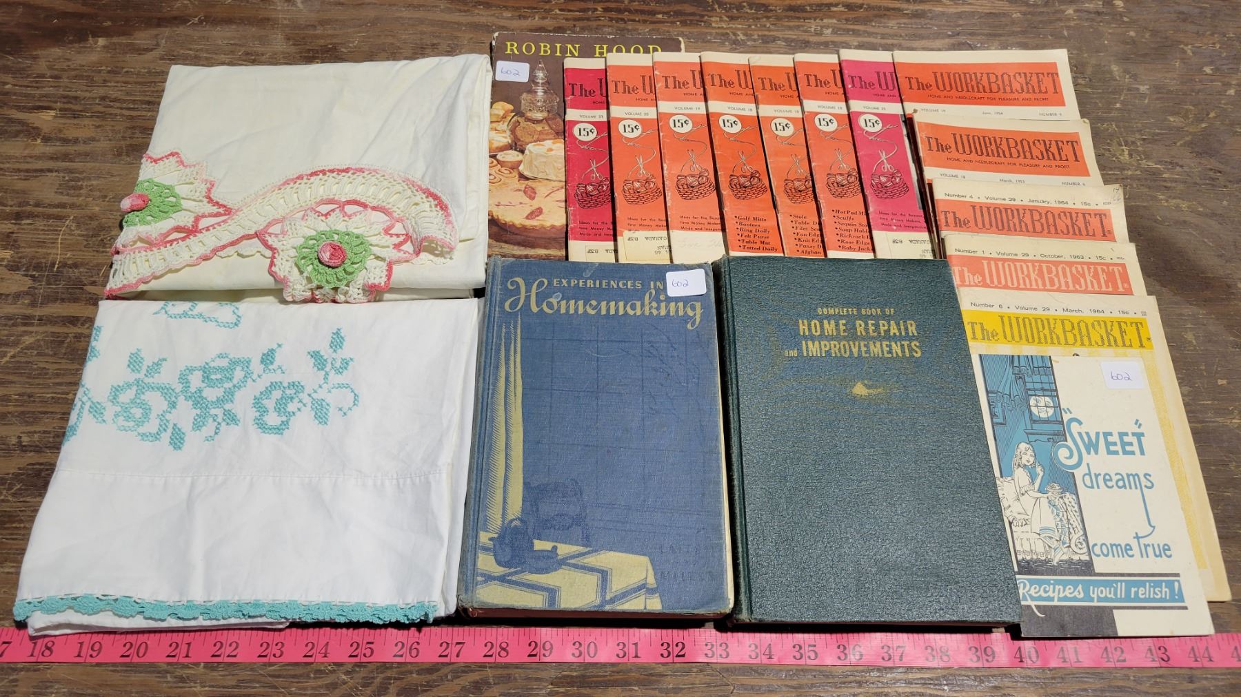 4 Old Home Making Books 1940’s, 12 The Workbasket Magazines 1950-1960, 2 Hand Crochet/Cross Stitched Pillow Cases