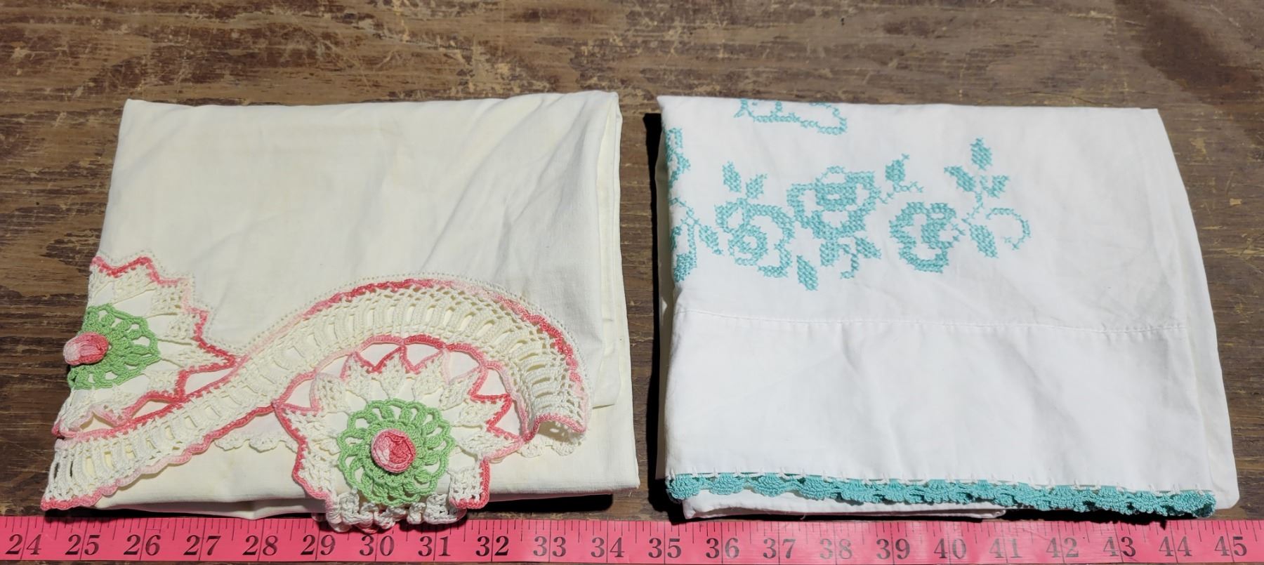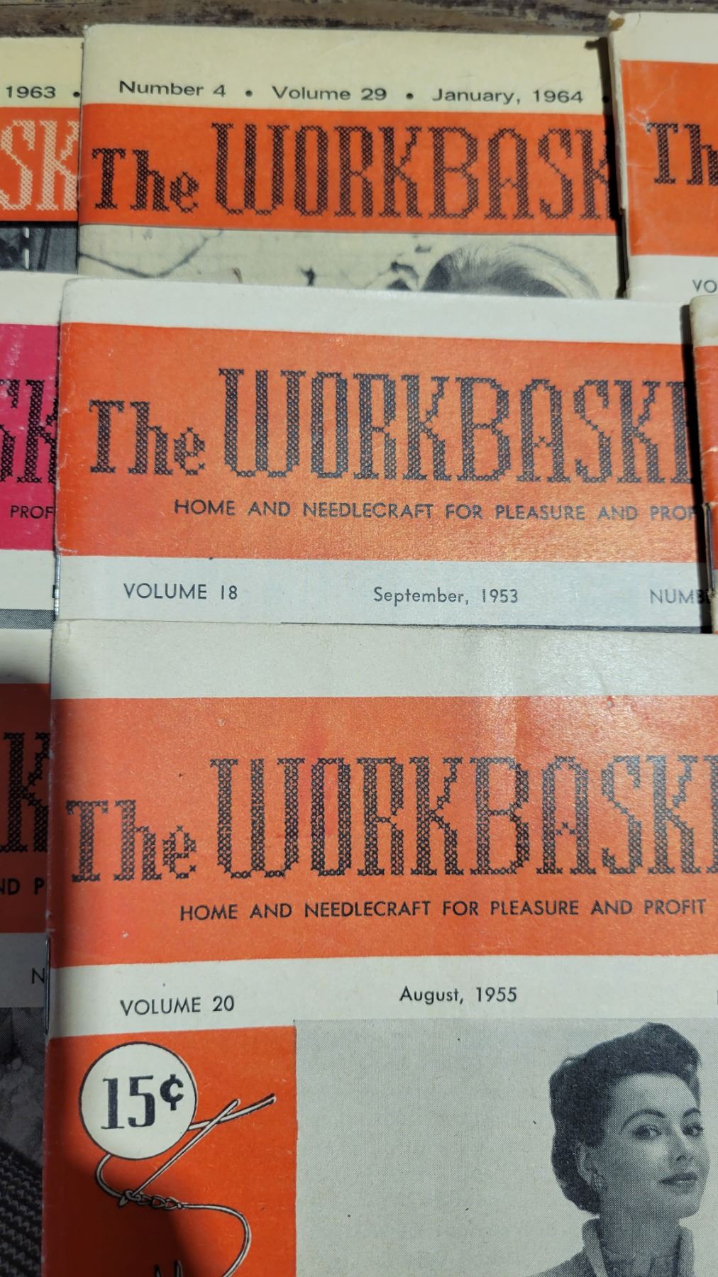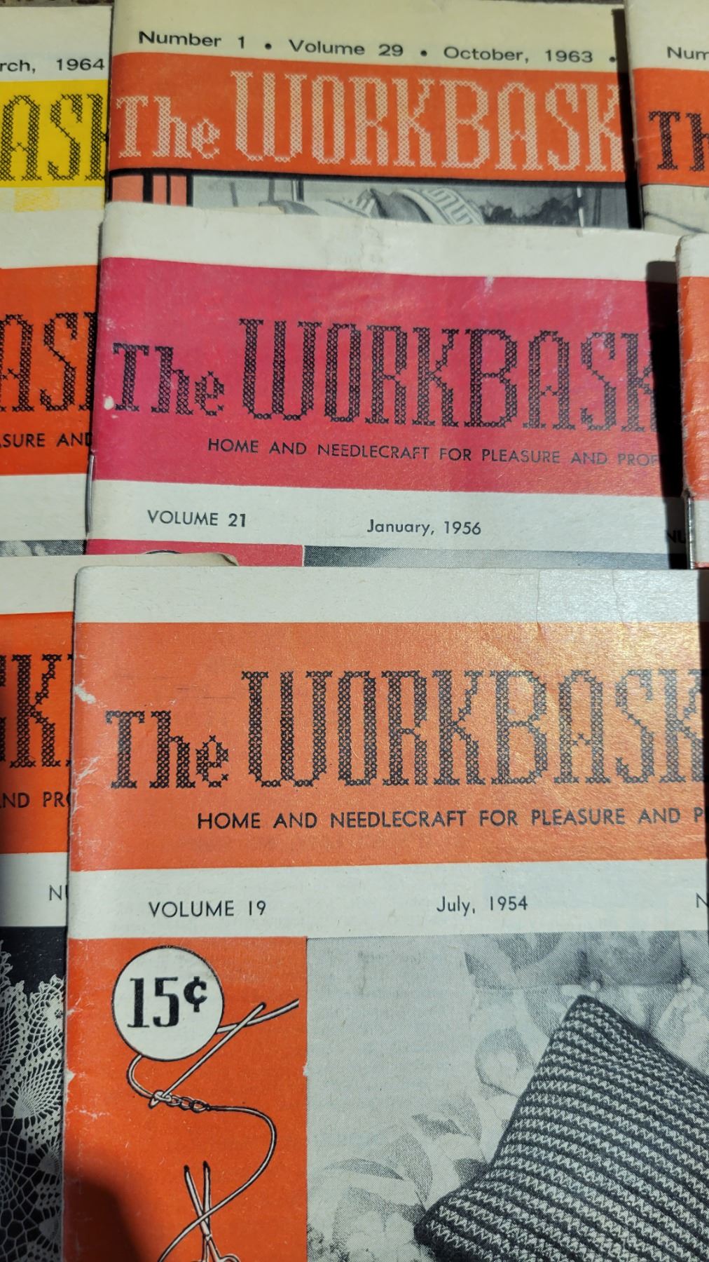 4 Old Home Making Books 1940’s, 12 The Workbasket Magazines 1950-1960, 2 Hand Crochet/Cross Stitched Pillow Cases