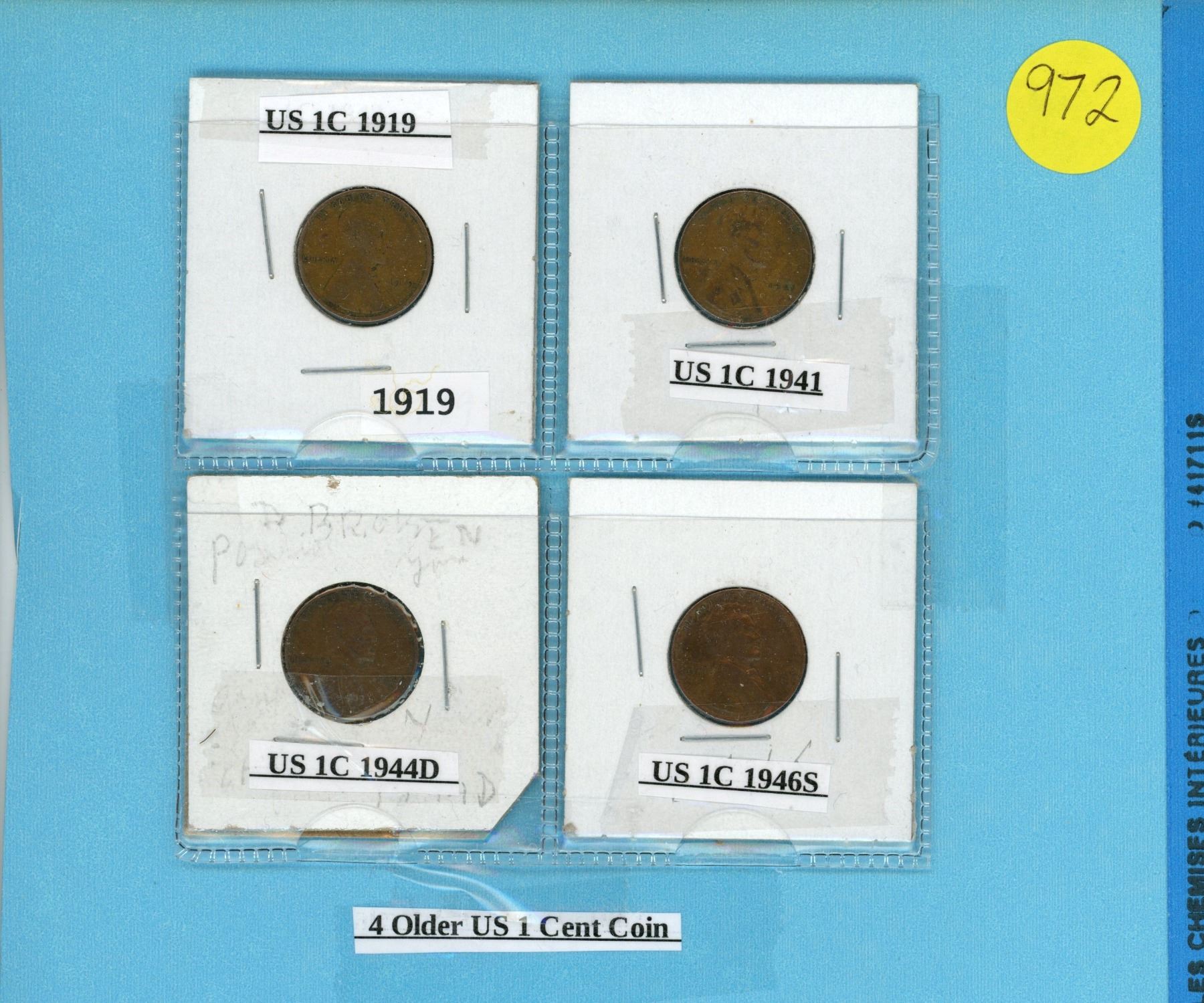 4 Older US 1 Cent Coins - 1919, 1941, 1944D, 1946S