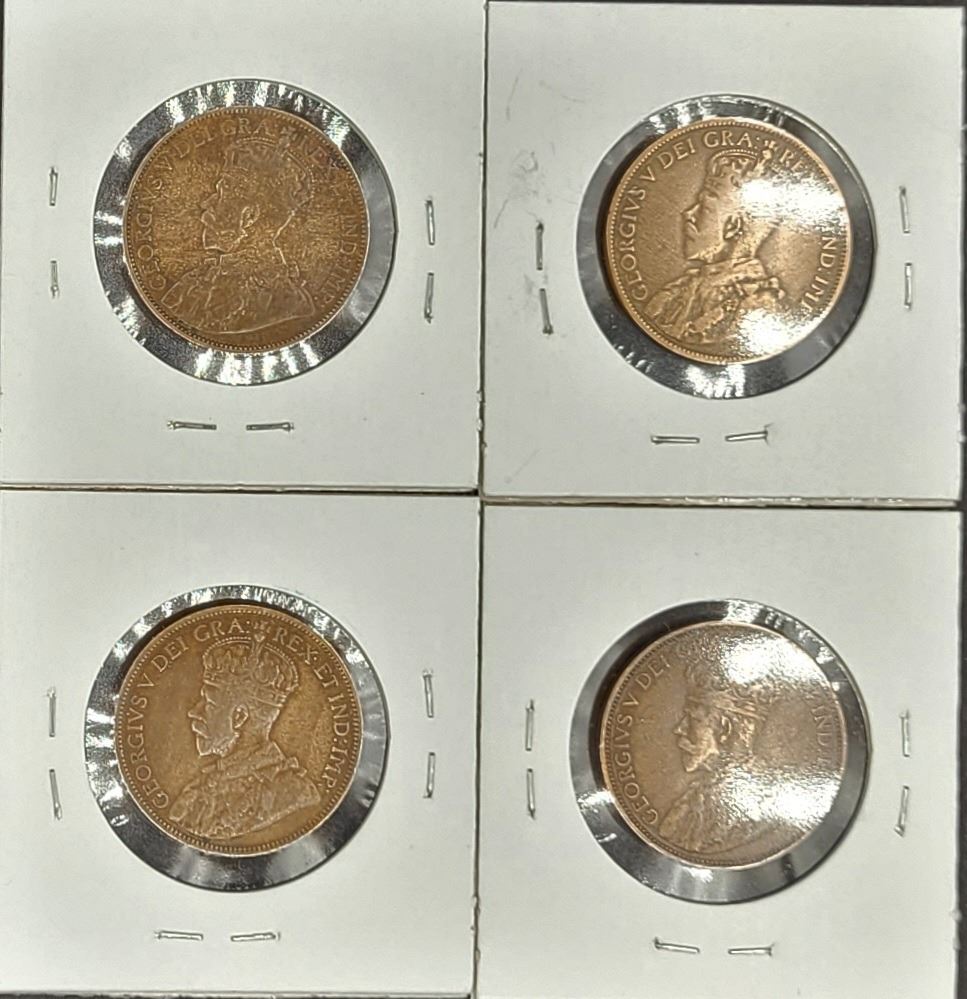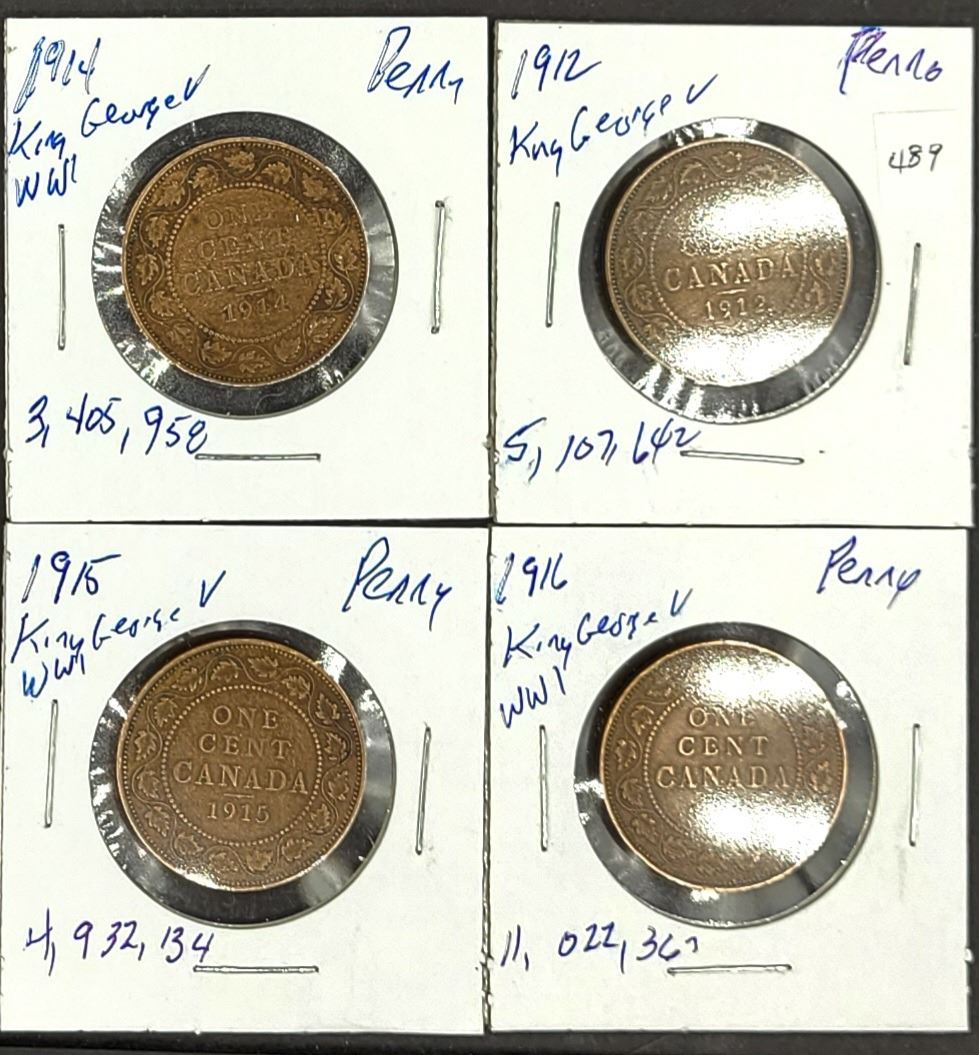 4 – Pennies 1912, 1914, 1915 & 1916 King George V low mintage 3 W.W.I look closely at the details and sharpness of the coin Part of 2020 recall by Govt of Canada