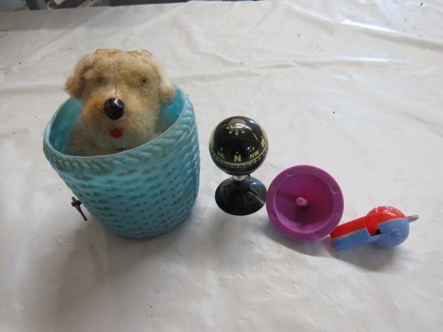 4 TOYS (SPINNING TOP, WHISTLE, COMPASS, DOG IN BASKET *NOT WORKING*)