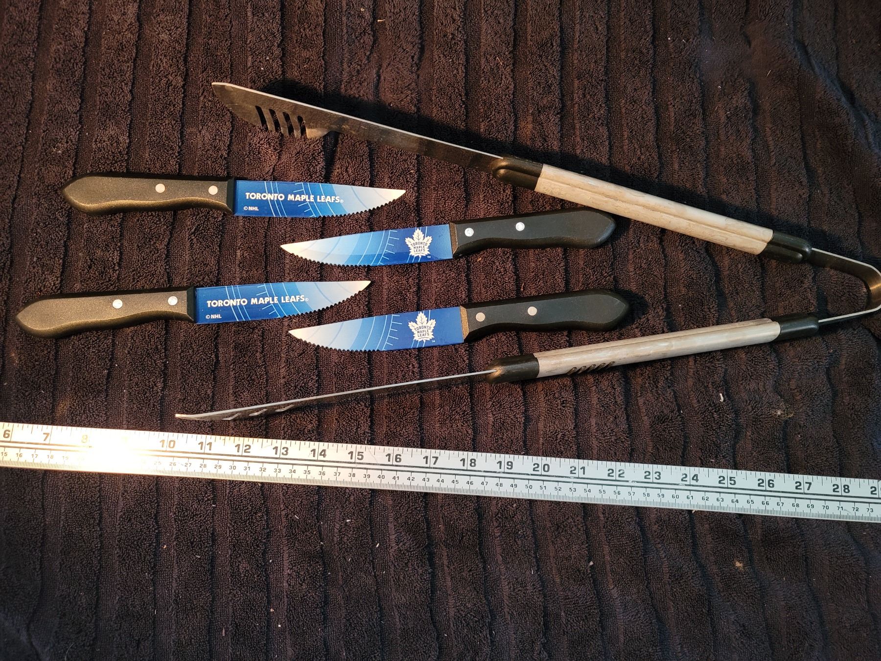 4 Toronto Maple Leaf steak knives and BBQ tong
