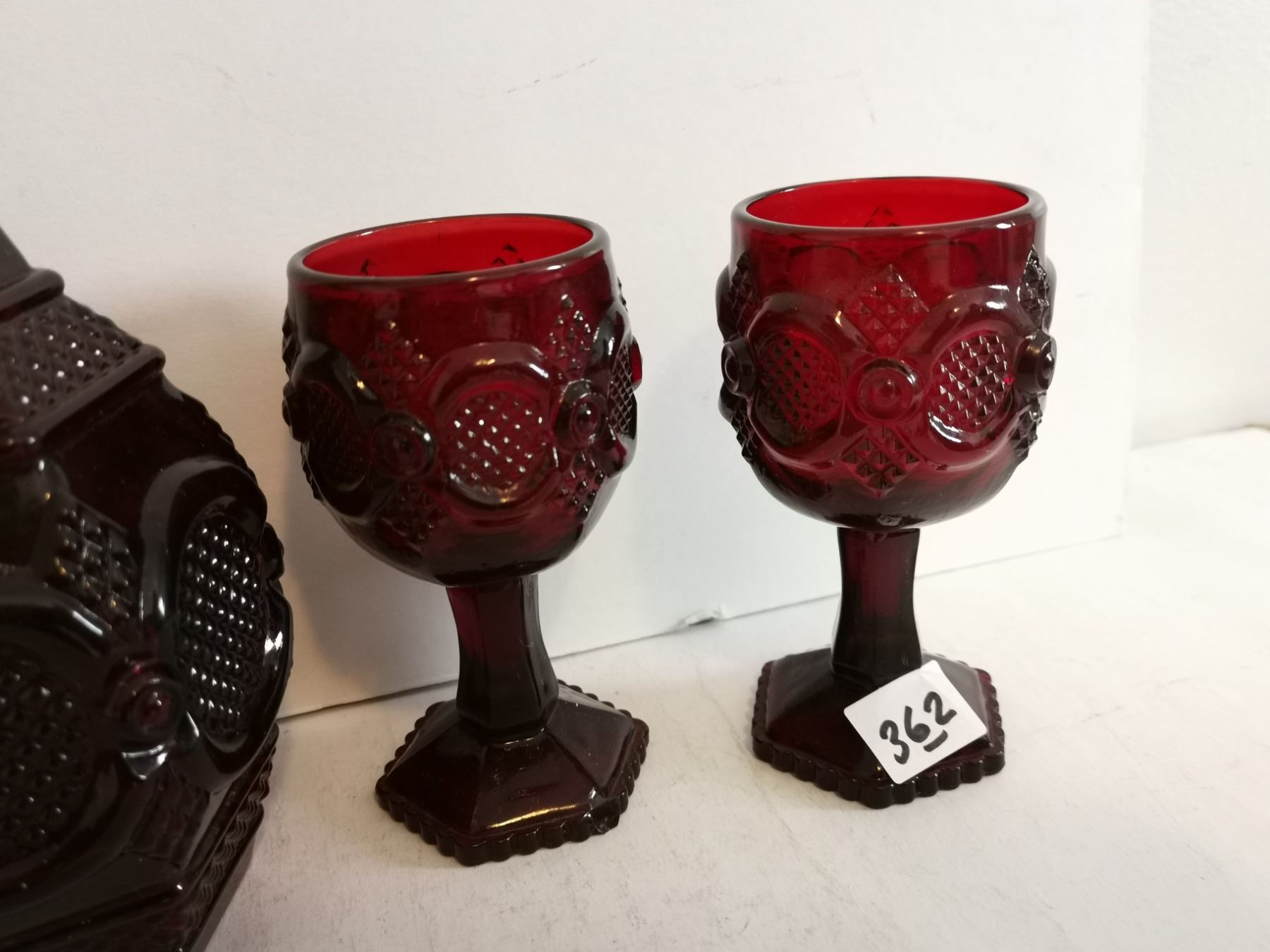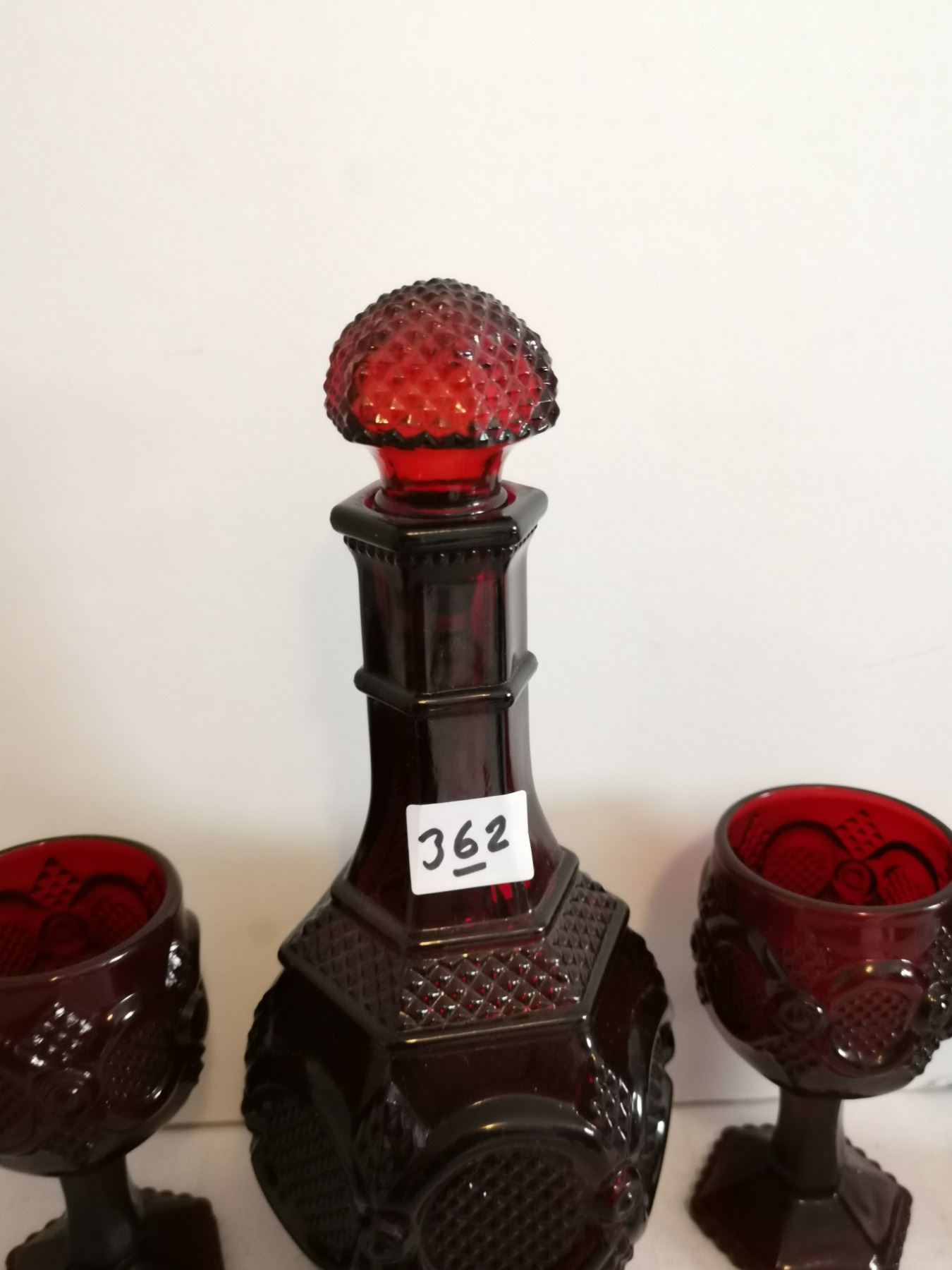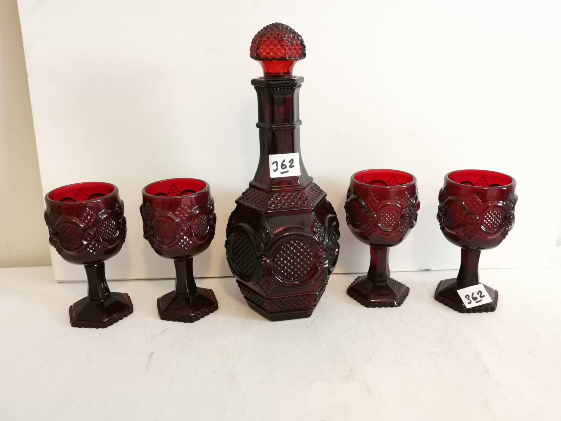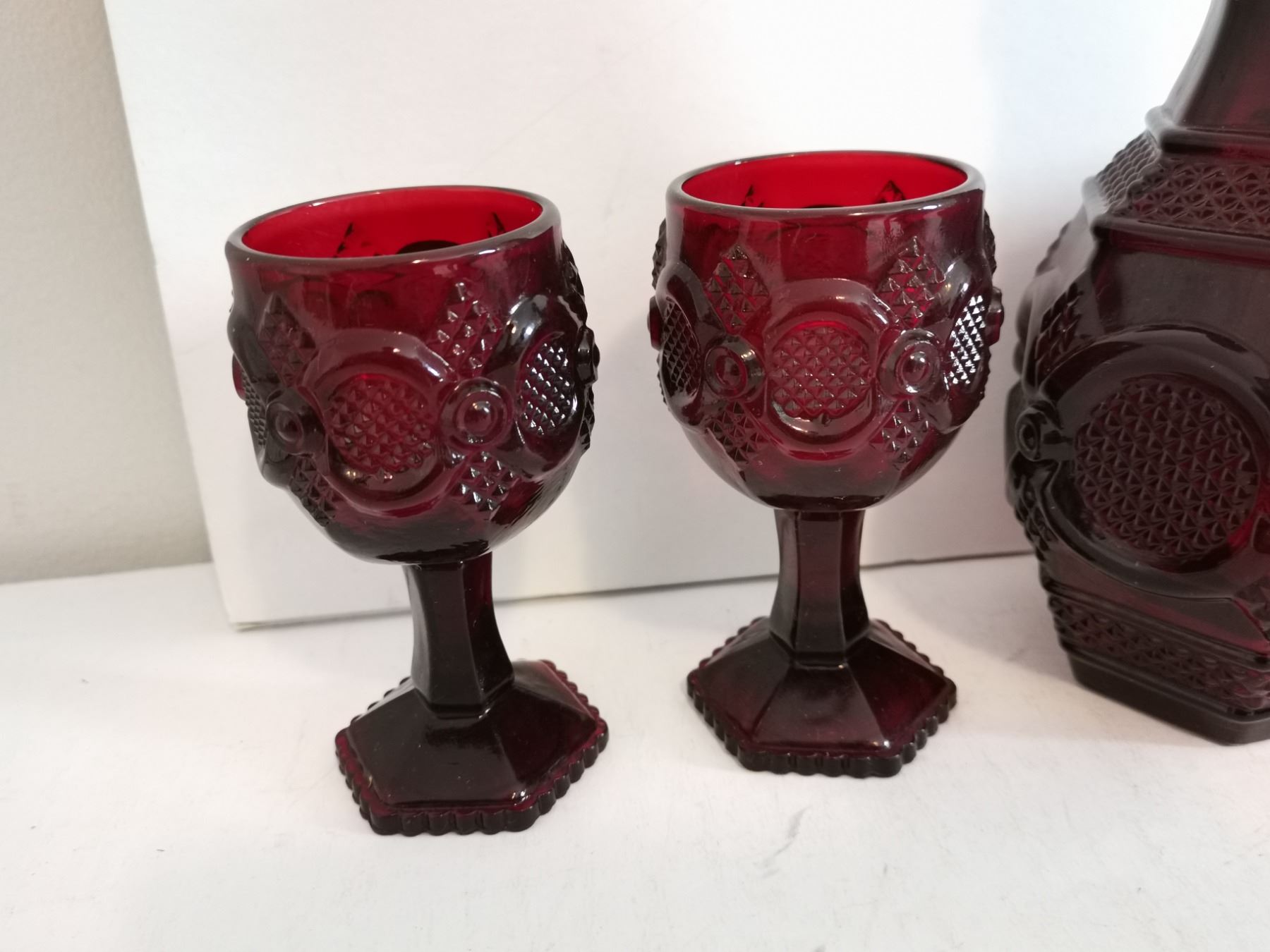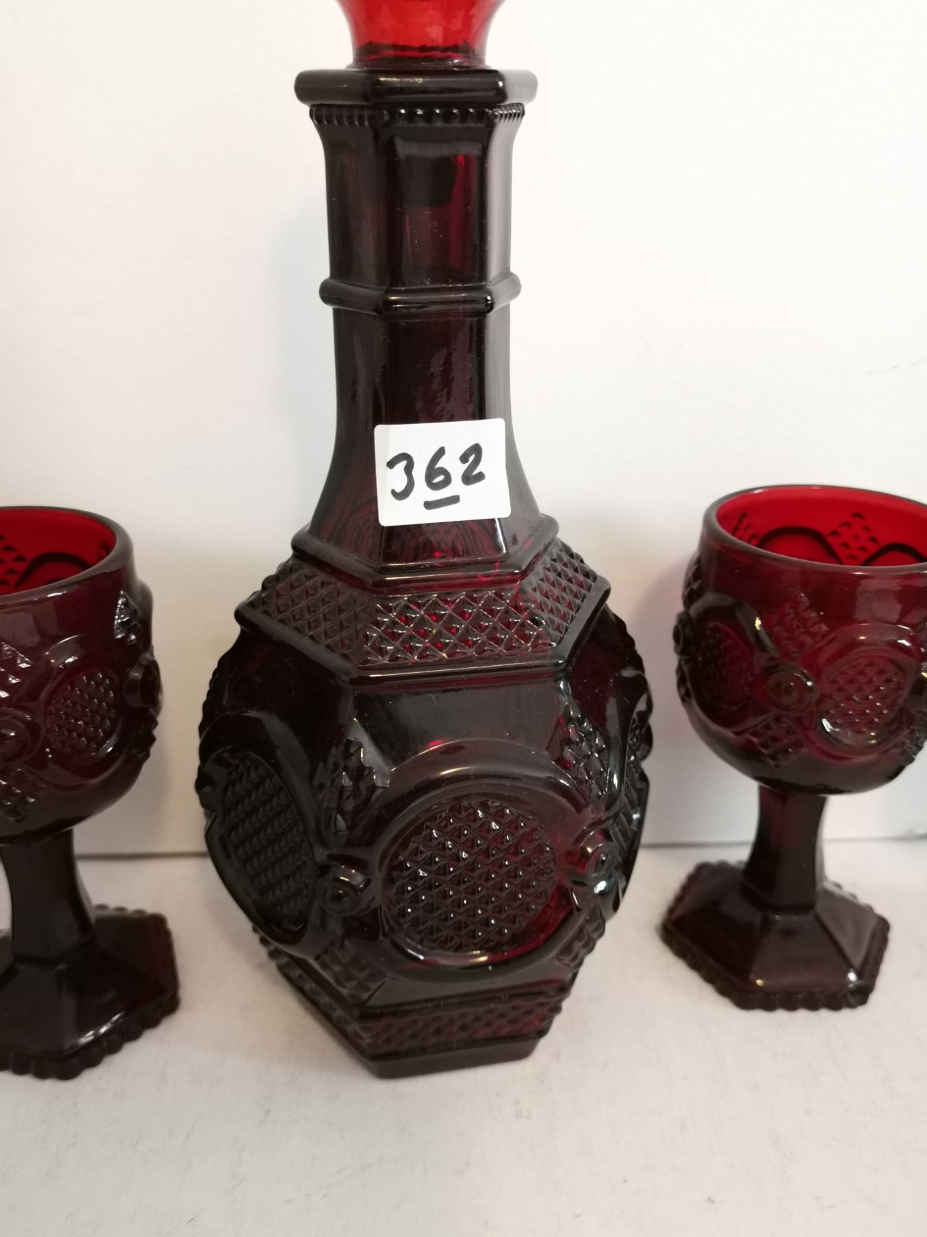 (4) Vintage Avon Ruby Red Glasses (4.5”) and Decanter (9.5”).