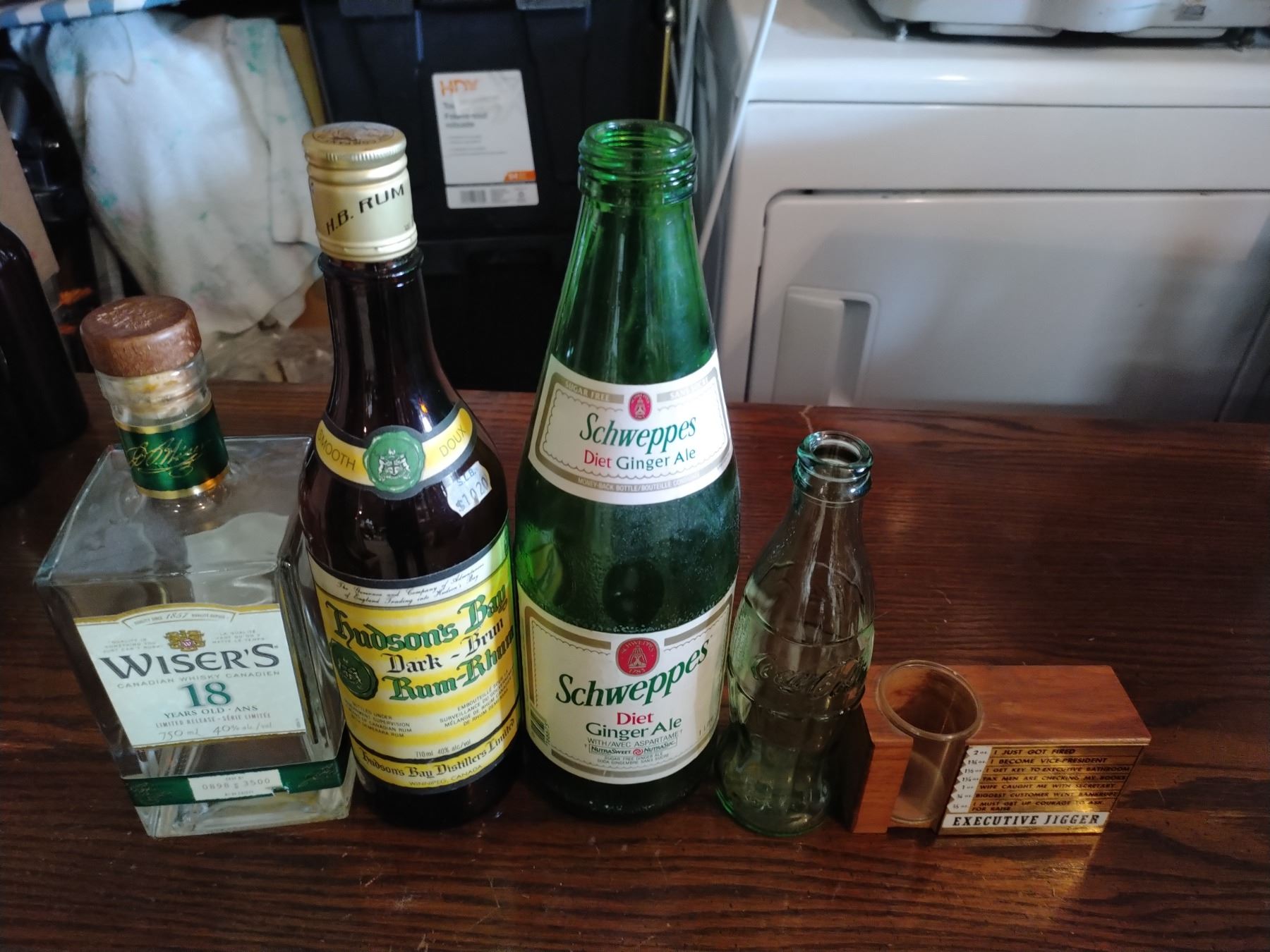 4 Vintage bottles, and comedic shot glass - wisers, Hudson bay, Schweppes, Coca-Cola, etc.