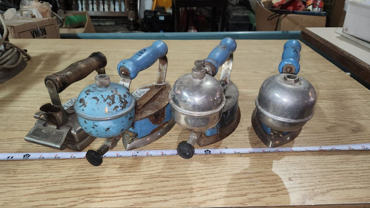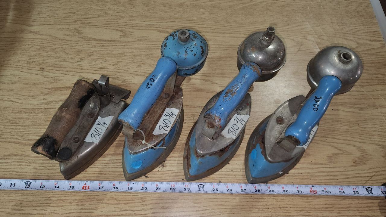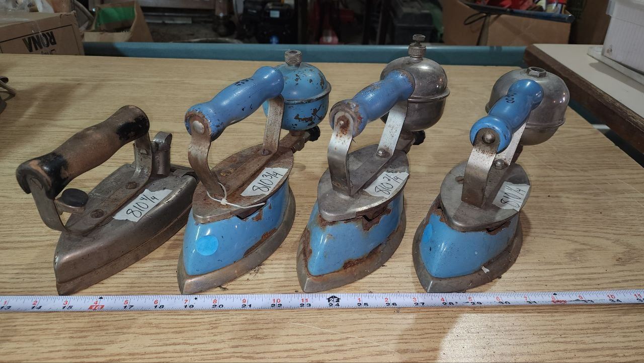 4 Vintage sad irons - 3 blue Coleman & 1 Hotpoint