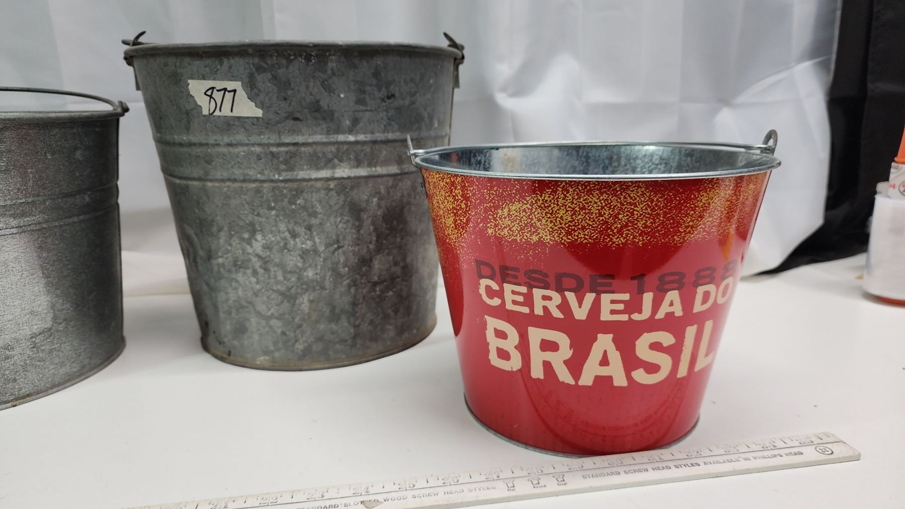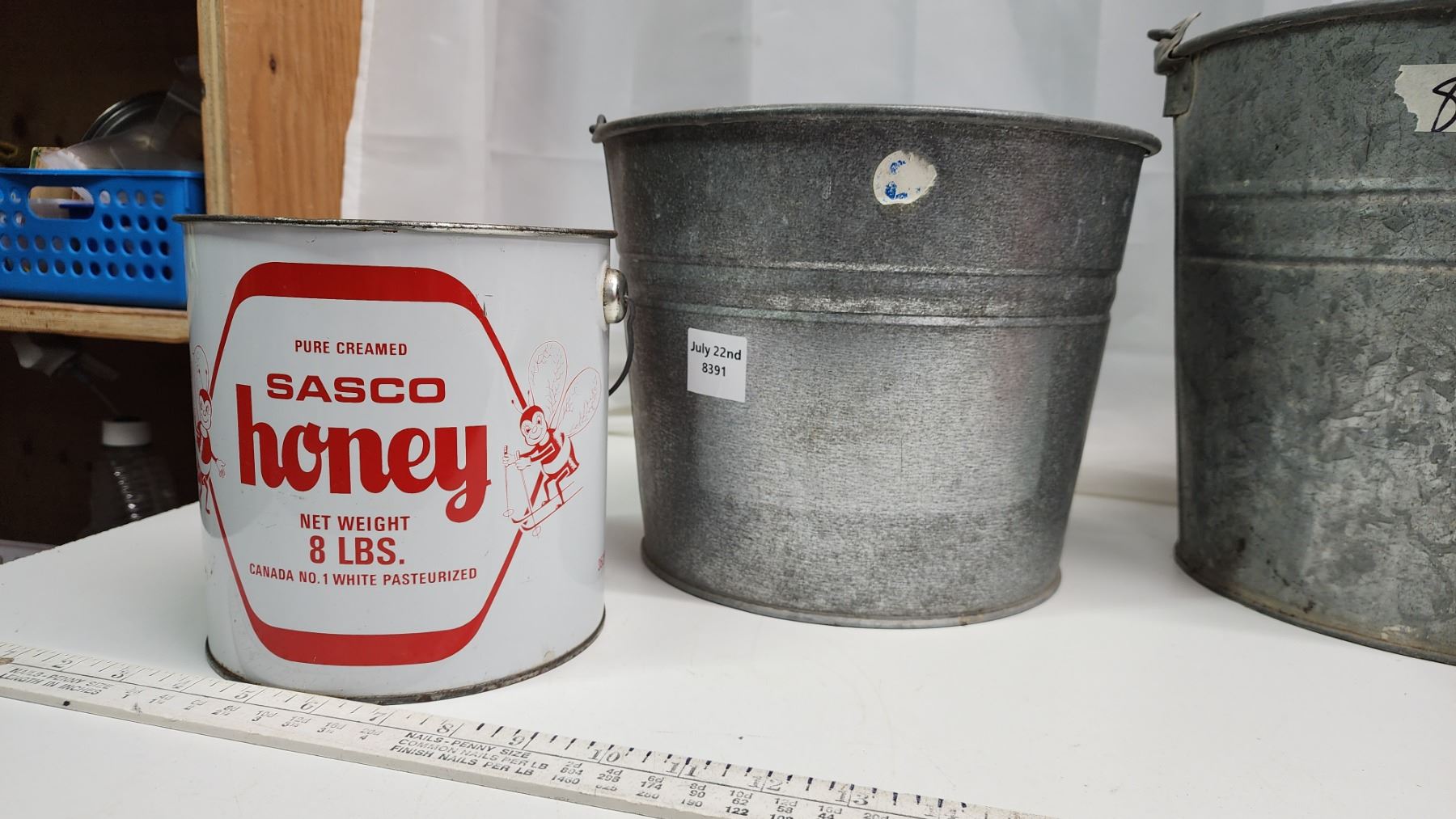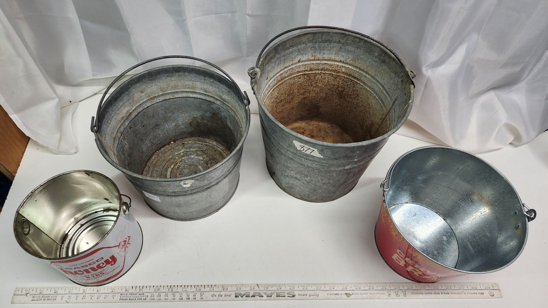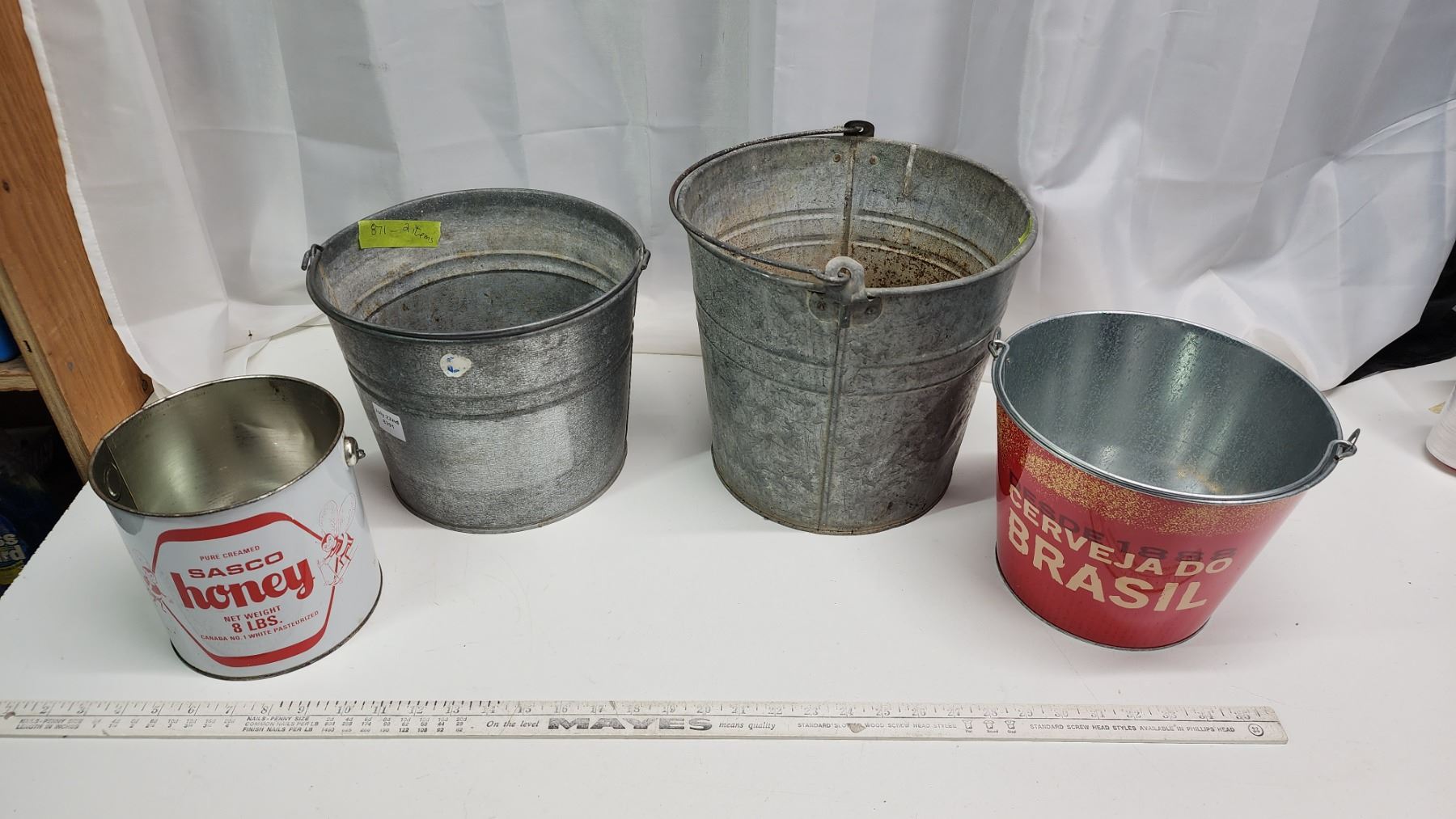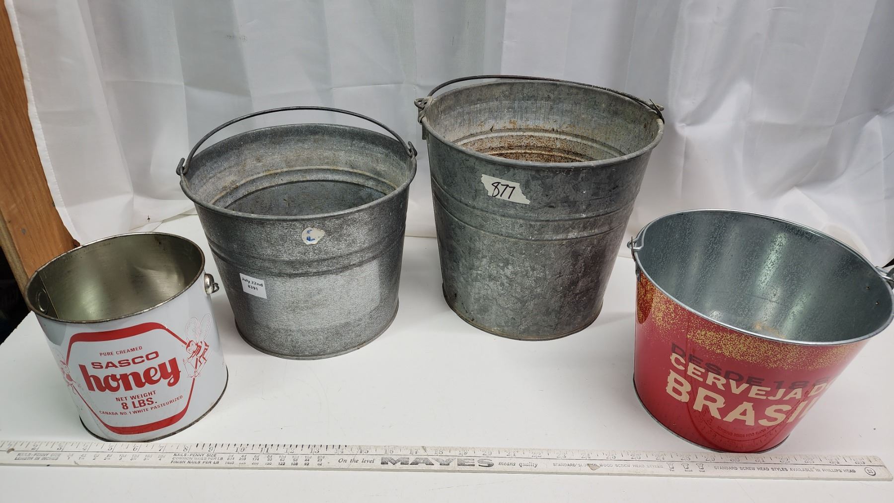 4 assorted pails - 2 vintage galvanized steel, SASCO honey can 8lb, etc.