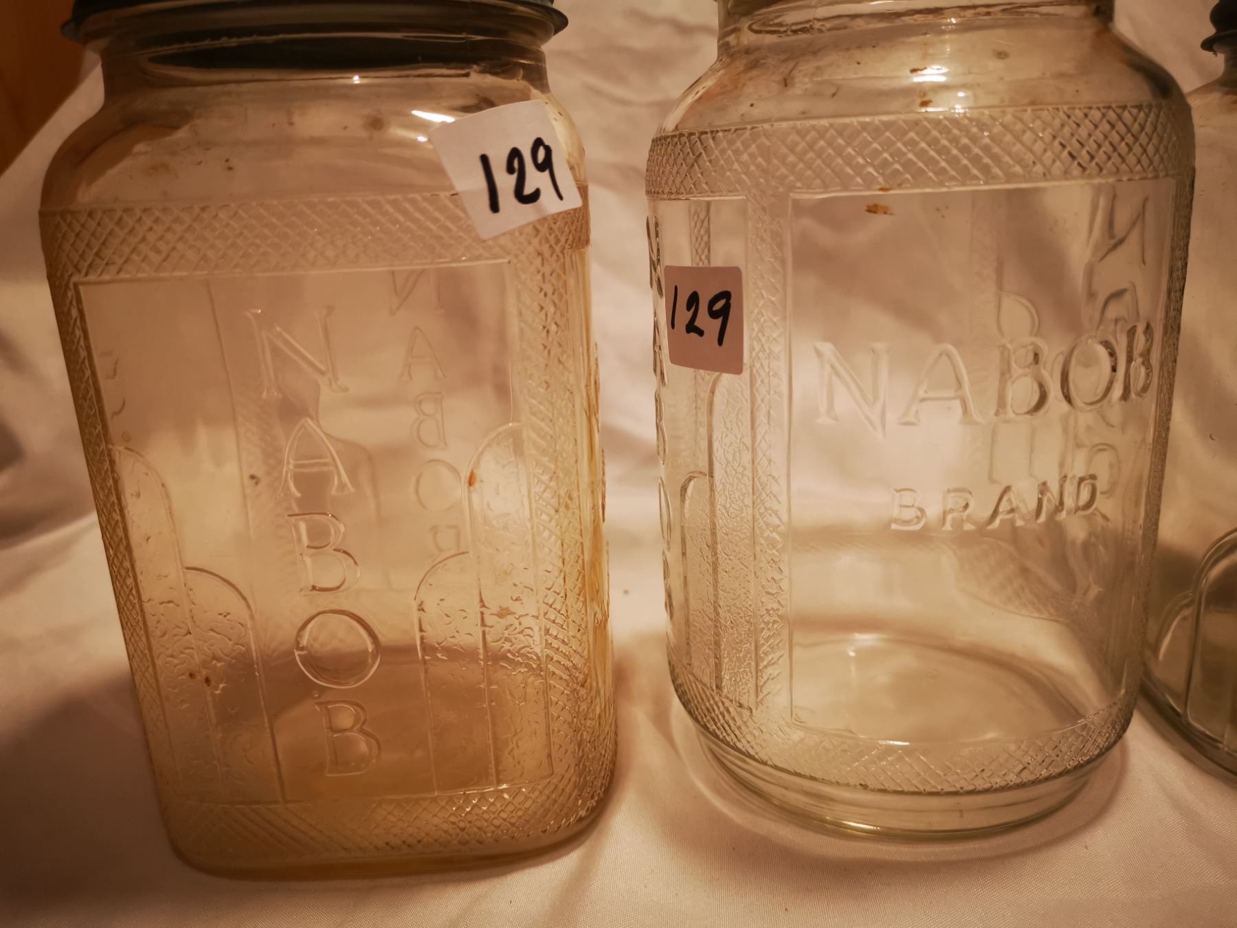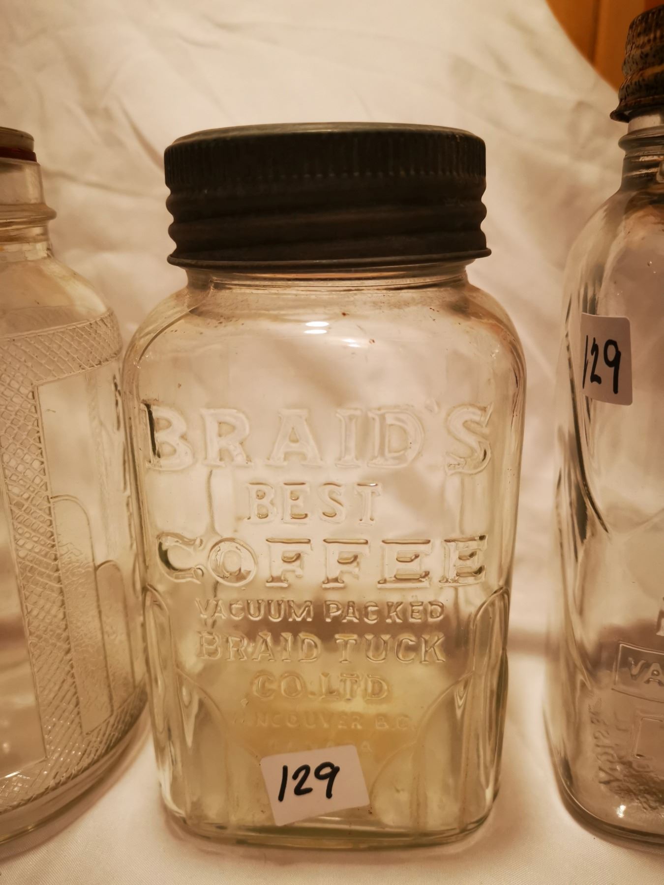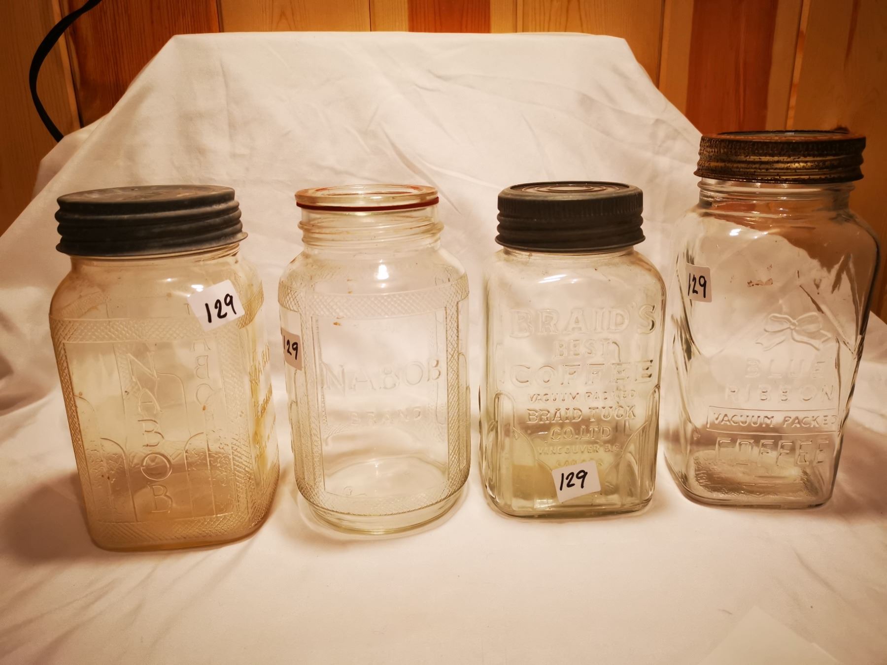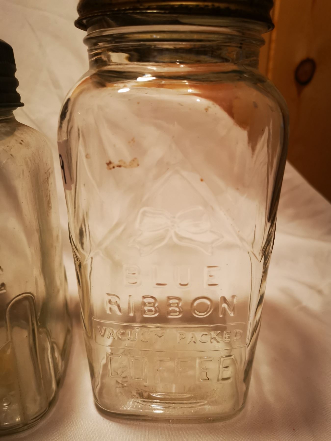 4 coffee jars, Blue Ribbon, Nabob, Braids