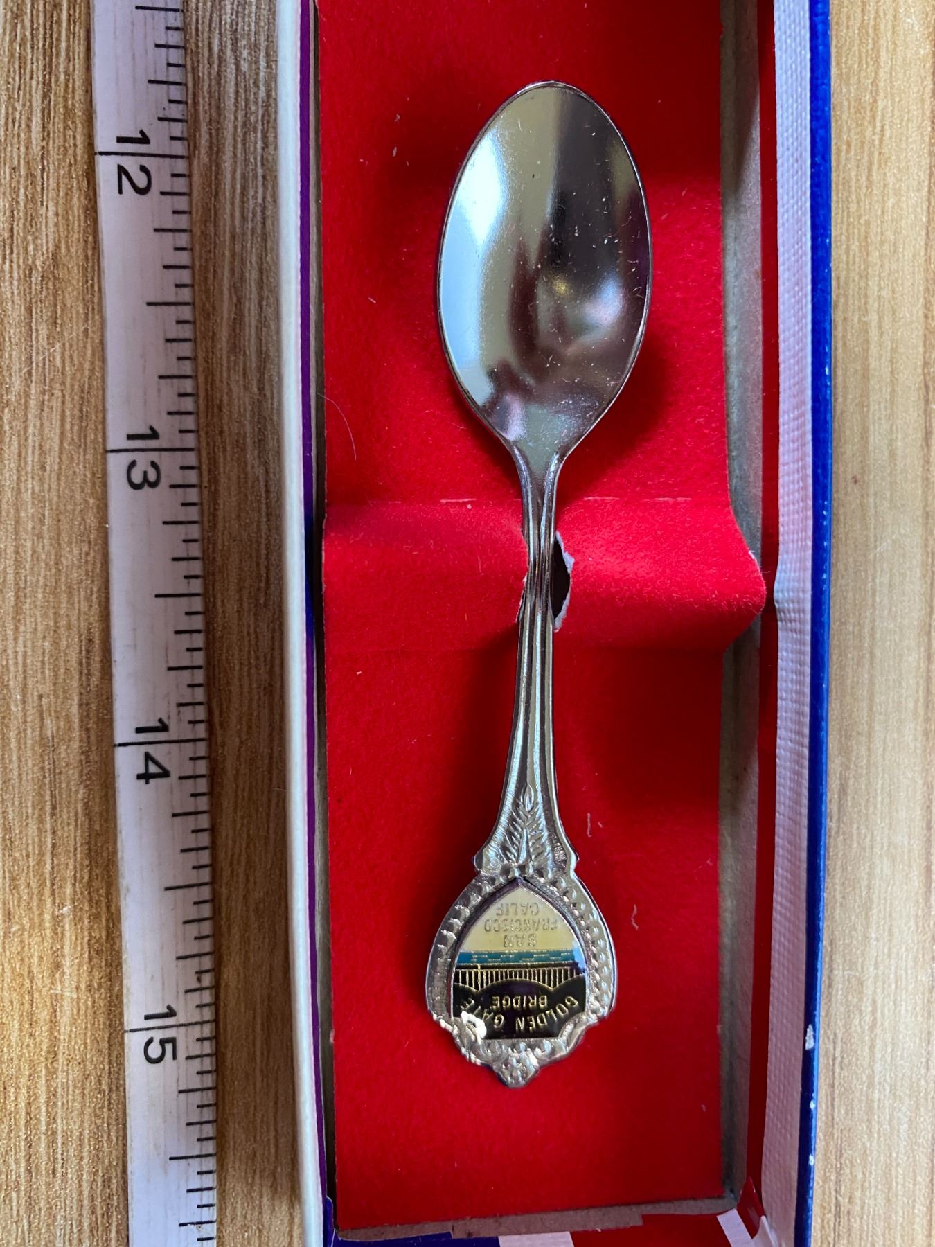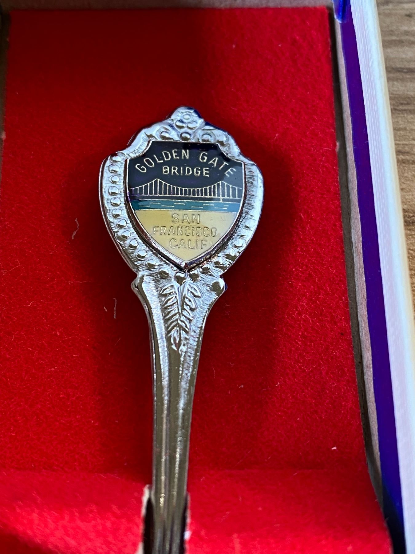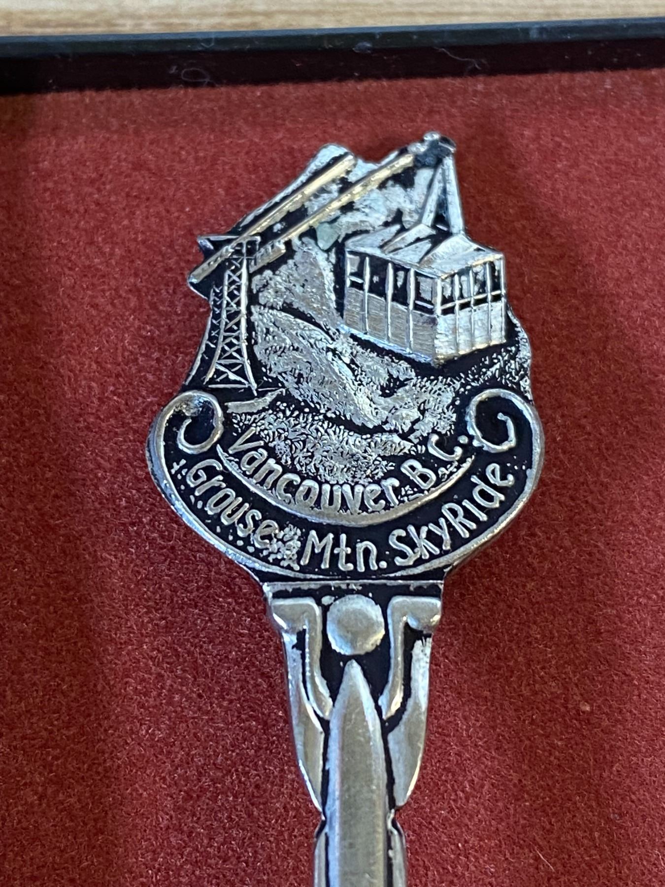 4 collector spoons and a set (12) little forks Vancouver Grouse Mtn. SkyRide, Ottawa, Golden Gate bridge San Franisco, Commemorative spoon Roberta Tilton 1997-98. Little forks are special quality stainless steel.