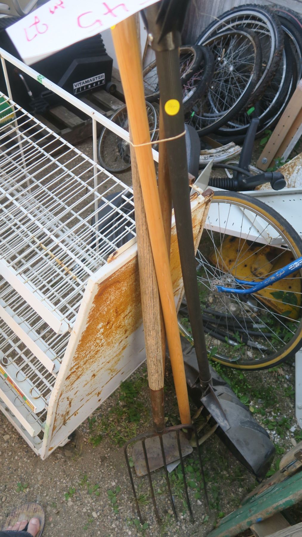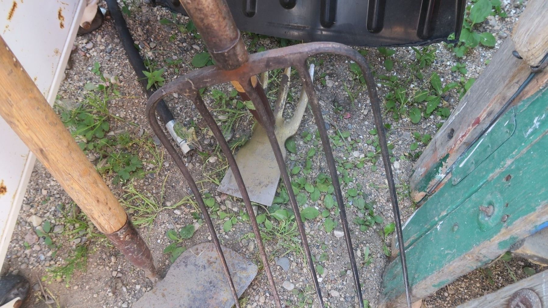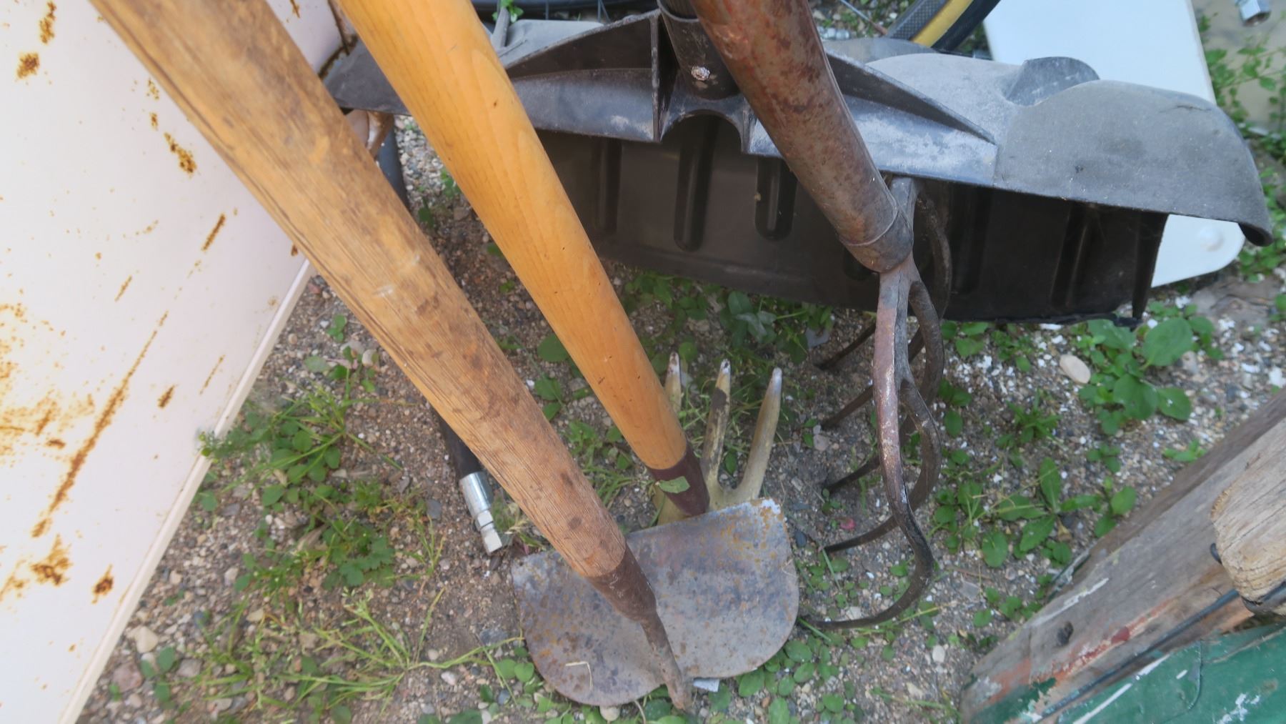 4- garden tools, hoe, snow shovel, pitch fork, weeder.