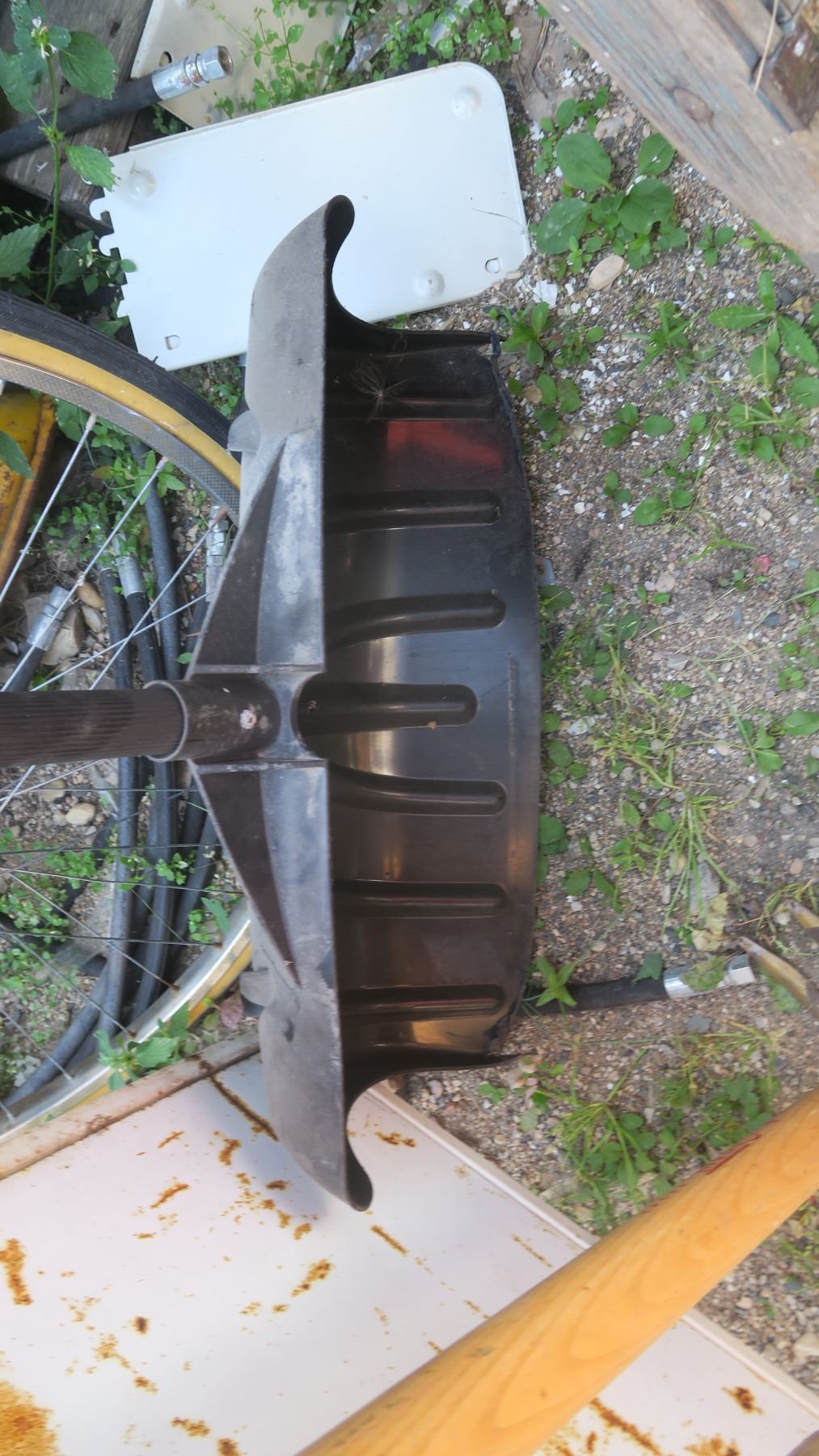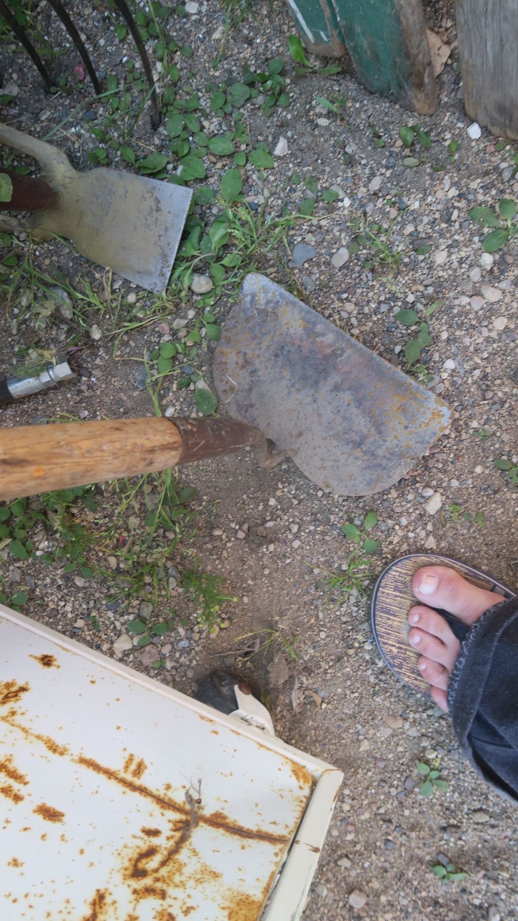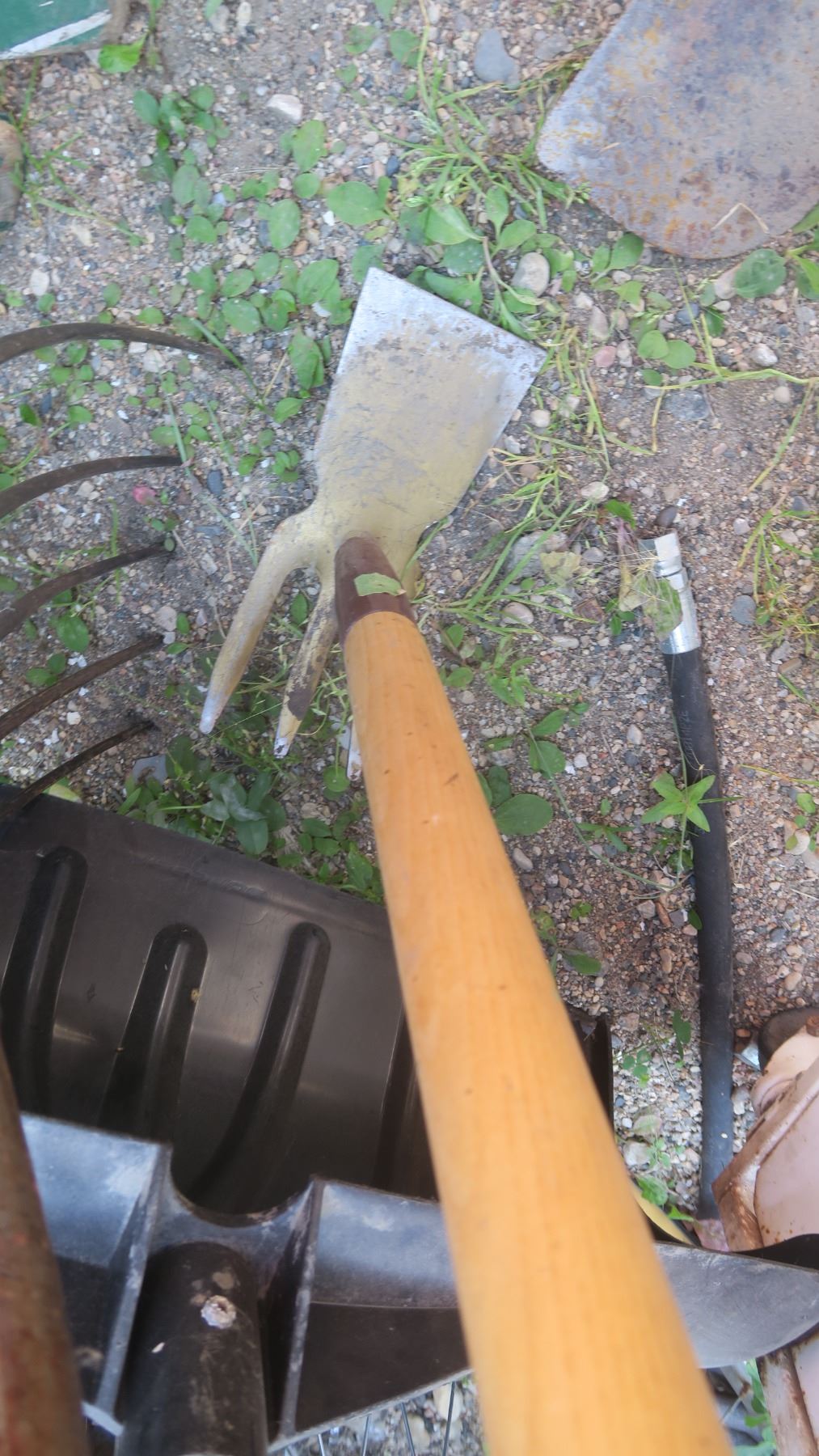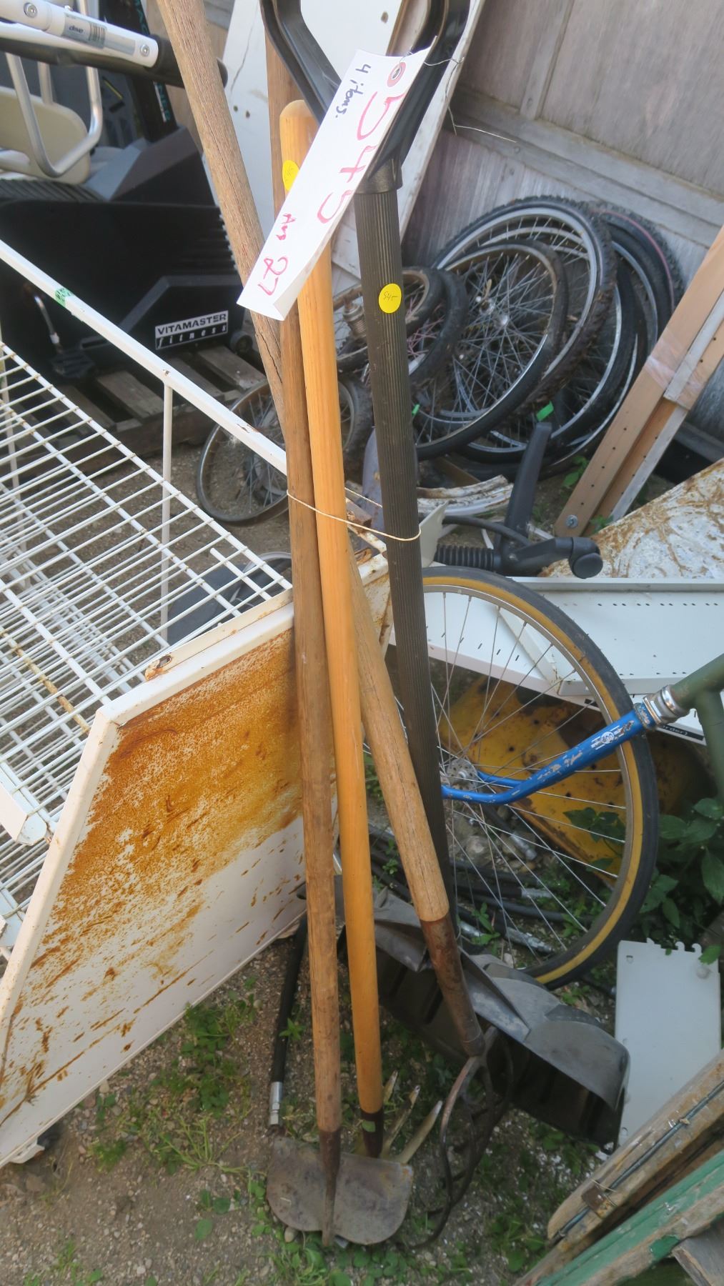 4- garden tools, hoe, snow shovel, pitch fork, weeder.
