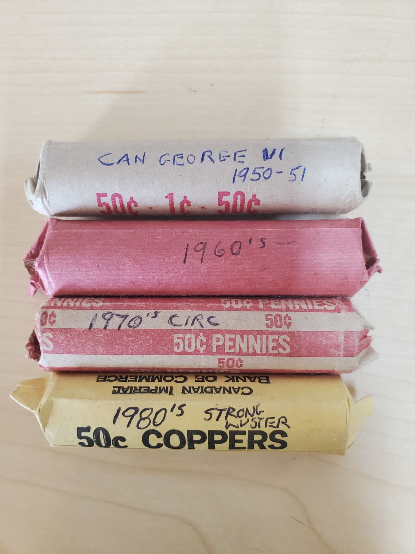 4 rolls of pennies 1950-51, 60's, 70's, 80's