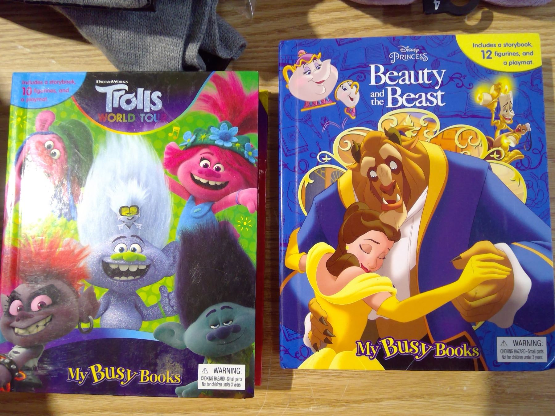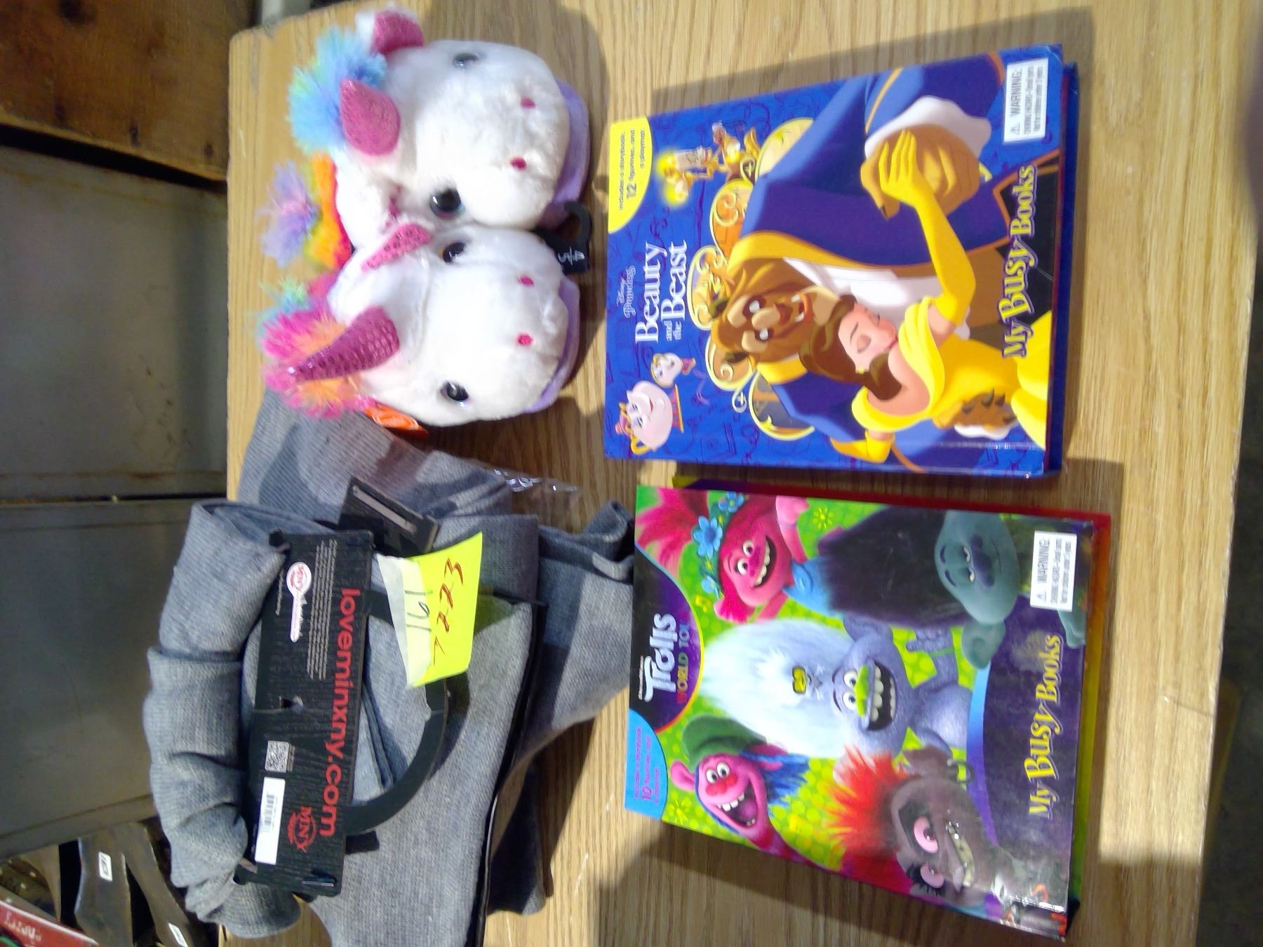4 scarves with pocket, 2 sets busy books, sz 4-5 slippers
