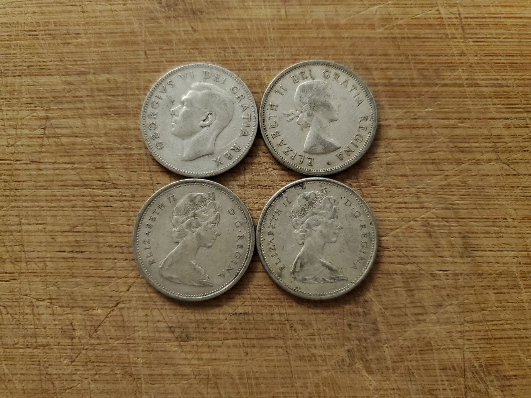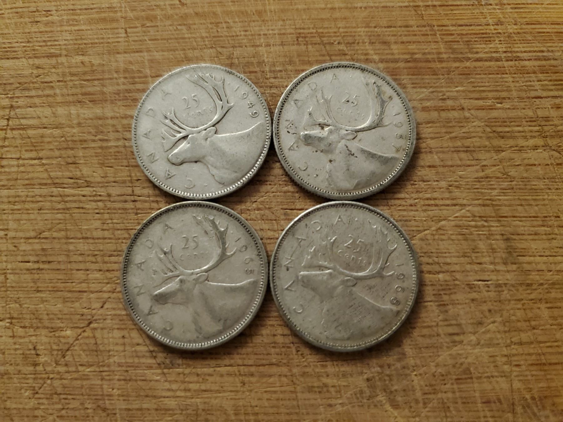 4 silver Canadian quarters 1949, 1957, 1965, 1968 non magnetic