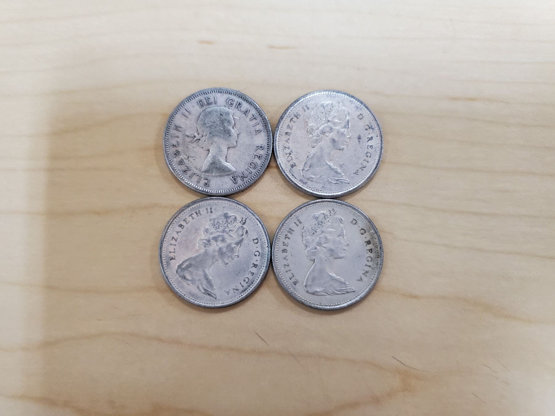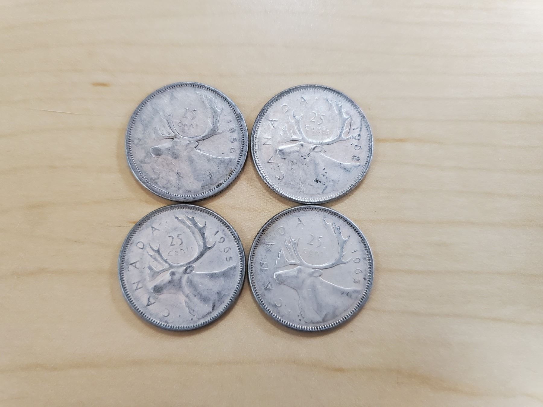 4 silver Canadian quarters 1956, 1965 x 2, 1968