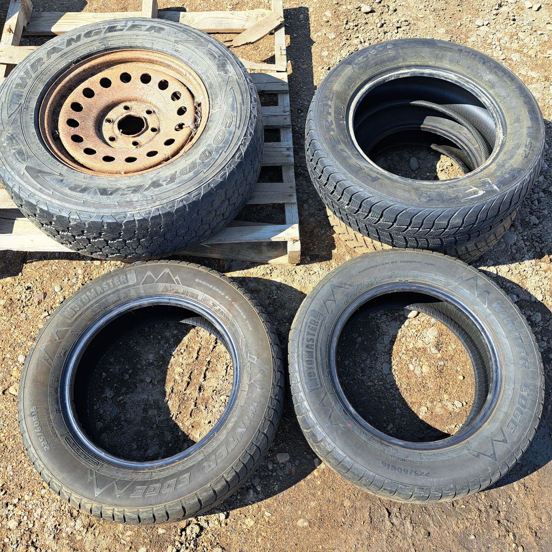 4 tires- 1 size205/75R14-3 size- 225/60R16 and a tire with rim- size P 255/70R17- the names vary