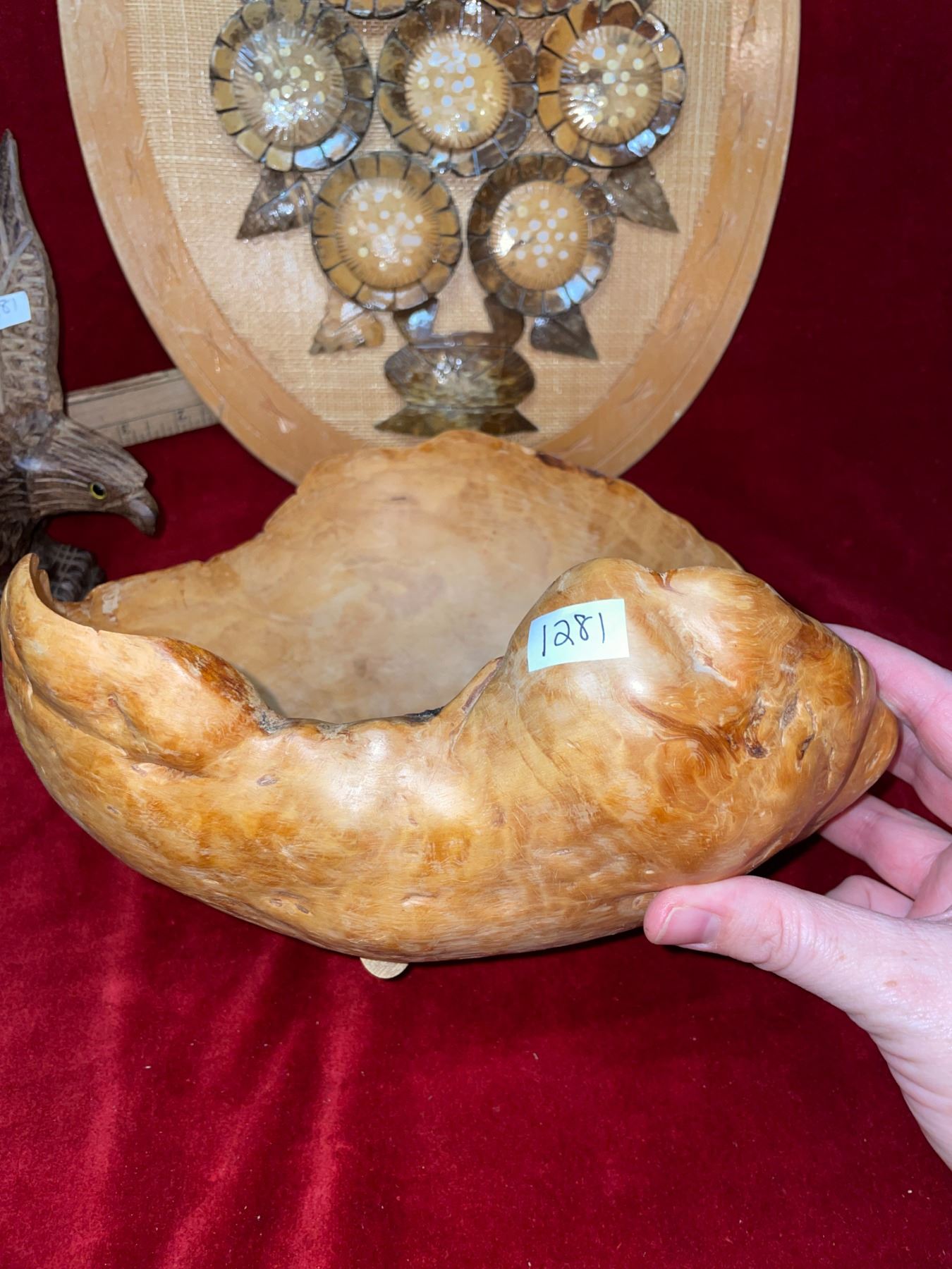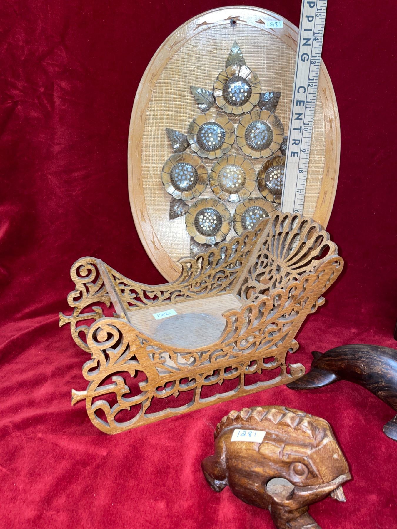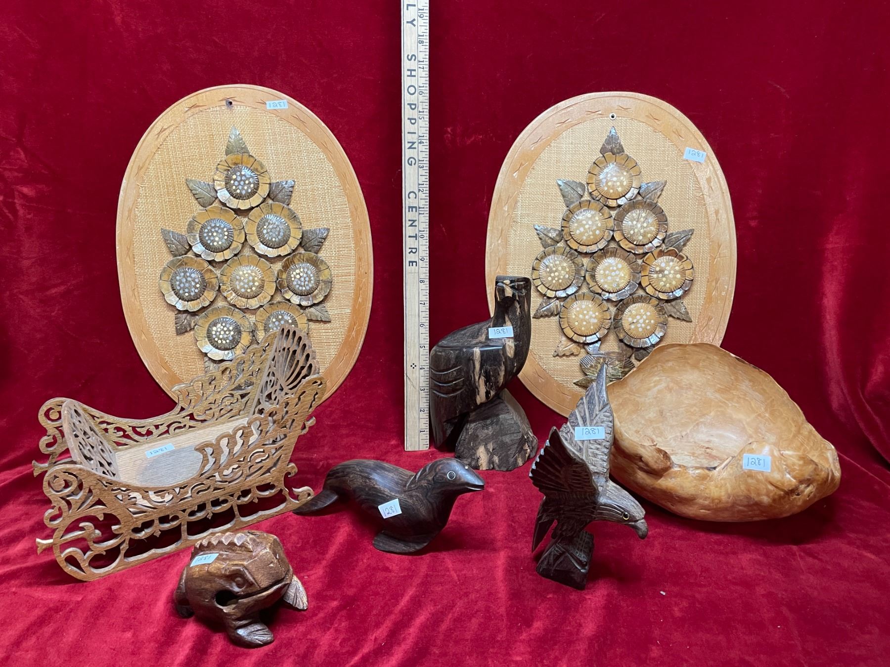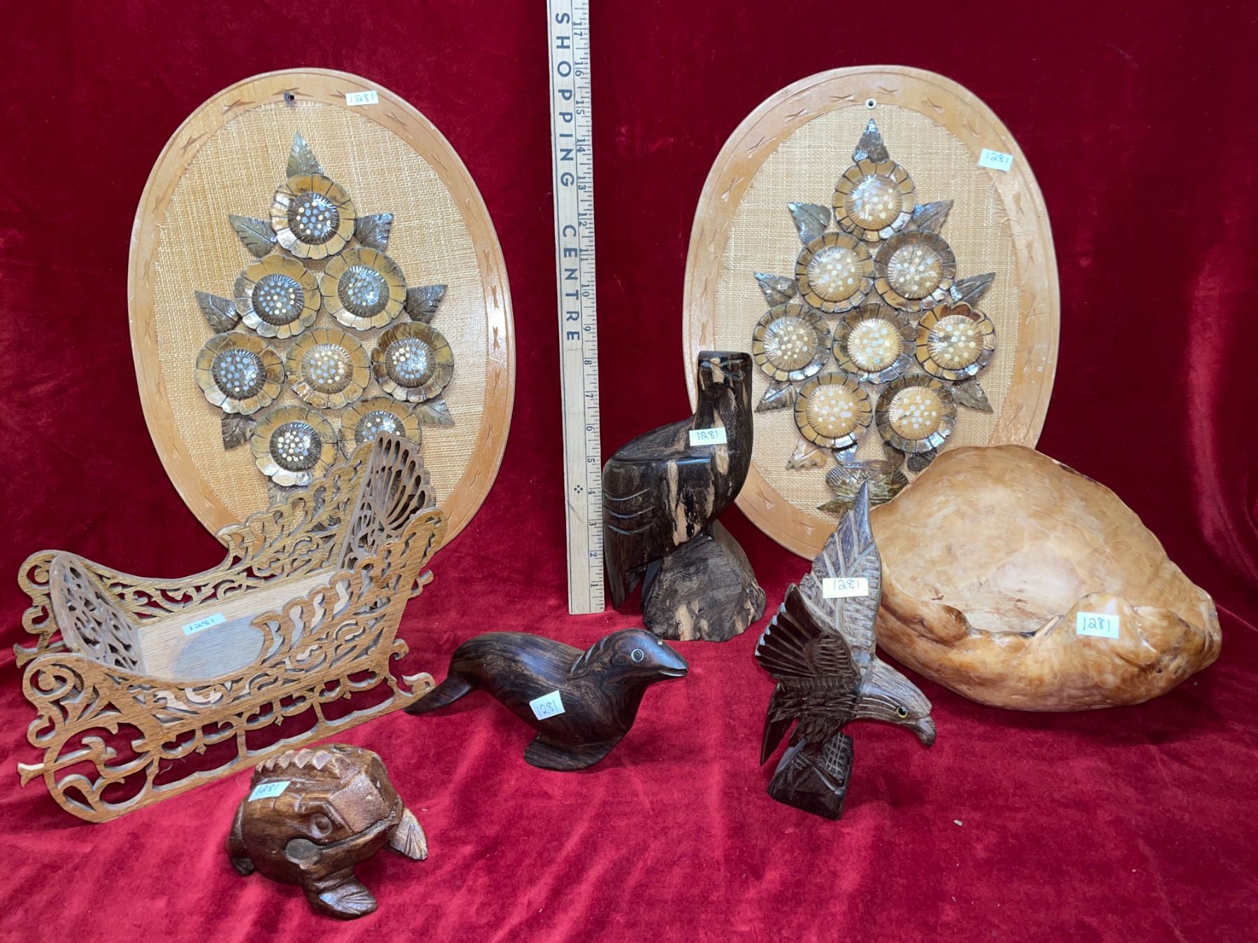 4 wood carved animal, hand-crafted pieces. Includes 2 eagles, 1 seal and 1 frog. Also has wood, scroll work sleigh, leaf wreath, and hand carved, floral patterned plate, and 1 bowl. 2 wall hangings made with coconut shells.