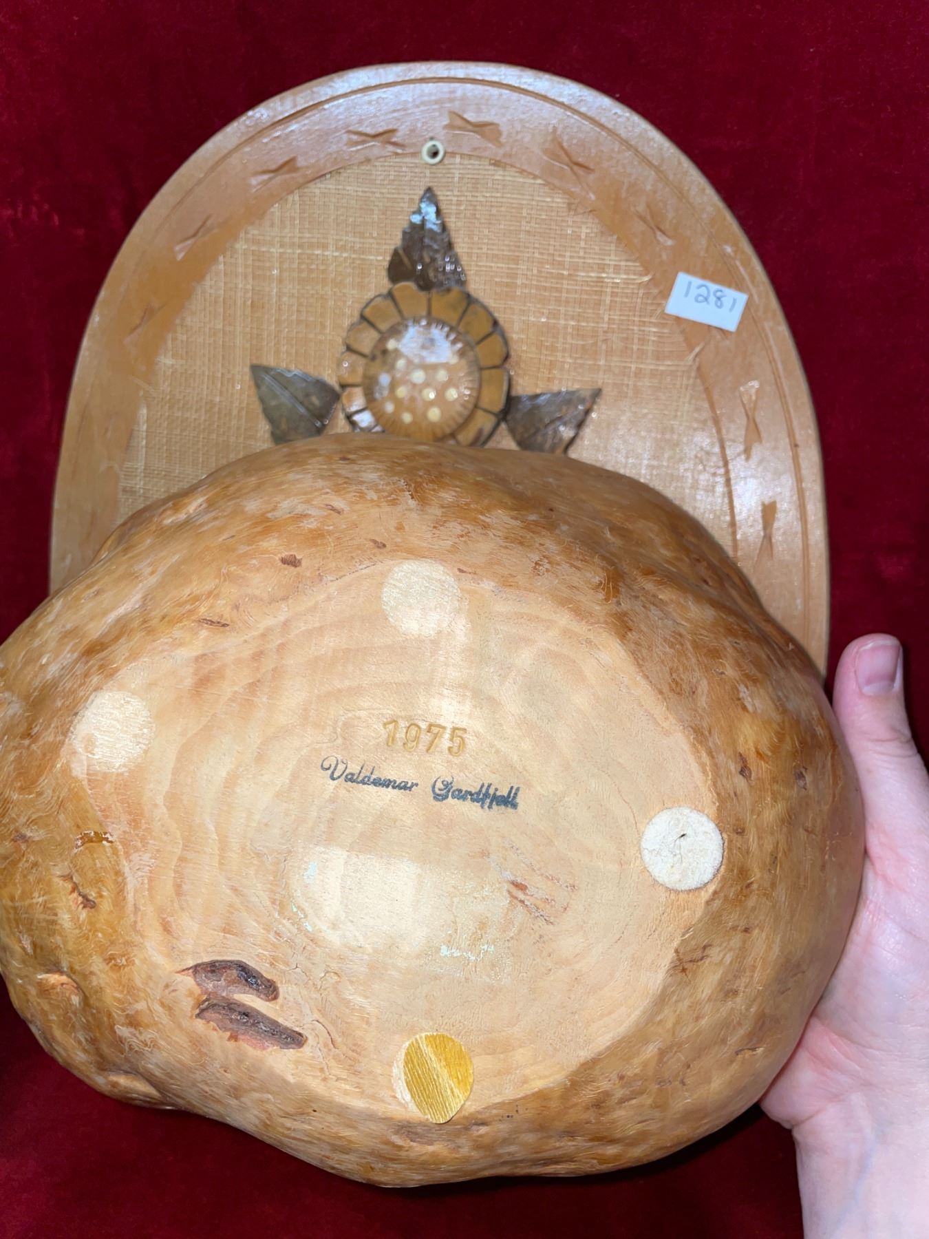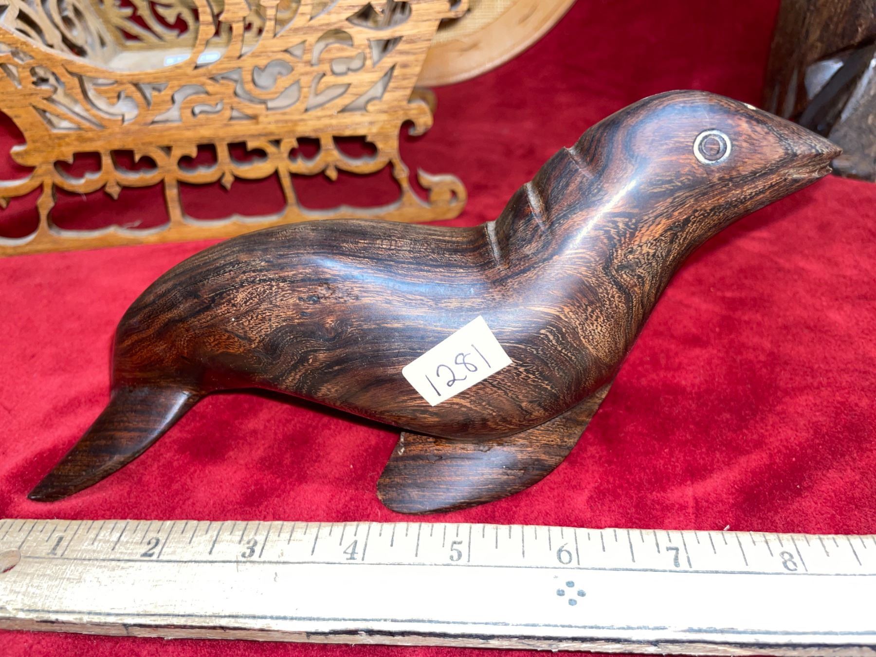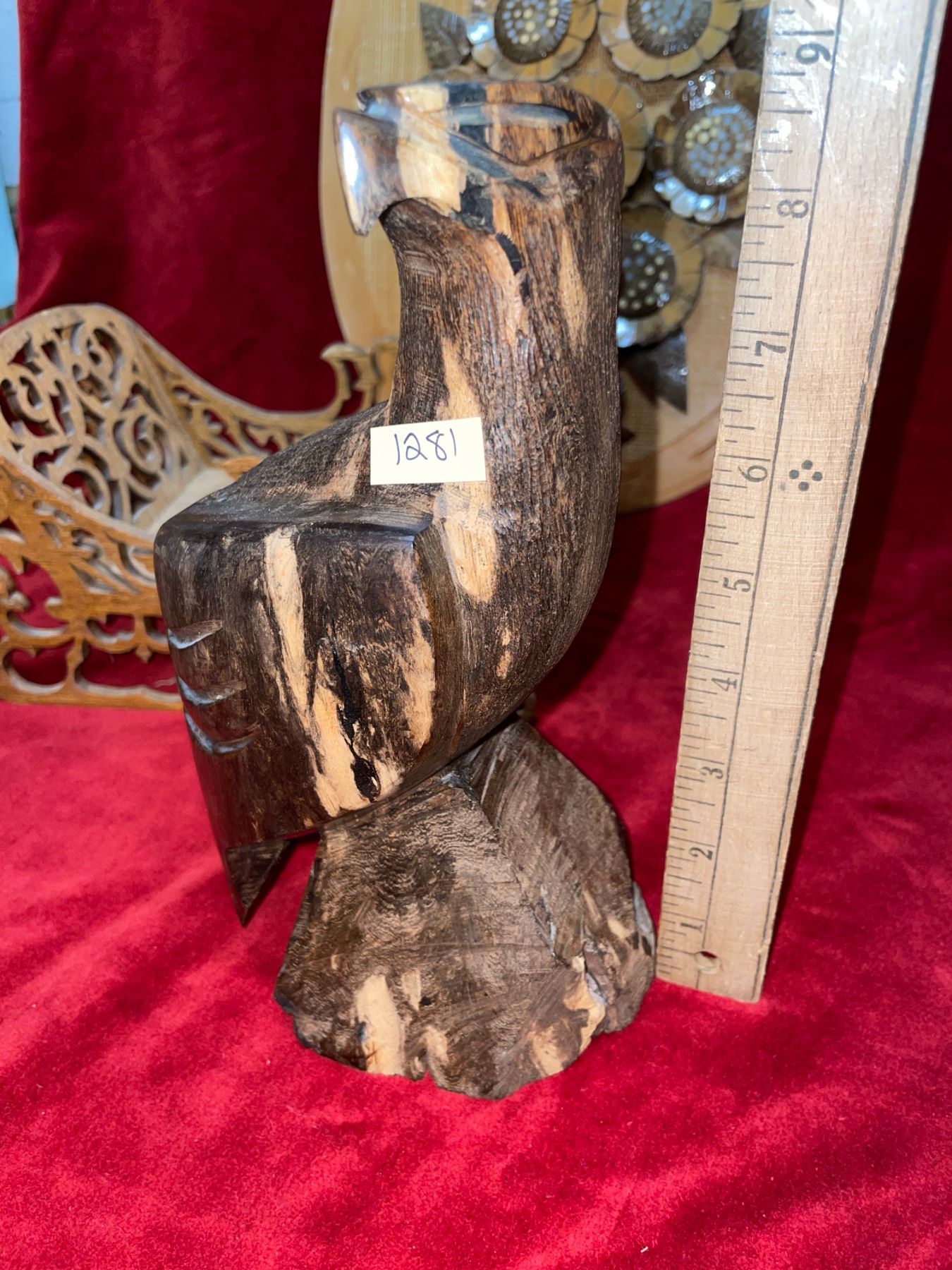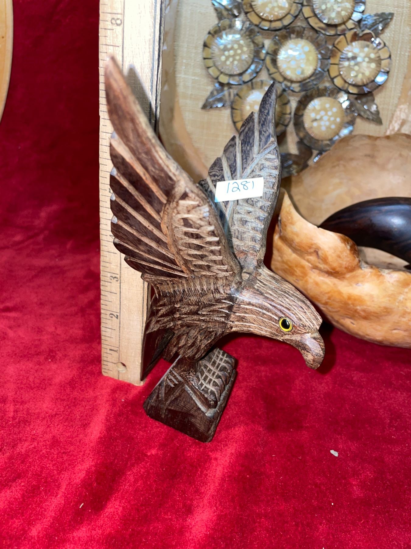 4 wood carved animal, hand-crafted pieces. Includes 2 eagles, 1 seal and 1 frog. Also has wood, scroll work sleigh, leaf wreath, and hand carved, floral patterned plate, and 1 bowl. 2 wall hangings made with coconut shells.