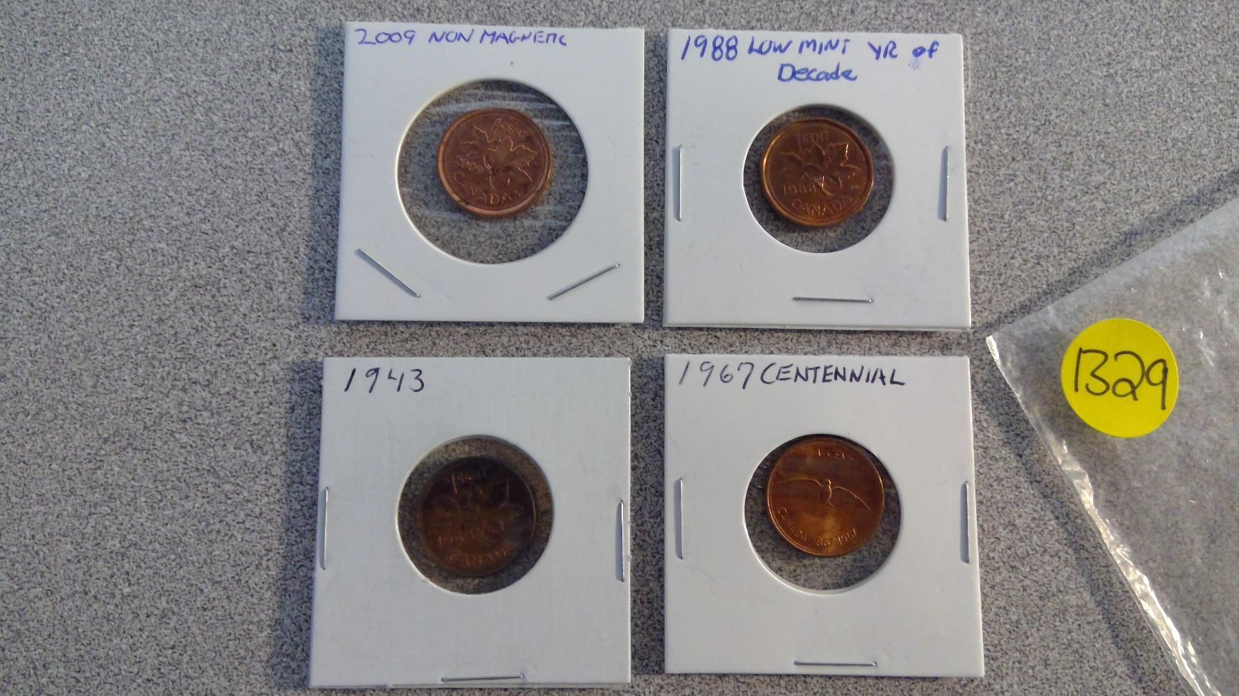 4 x Canadian Pennies (1943; 1967 cent.; 1988 low mint; 2009 zinc)