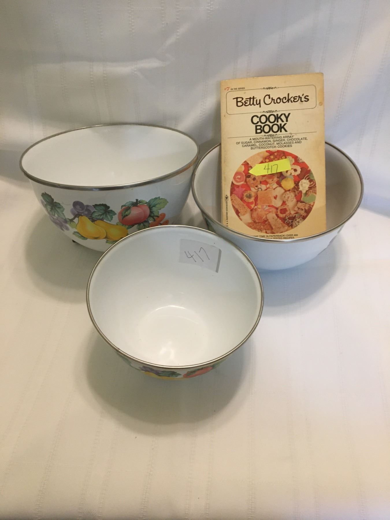 417-BETTY CROCKER COOKBOOK 1975 / 3 ENAMEL FRUIT BOWLS