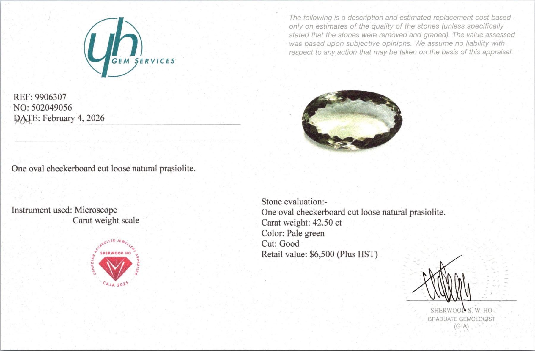 42.5 ct Certified Signature Prasiolite gemstone (Green Amethyst) ($6,500 Appraisal)