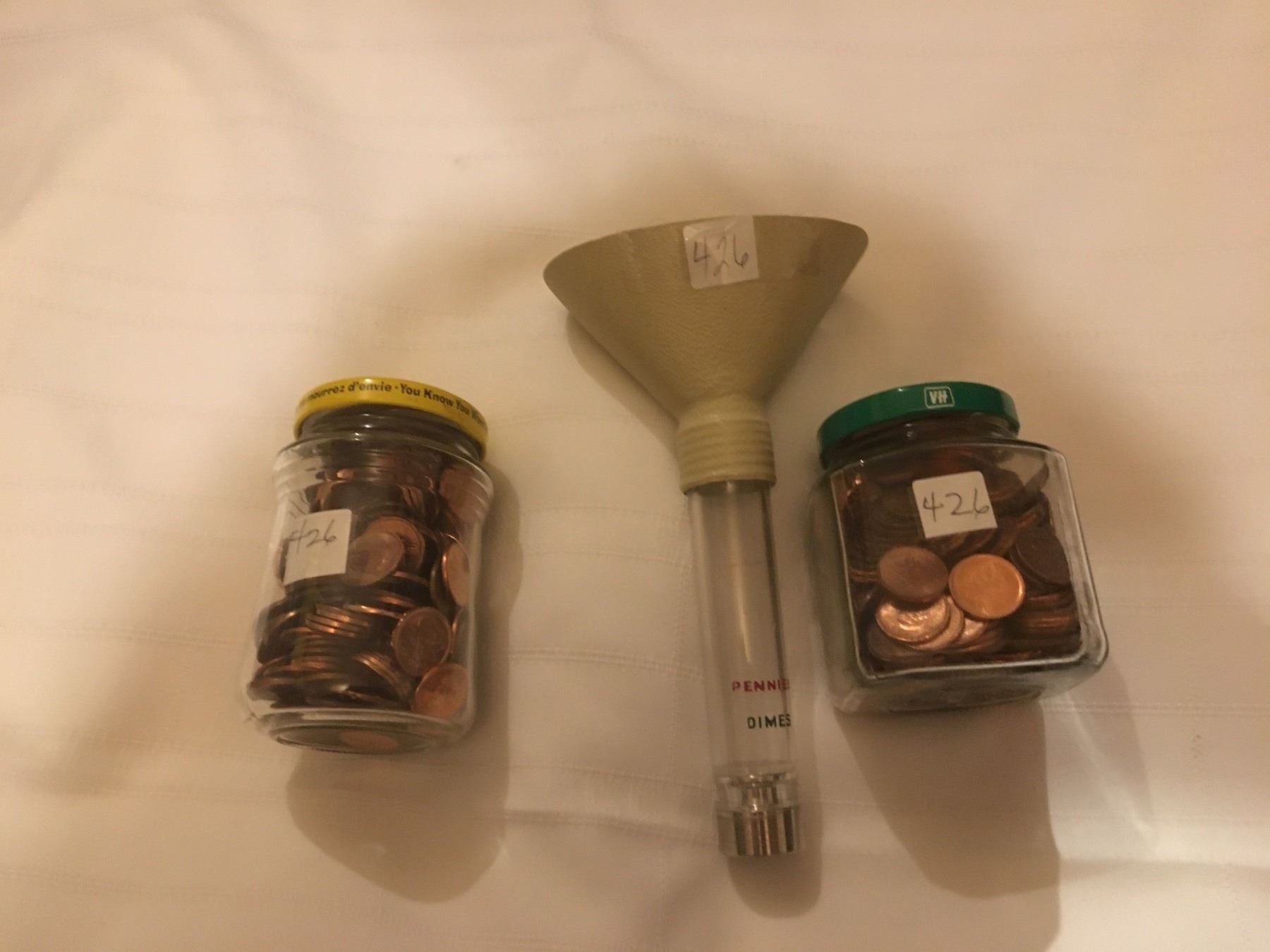 426-VINTAGE PENNY/DIME SORTER AND PENNIES IN JAR