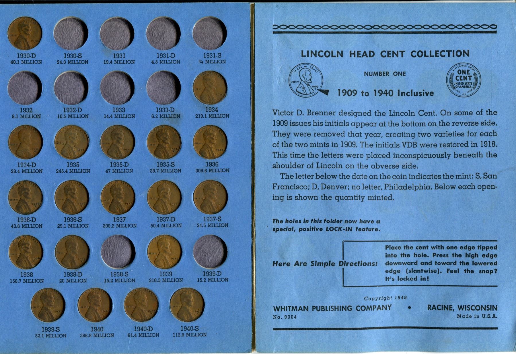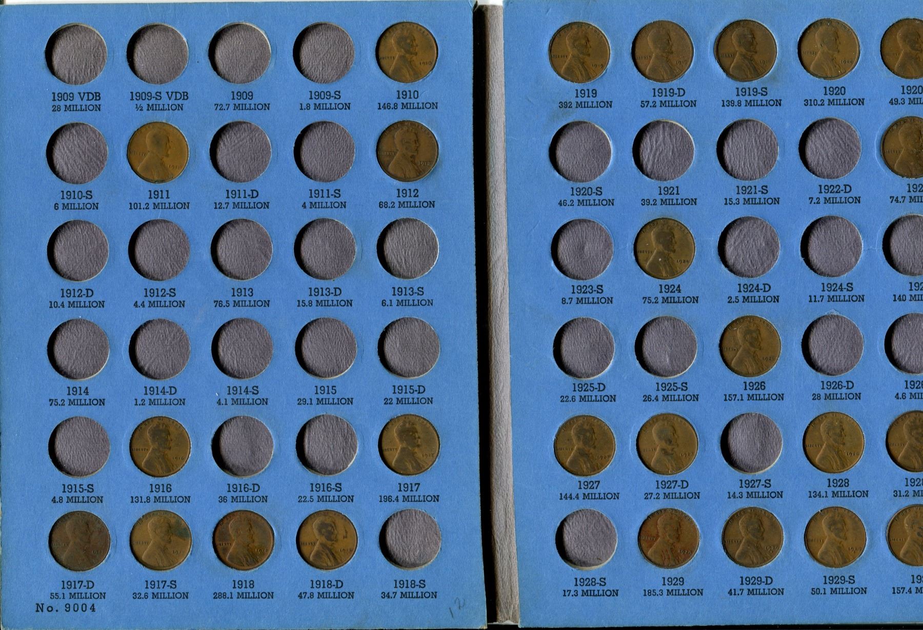 44 U.S. Lincoln Wheat Cents 1910 to 1940S. Housed in a blue Whitman folder.