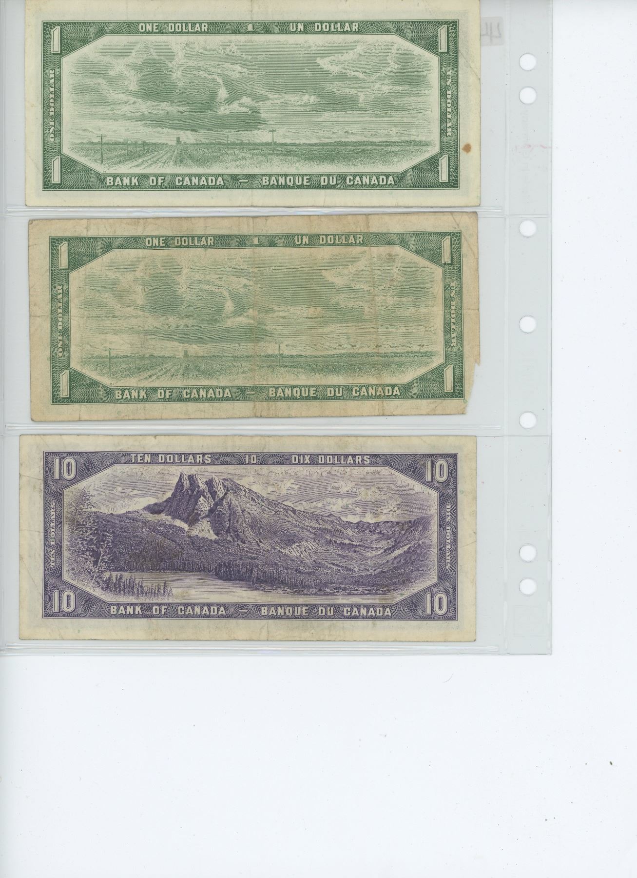 3-bills, 2-1954 one dollar replacement notes, 1-1954 ten dollar bill ($12.00 face),3-Canadian bills