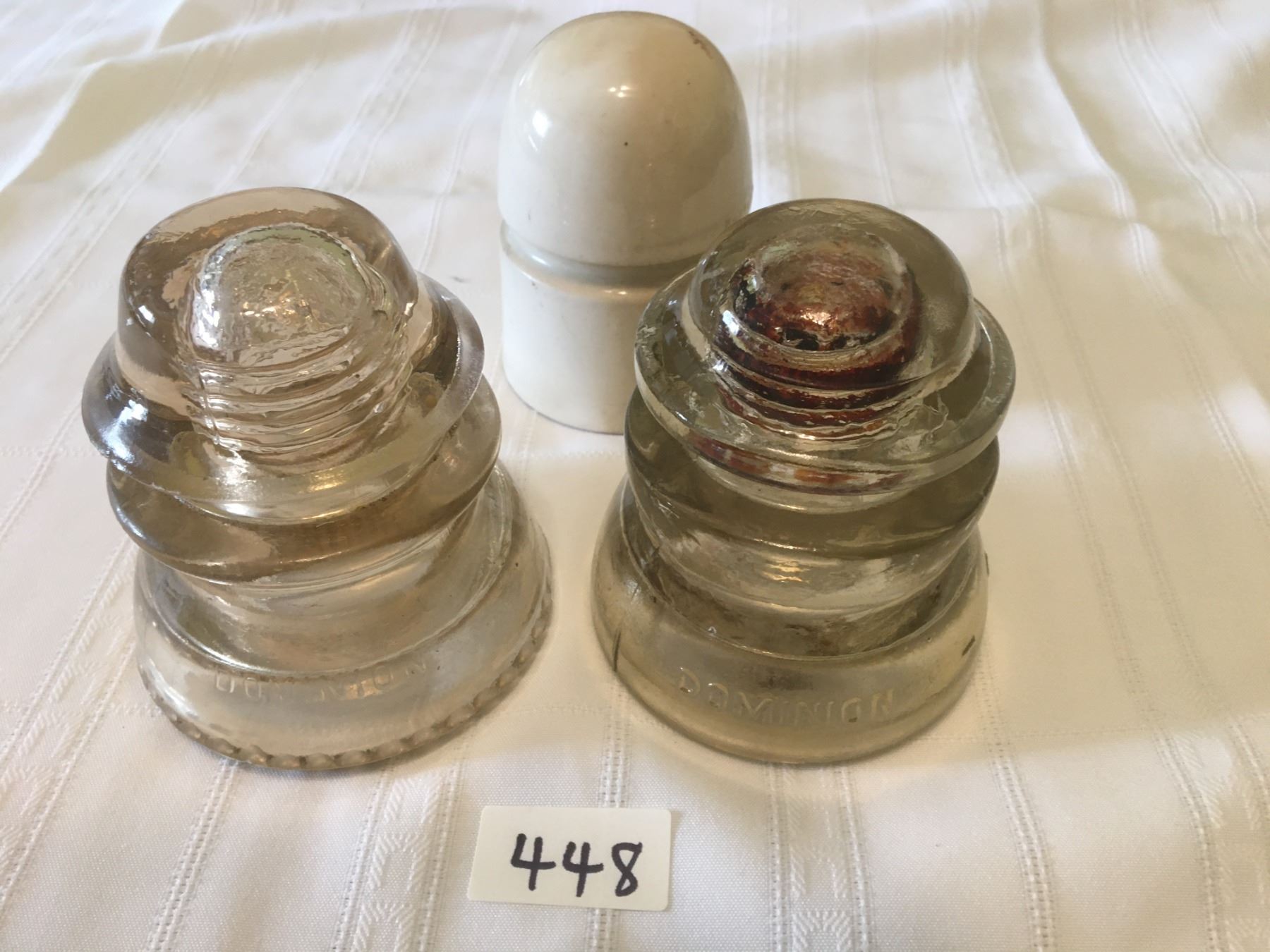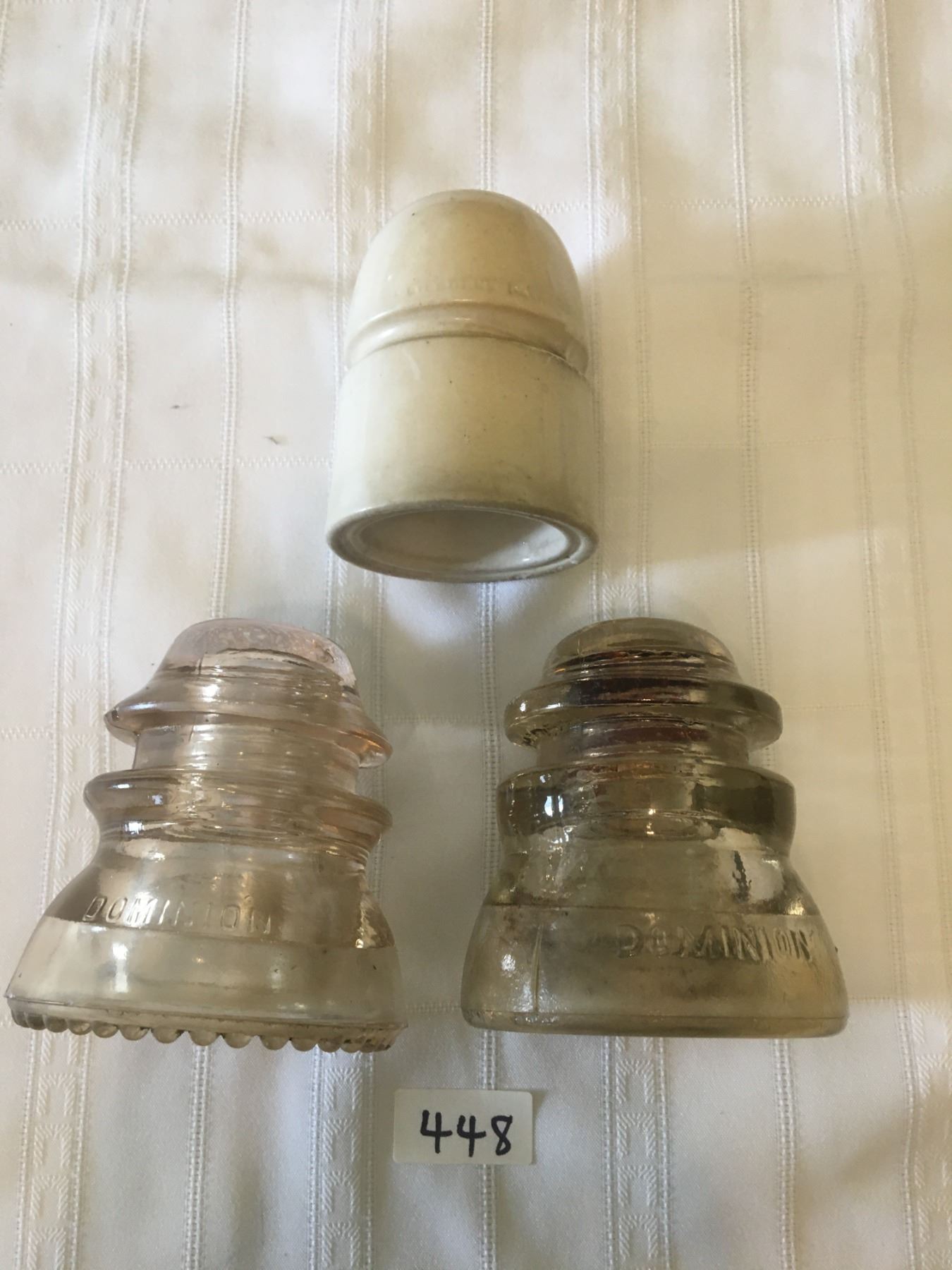 448- POWER INSULATORS LOT OF 3 DOMINION/GLASS MARKED 10D, PORCELAIN GISBORNE PATTERN