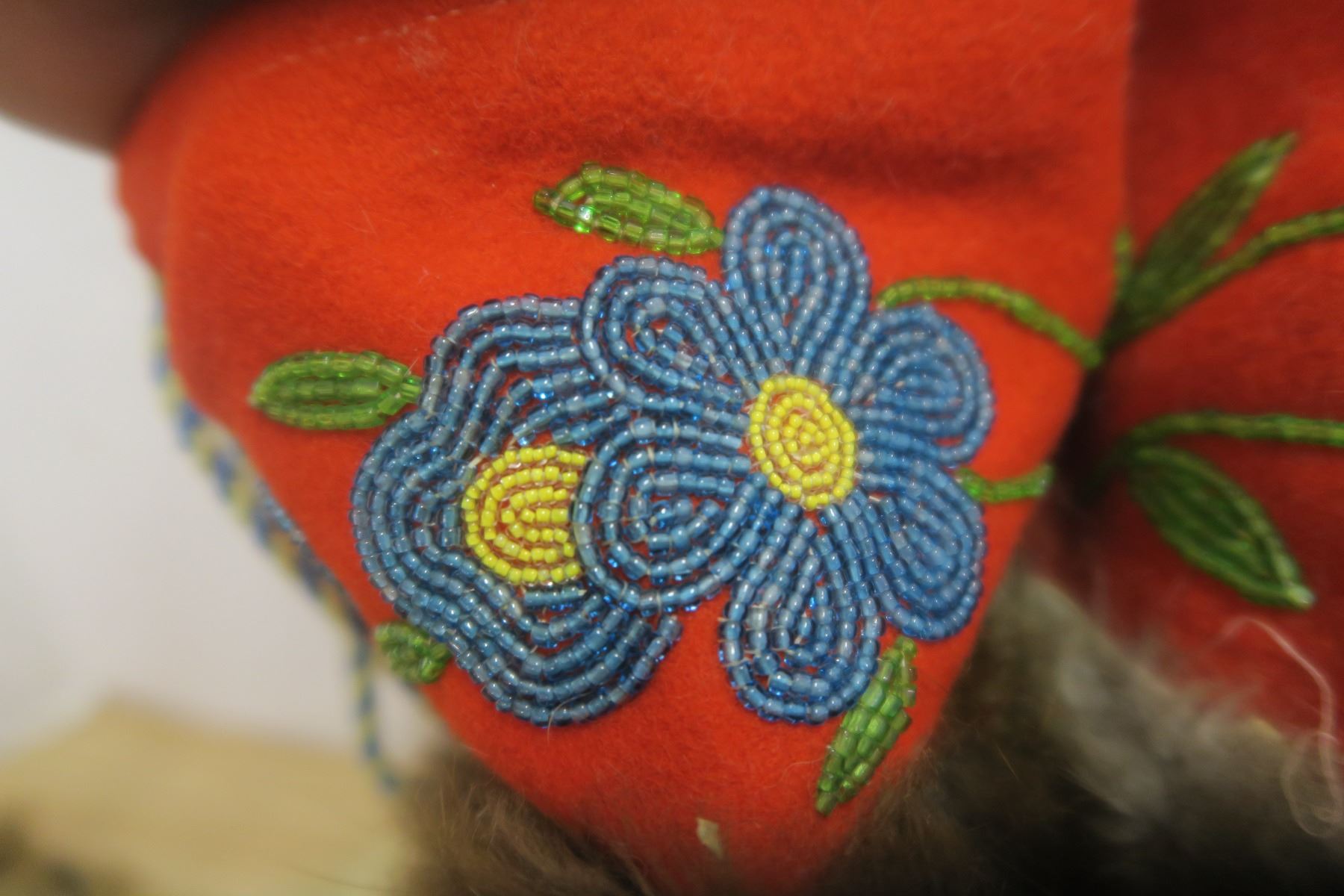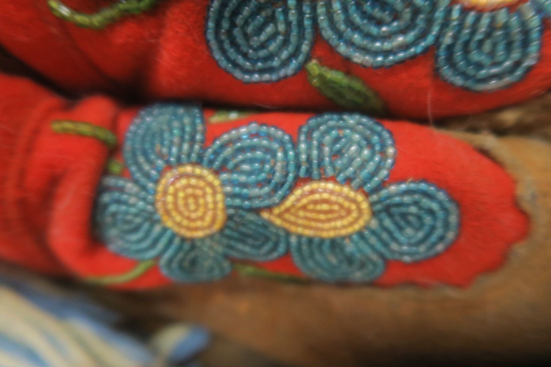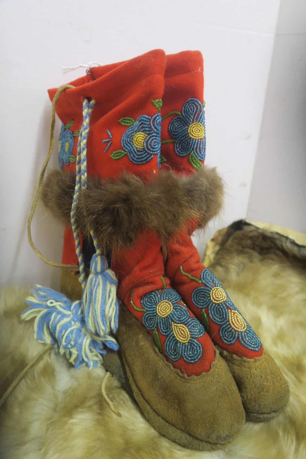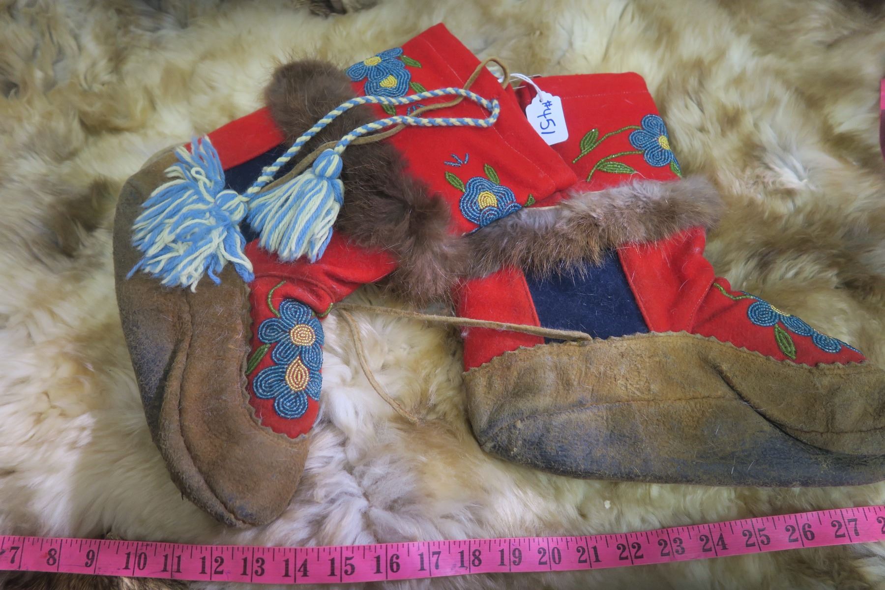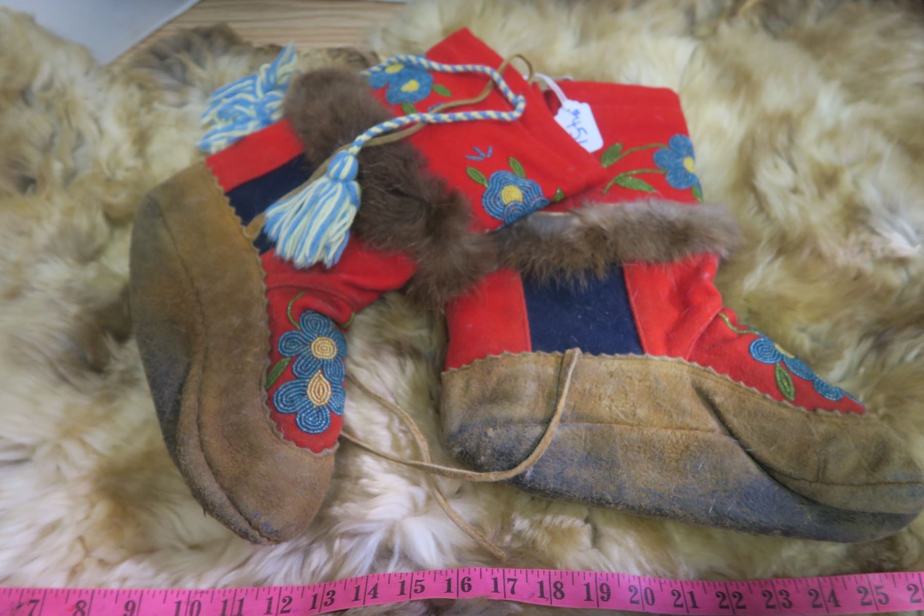 451. Pair of mukluks, beaded leather, felt and fur, 11” heel to toe